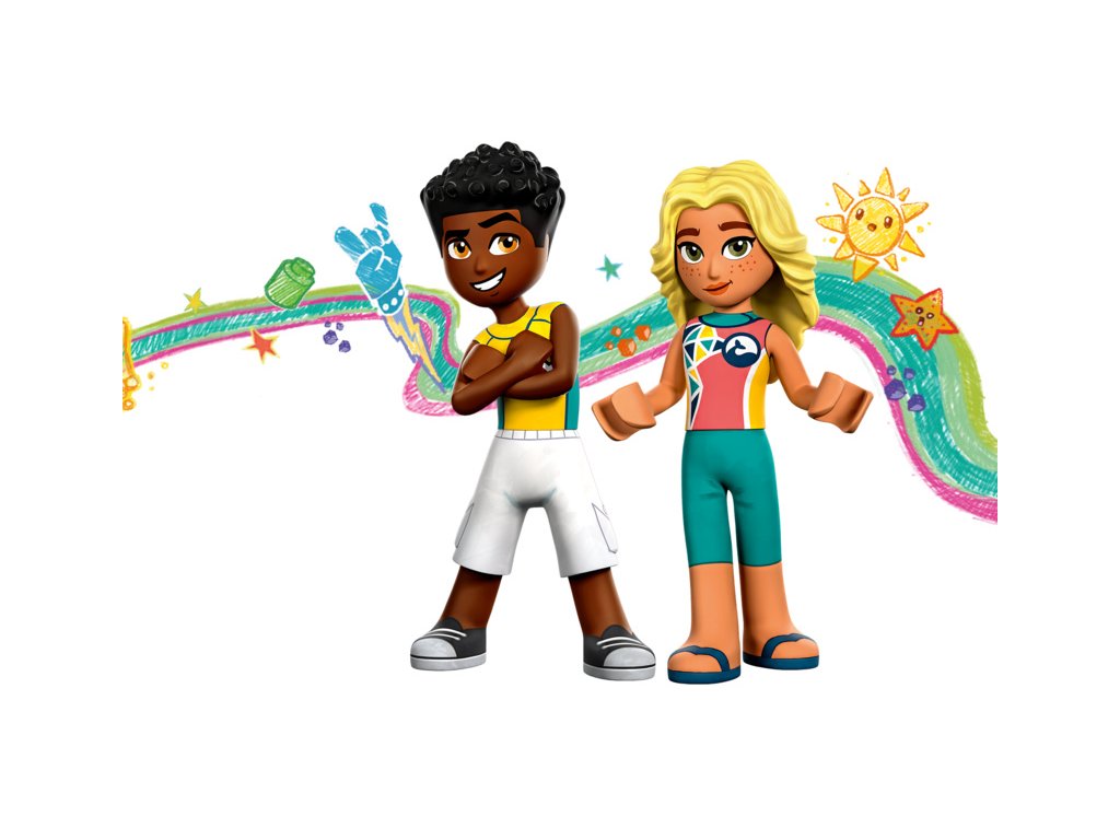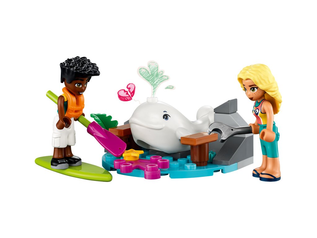 - 2 postavy a doplňky – Ve stavebnici najdete postavy LEGO® Friends Zaca a jeho učitelku Diu. Součástí je také běluha, kterou děti zachrání z hromady dřeva a kamení na pobřeží