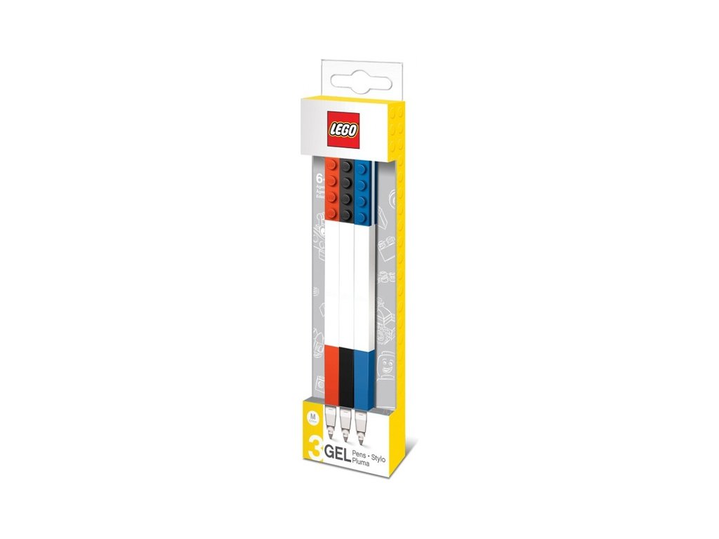 Trojice LEGO gelových per různých barev (červená, modrá, černá). Součástí pera jsou 2 proužky LEGO destičky pro spojení např. s LEGO pouzdrem, minifigurkou, jiným perem nebo k nacvaknutí na LEGO pravítko.