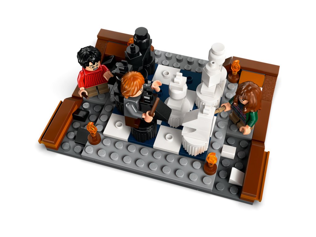 - Stavebnice hradu – Místnosti s okřídlenými klíči a kouzelnickými šachy ve skalních základech hradu lze odejmout pro snadné hraní a součástí je také 6 ze 14 sběratelských bradavických portrétů