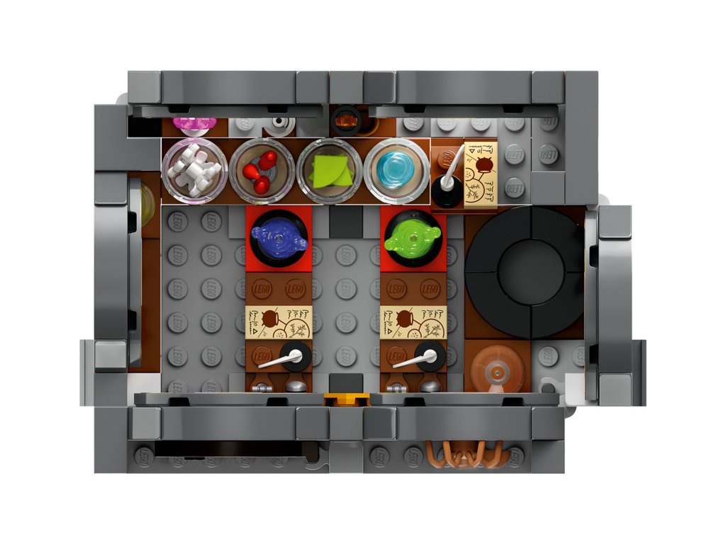 - Autentická učebna Harryho Pottera™ – Učebnu lze otevřít pro snadný přístup dovnitř a součástí je celá řada doplňků. Prohlédněte si tabuli a lahvičky s přísadami a v kotlíku smíchejte lektvary