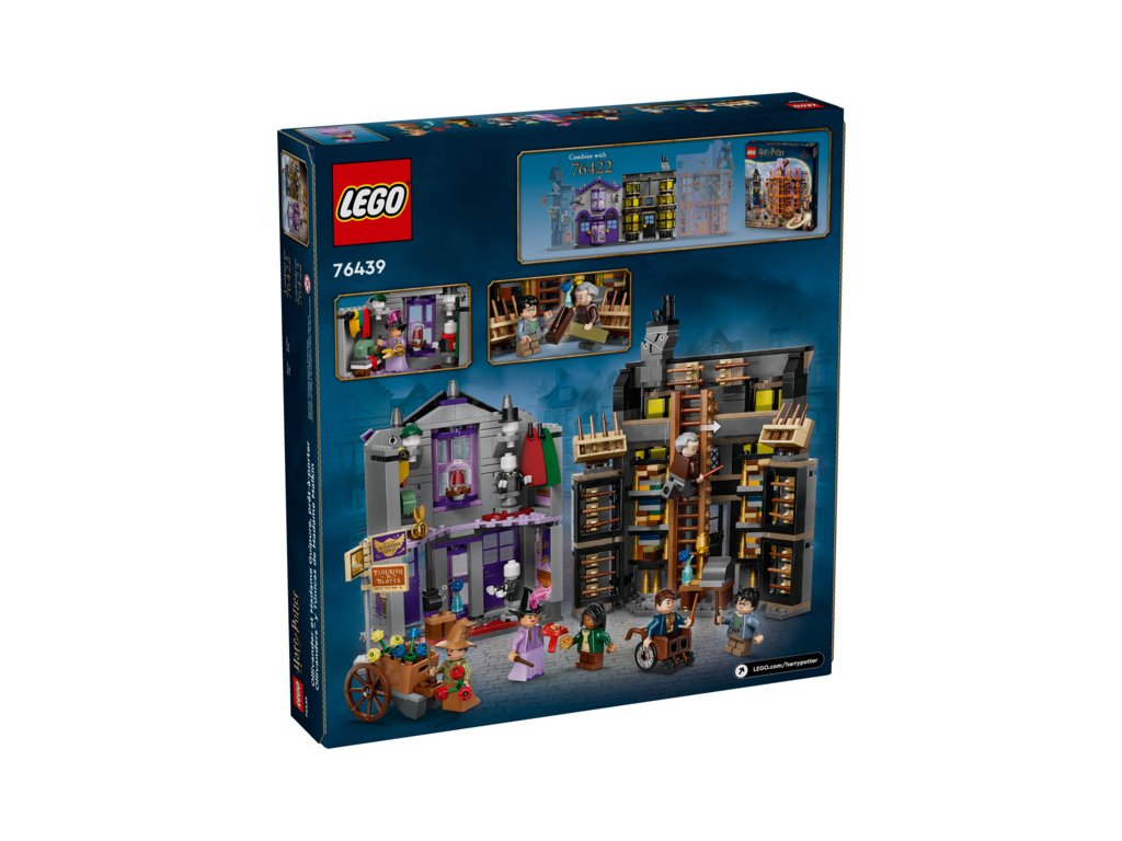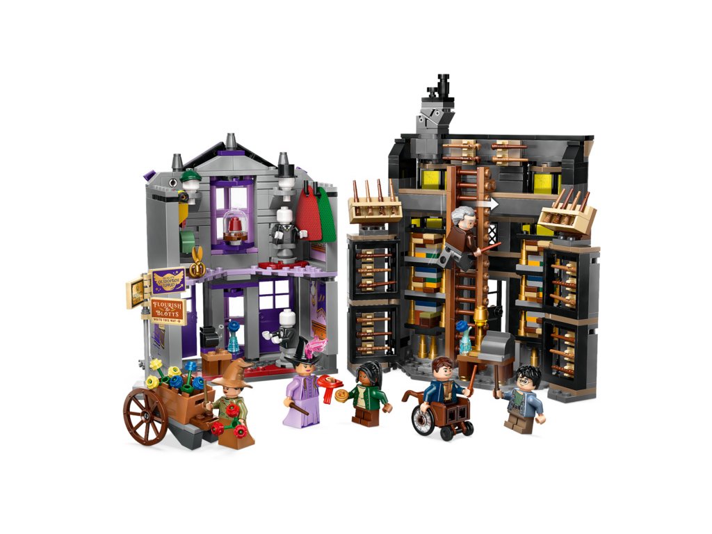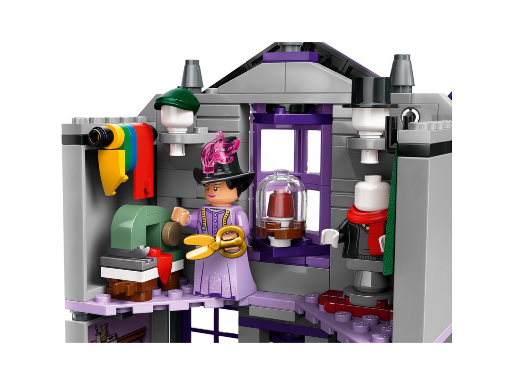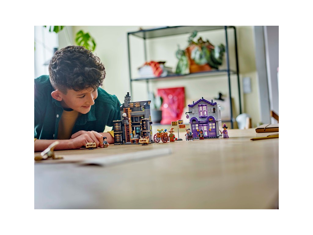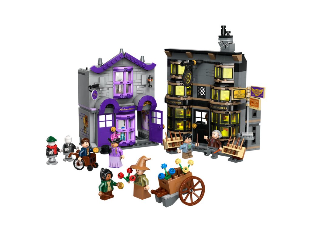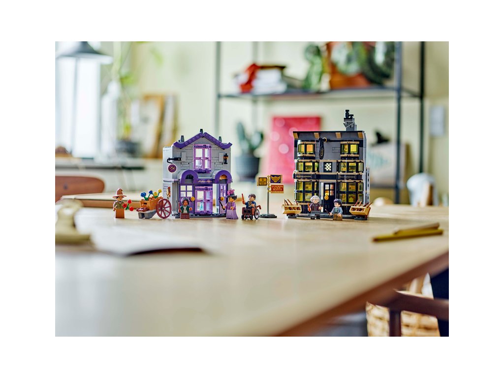 - 2 obchody z Příčné ulice – Tato stavebnice představuje zábavný dárek pro fanoušky Harryho Pottera a součástí je detailně zpracovaný model Ollivanderova obchodu a Obchodu madame Malkinové pro kouzelné hraní