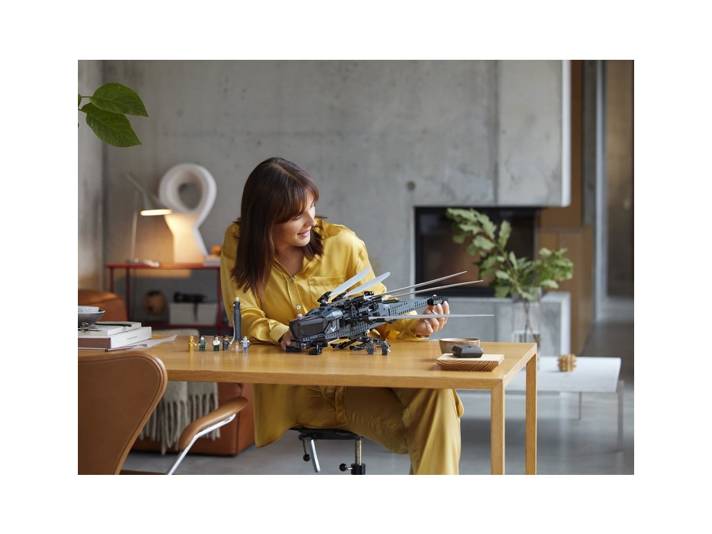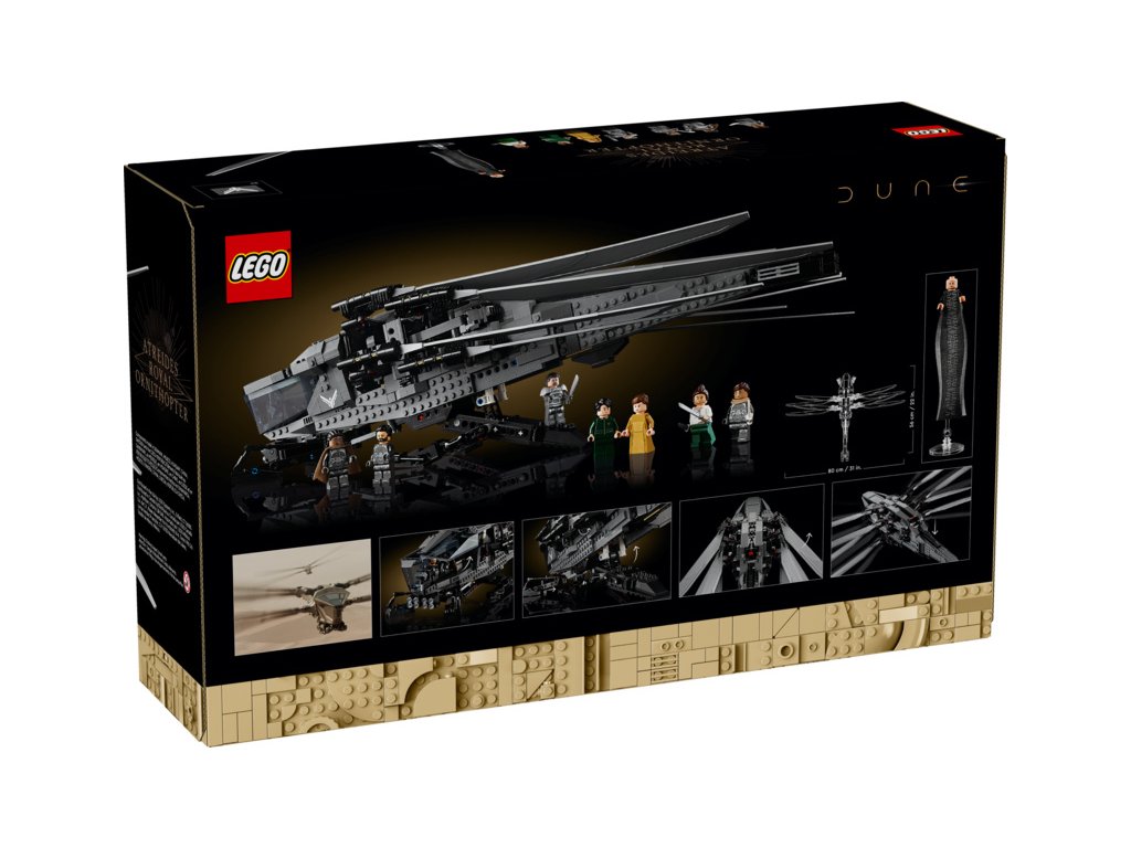 - Co najdete v krabici – Vše, co potřebujete k sestavení repliky ornitoptéry Atreides Royal Ornithopher s vyklápěcími mávajícími křídly a zatahovacím podvozkem z kostek LEGO® a 8 minifigurek filmových postav