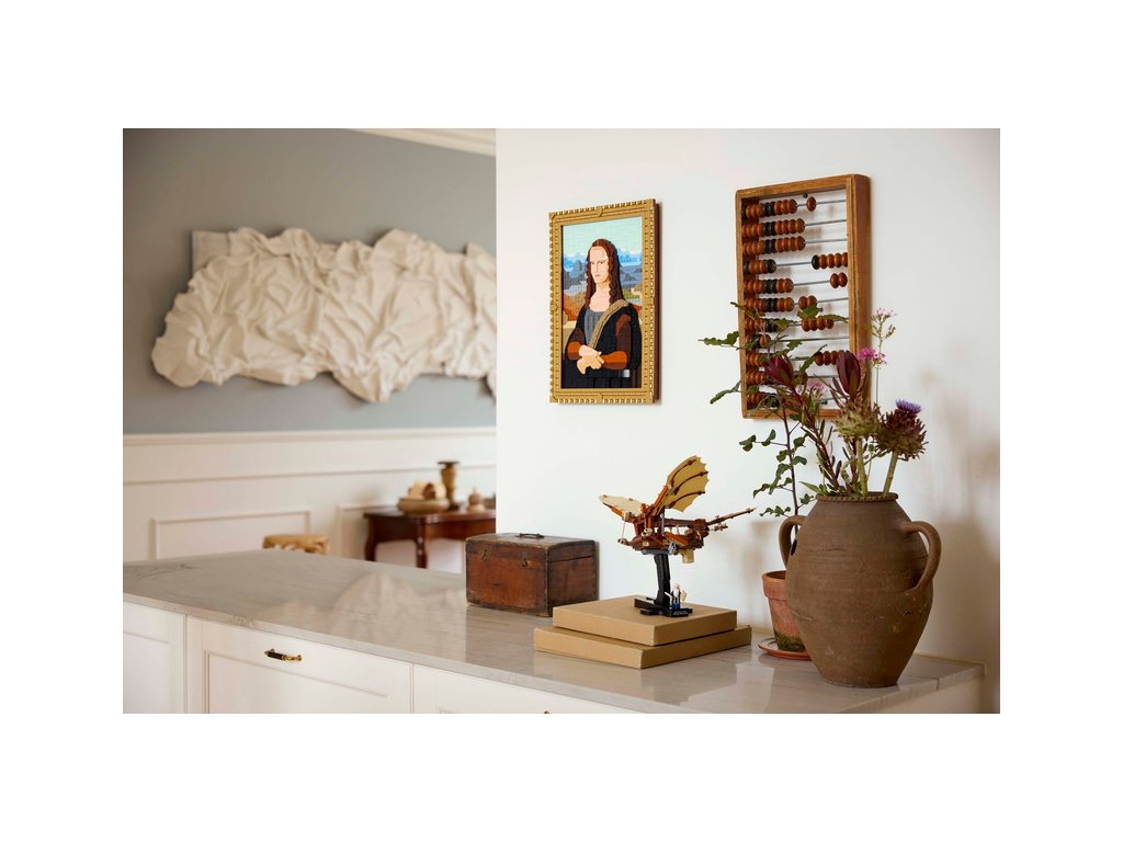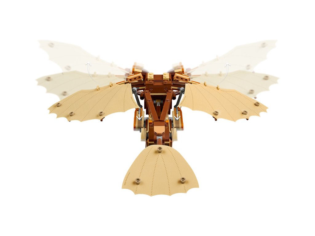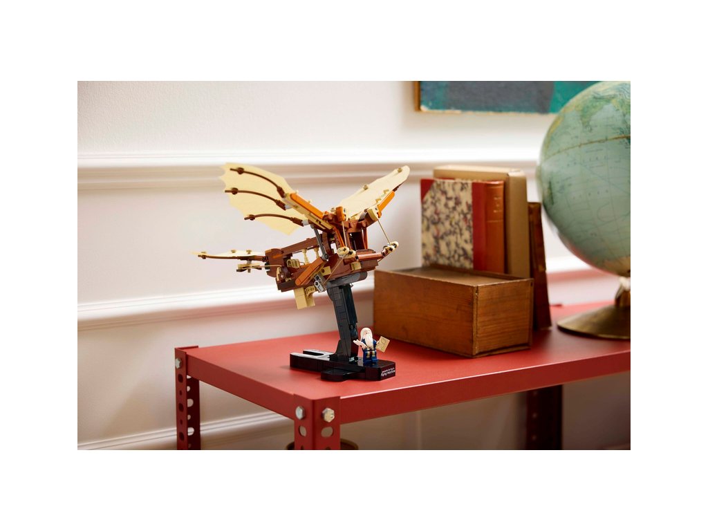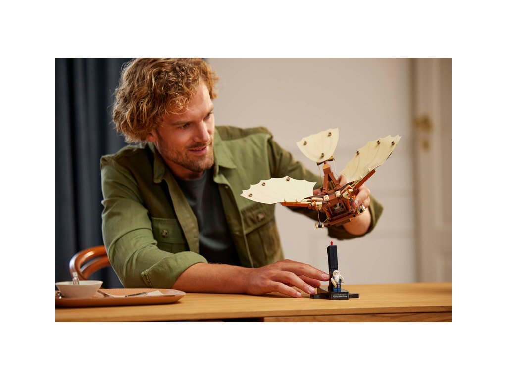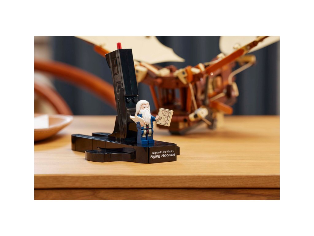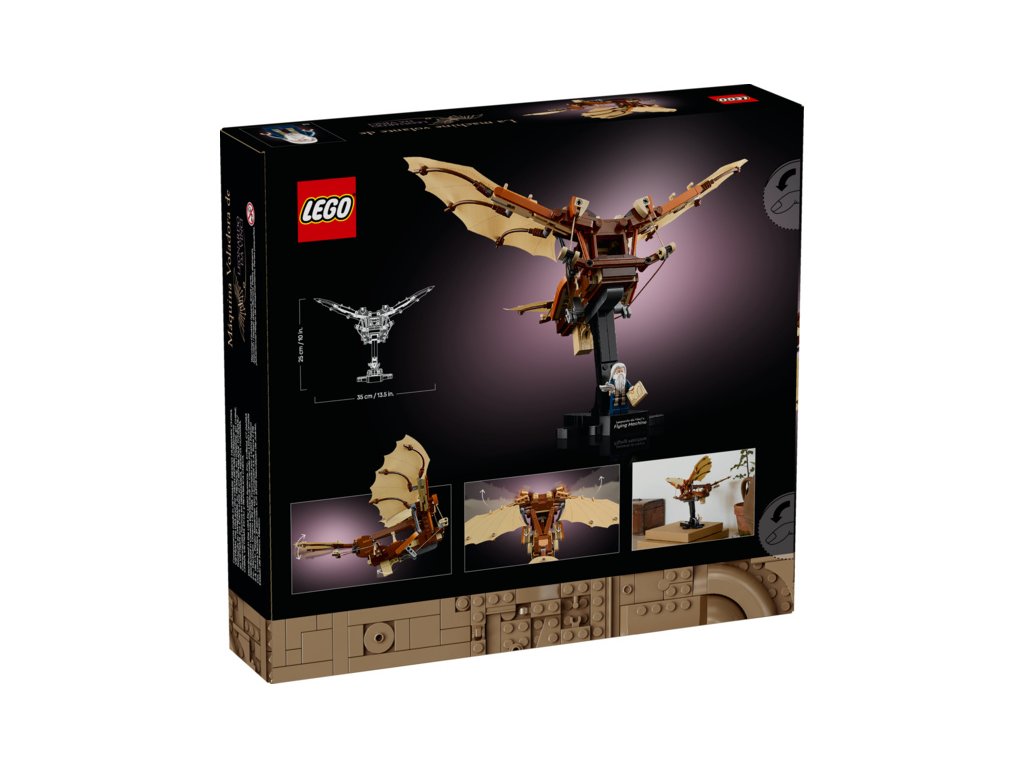 - Co najdete v krabici – Vše, co potřebujete k sestavení propracované verze LEGO da Vinciho vizionářské ornitoptéry, podstavec na vystavení a minifigurku Leonarda da Vinciho, která drží brk a skicu