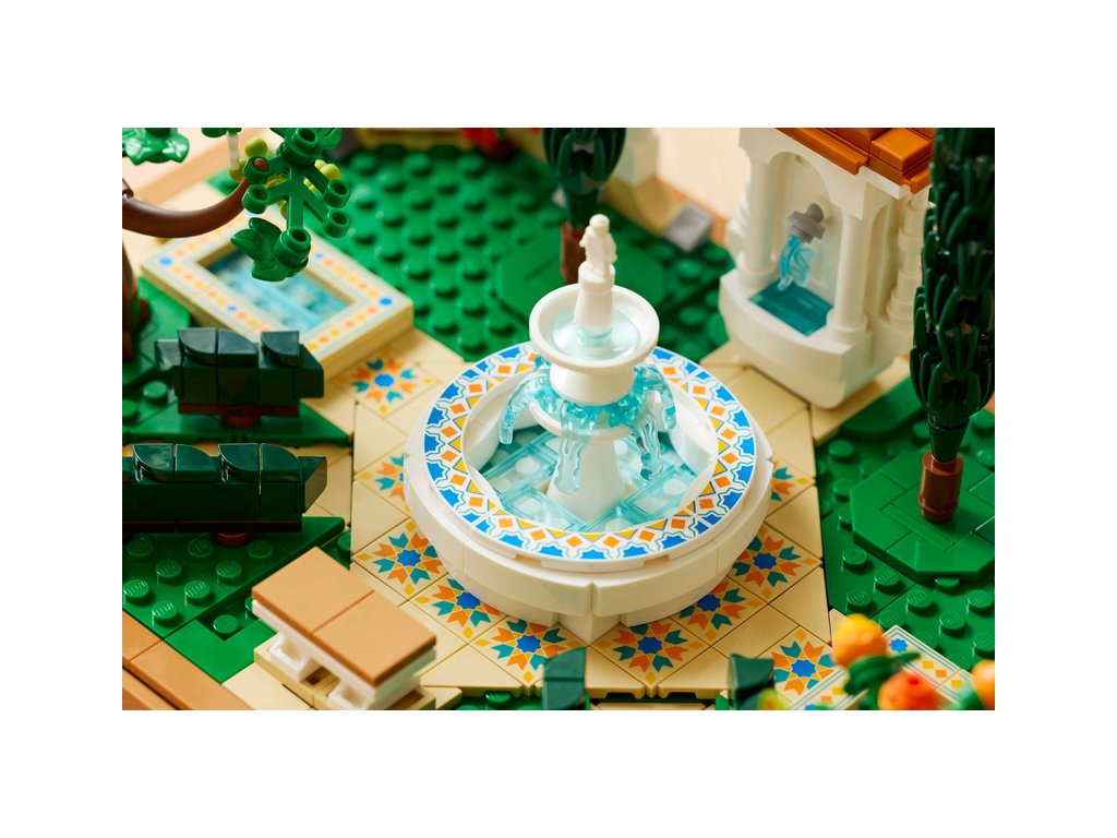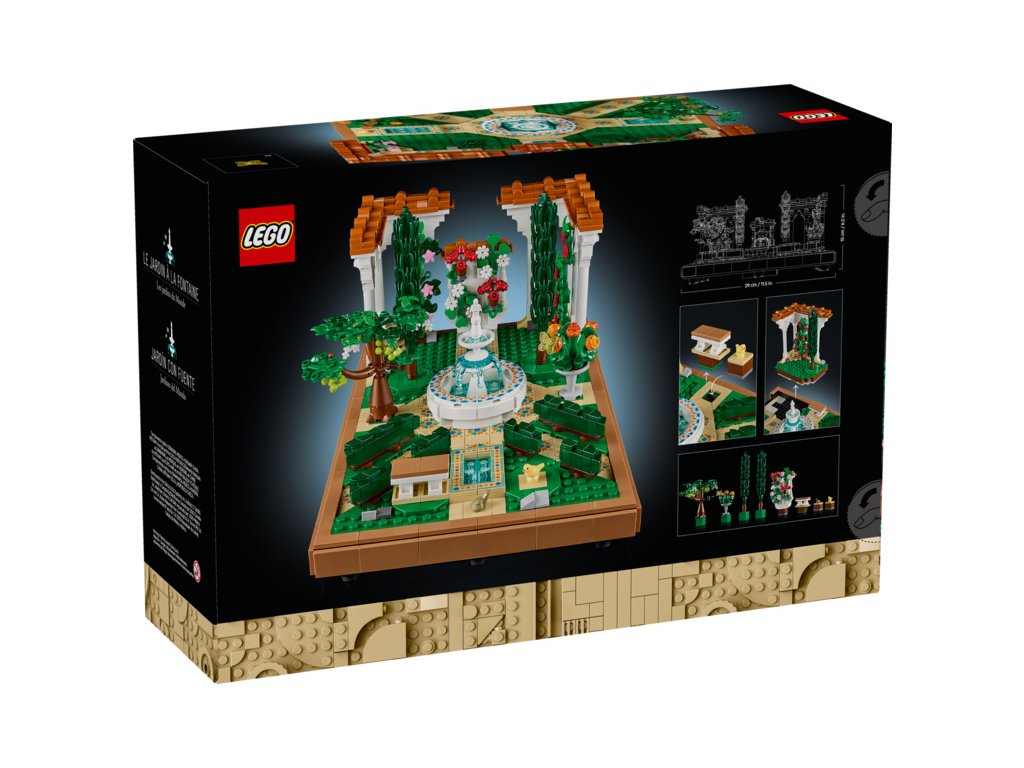 - Co najdete v krabici – LEGO® Zahrada s fontánou obsahuje stupňovitou fontánu, lavabo, 2 cypřiše, kvetoucí vinnou révu, 4 pergoly a dlážděné cestičky a figurku můry, ptáka a žáby