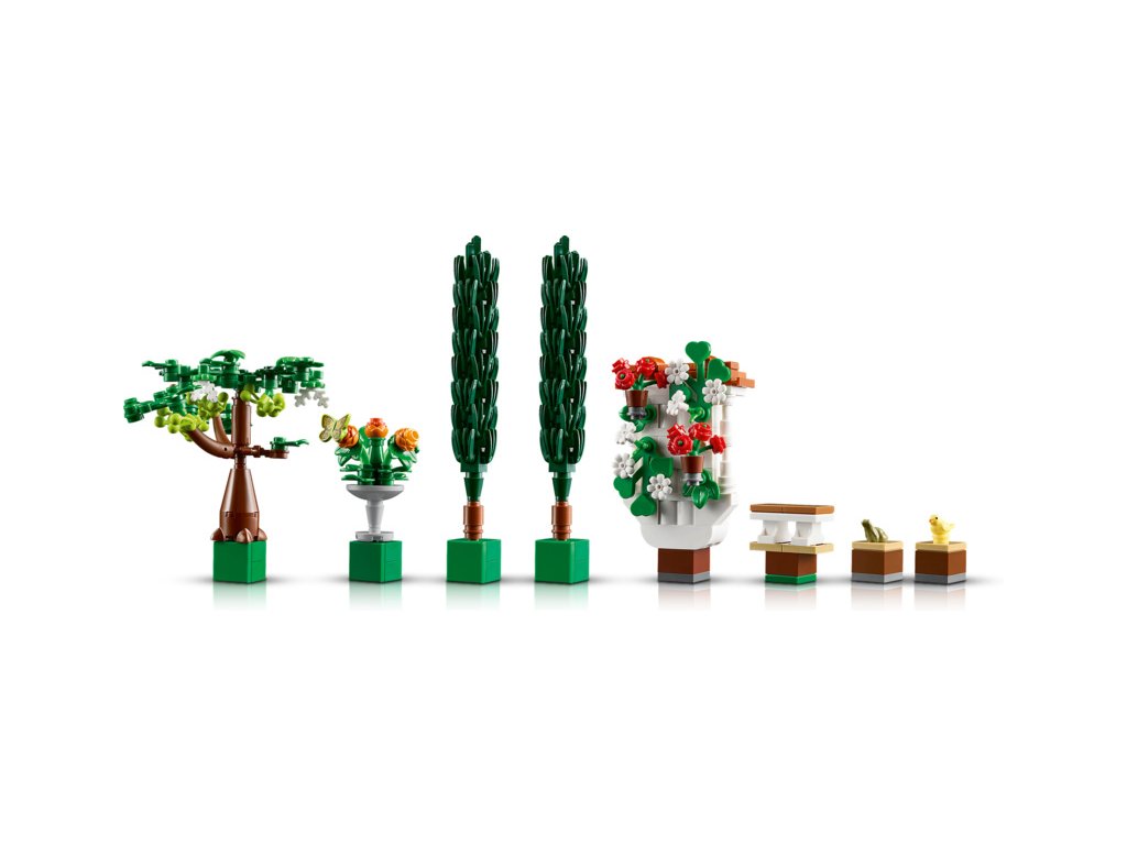 - Rozměry – Stavebnice se skládá z 1302 dílků LEGO® a model zahrady měří přes 15 cm na výšku, 29 cm na šířku a 19 cm do hloubky
