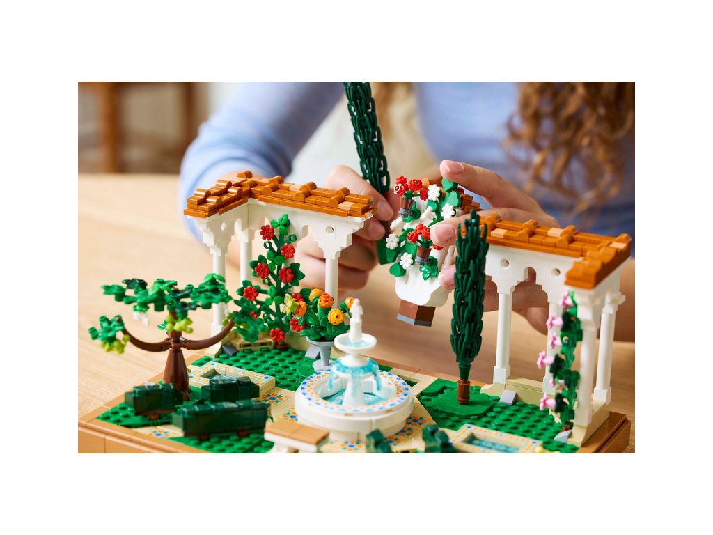 Vychutnejte si stavění propracované stavebnice LEGO® Icons (10359) Zahrada s fontánou pro dospělé, která se skvěle hodí domů i do kanceláře. Odpočiňte si při skládání složitých detailů a uspořádejte stromy, květiny, pergoly i všechny 4 rohy zahrady, abyste dosáhli dokonalého vzhledu.