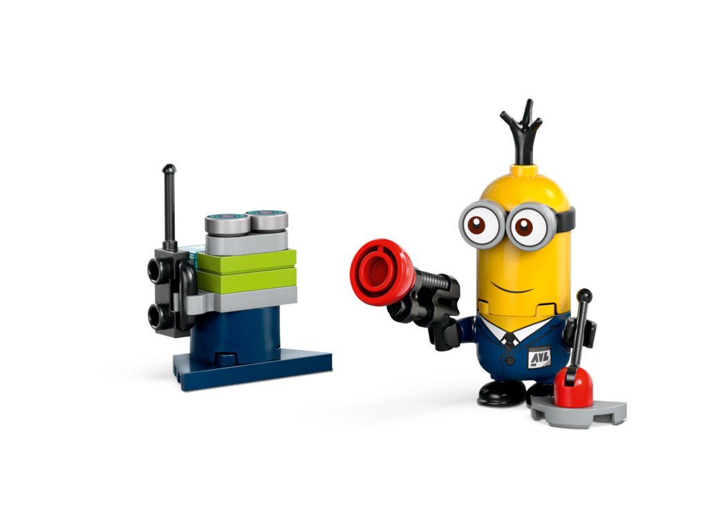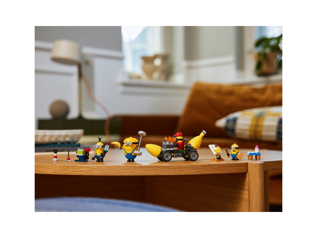 Hledáte stavebnici LEGO s mimoni, autíčkem nebo zábavný dárek? Stavebnice Mimoni a banánové auto se sedadlem pro řidiče a odnímatelným motorem je pro vás to pravé! Součástí jsou 4 mimoni a řada doplňků. Mega mimoň Dave jednou rukou zvedne motor a ve druhé drží činku. Mel maluje obrázek banánu a tajný agent Antipadoušské ligy, mimoň Tim, létá kolem s vrtulí na hlavě a s dálkovým ovladačem v ruce. Na zemi stojí jeho pracovní stanice se speciálními nástroji, včetně rentgenových brýlí. Mechanik mimoň Ron má službu u přebalovacího pultu s plenkami. Nechybí mu potřebné vybavení, včetně zbraně, která vystřeluje použité plenky. Stavitelé mohou přibližovat a otáčet stavebnice v zábavné aplikaci LEGO Builder.