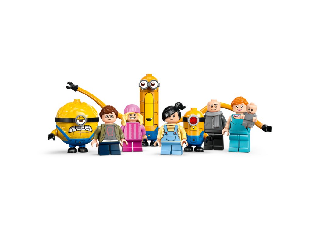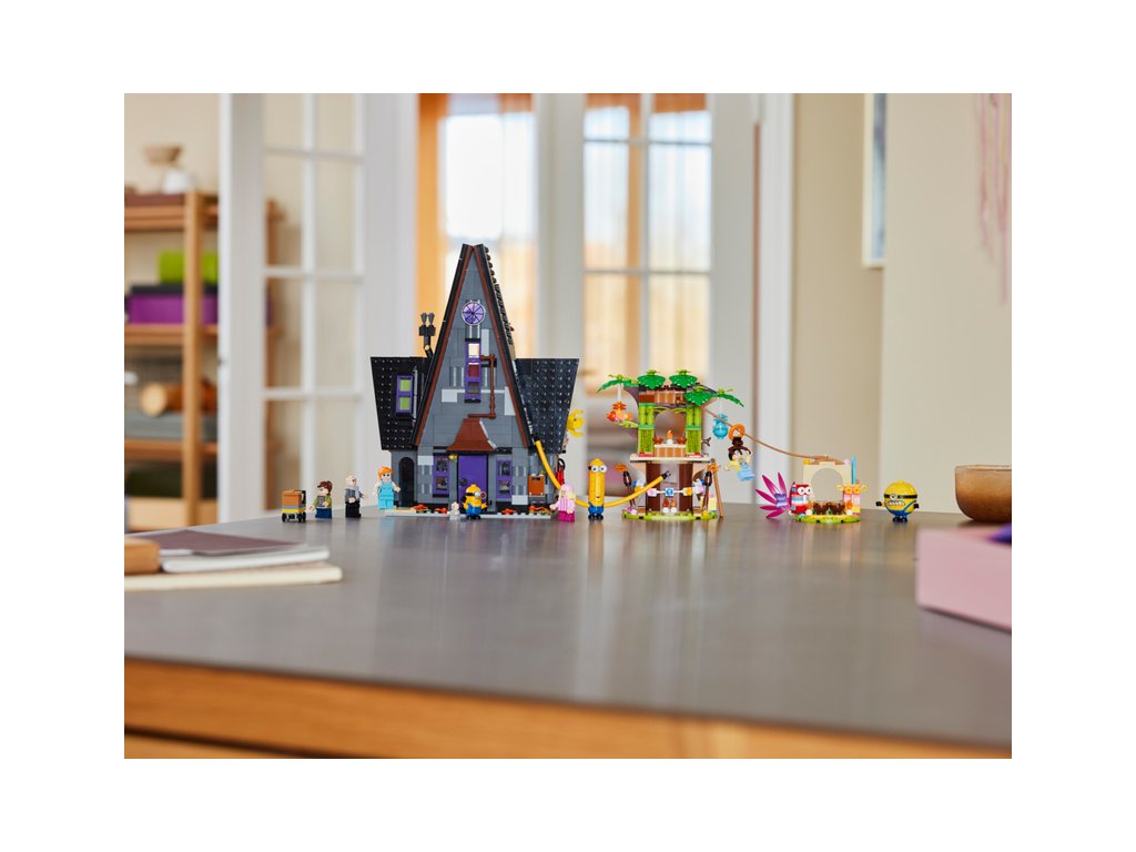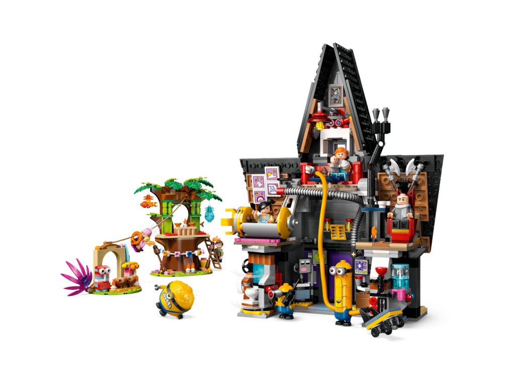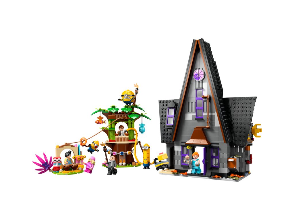 Gruův legendární dům je plný slavných předmětů z filmové předlohy, včetně červené pohovky, krbu, ložnice ve stylu rakety, laboratoře mimoňů se spoustou vychytávek a otočných jednotek s předměty, jako je toaleta a box na sušenky. Vedle domu se nachází pestrobarevný domeček na stromě, který patří dívkám, a najdete v něm jídelnu a lanovou dráhu propojenou s prostorem na párty (s bongy!) a vyzdobený úkryt s květinami, hračkami a svíčkami. Součástí je 6 minifigurek – Gru, Lucy, Margo, Edith, Agnes a dítě – a 3 velké sestavitelné figurky mimoňů: Mel, Jerry a Tim. Stavebnice je plná zábavných překvapení a díky spoustě postav a doplňků je ideálním dárkem pro děti, které si oblíbily mimoně.