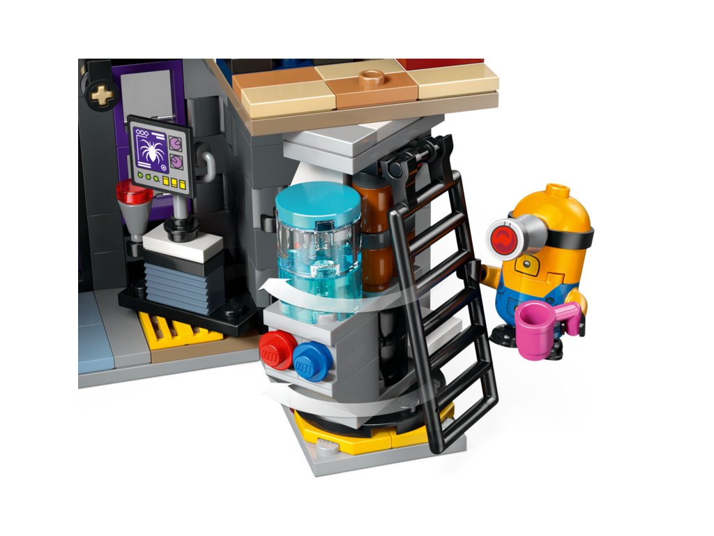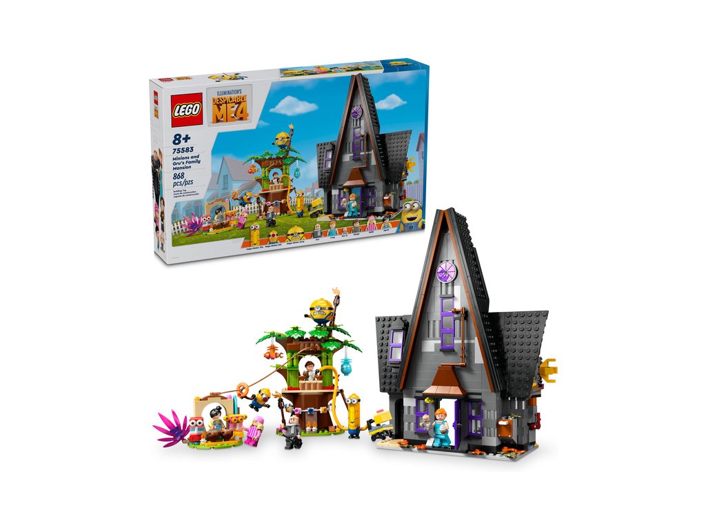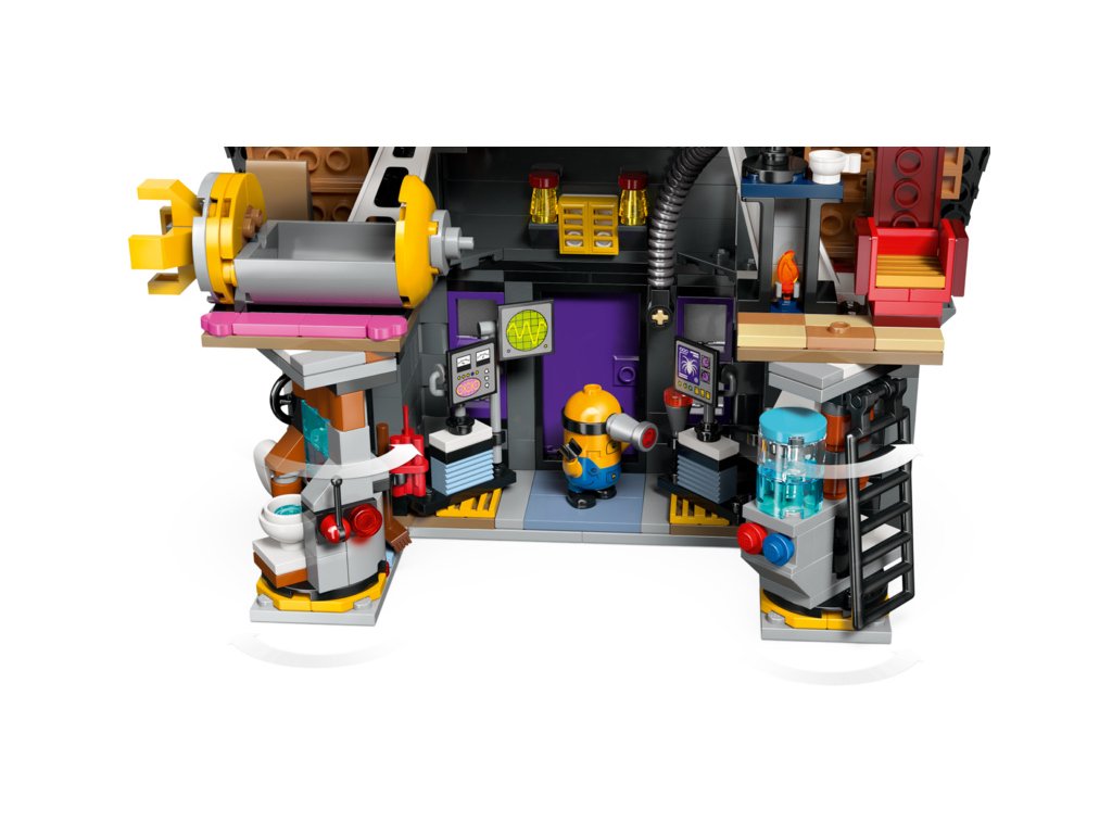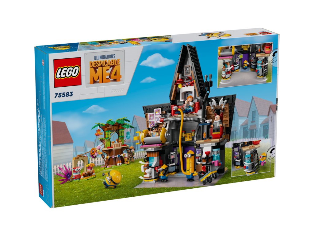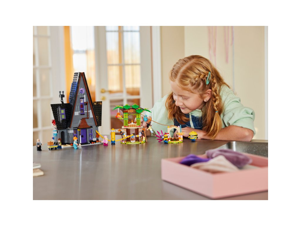 Gruův legendární dům je plný slavných předmětů z filmové předlohy, včetně červené pohovky, krbu, ložnice ve stylu rakety, laboratoře mimoňů se spoustou vychytávek a otočných jednotek s předměty, jako je toaleta a box na sušenky. Vedle domu se nachází pestrobarevný domeček na stromě, který patří dívkám, a najdete v něm jídelnu a lanovou dráhu propojenou s prostorem na párty (s bongy!) a vyzdobený úkryt s květinami, hračkami a svíčkami. Součástí je 6 minifigurek – Gru, Lucy, Margo, Edith, Agnes a dítě – a 3 velké sestavitelné figurky mimoňů: Mel, Jerry a Tim. Stavebnice je plná zábavných překvapení a díky spoustě postav a doplňků je ideálním dárkem pro děti, které si oblíbily mimoně.