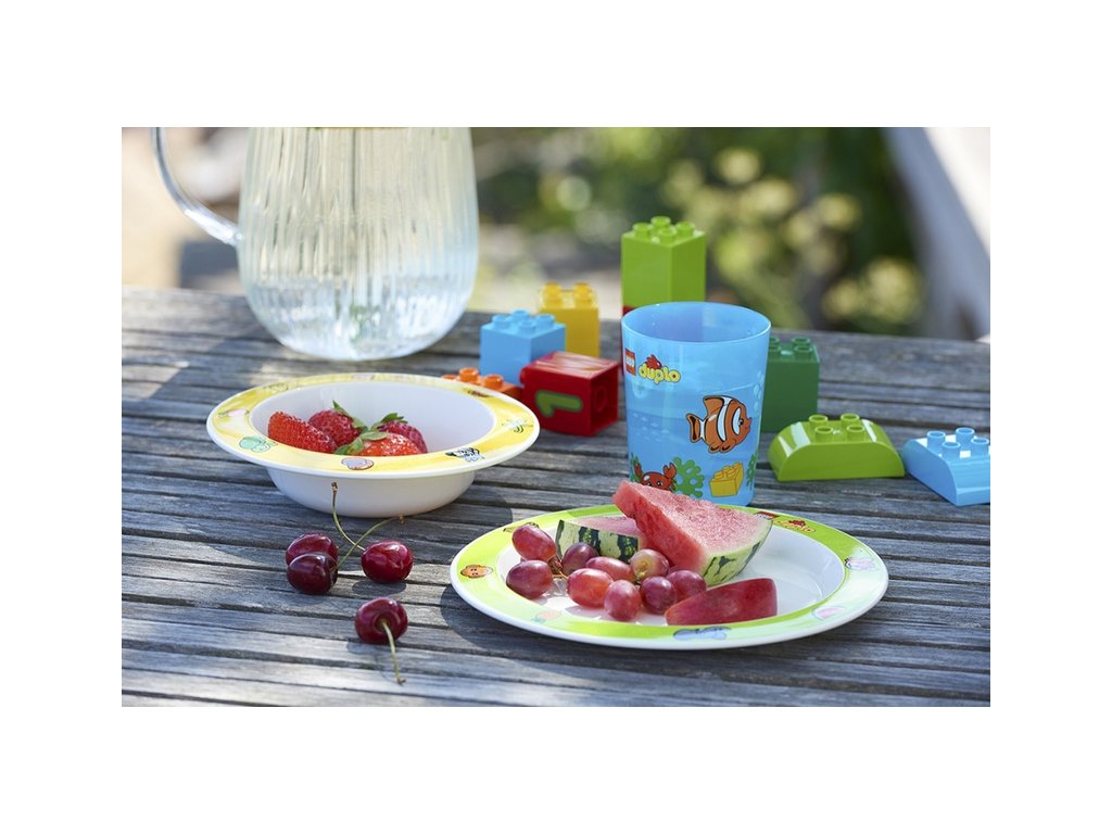 Jídelní set pro každé malé příznivce LEGO Duplo. Set plochého a hlubokého talíře s hrnečkem v hravém designu. Vyrobeno PP plastu, vhodné do myčky a mikrovlnky.