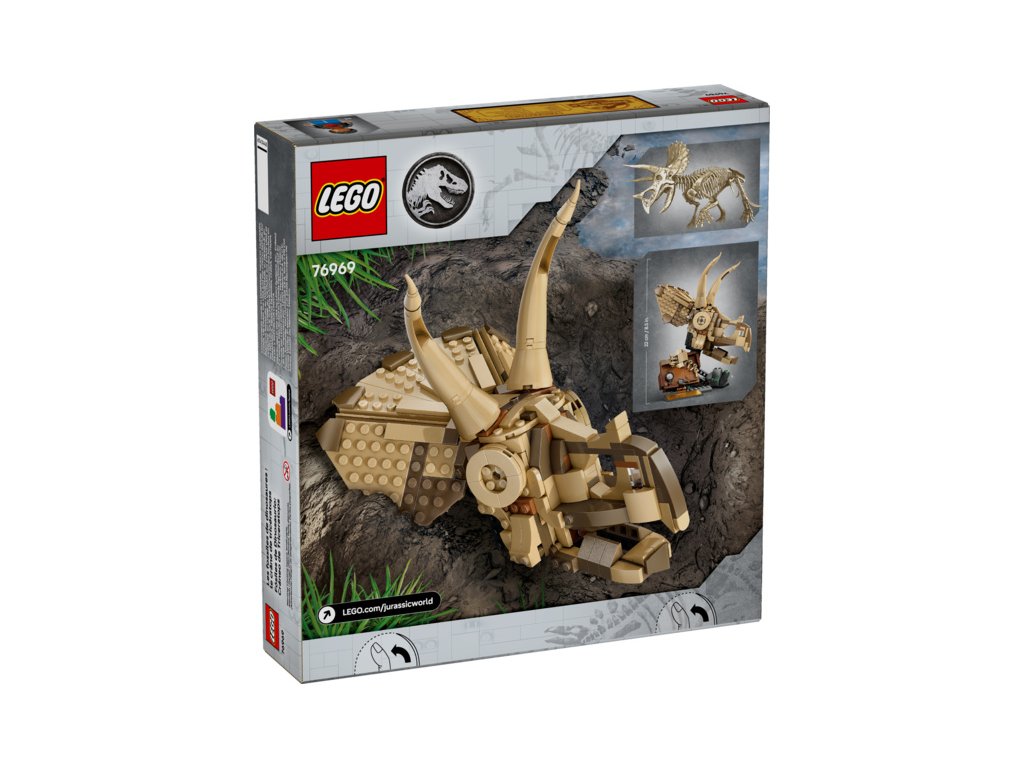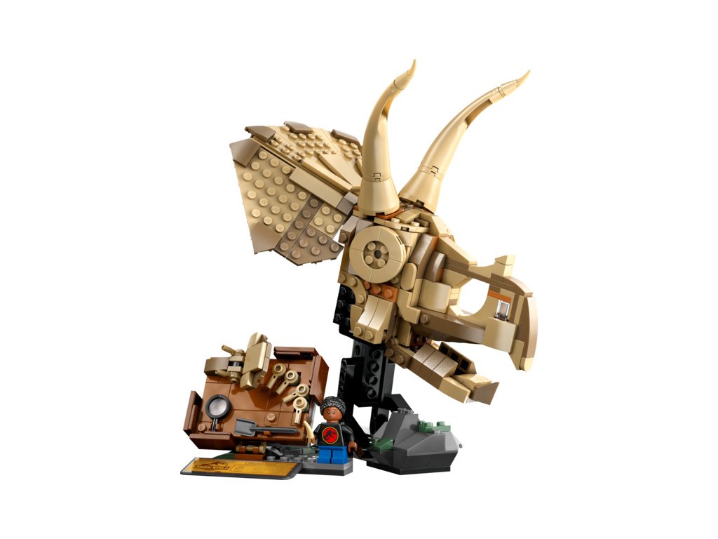 Malí paleontologové od 9 let si vychutnají hru na sbírání dinosauřích fosilií se stavebnicí LEGO® Jurassic World Dinosauří fosilie: Lebka triceratopse na motivy filmu Jurský svět.