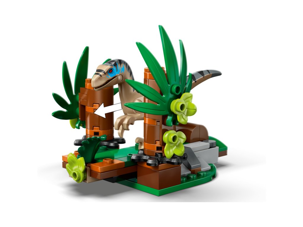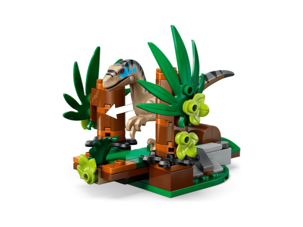 - Dinosauří stavebnice plná funkcí – Velociraptor má pohyblivou čelist a keř má funkci „překvapení“, díky které z něj velociraptor „vyskočí“, když zatlačíte na pohyblivou část základny