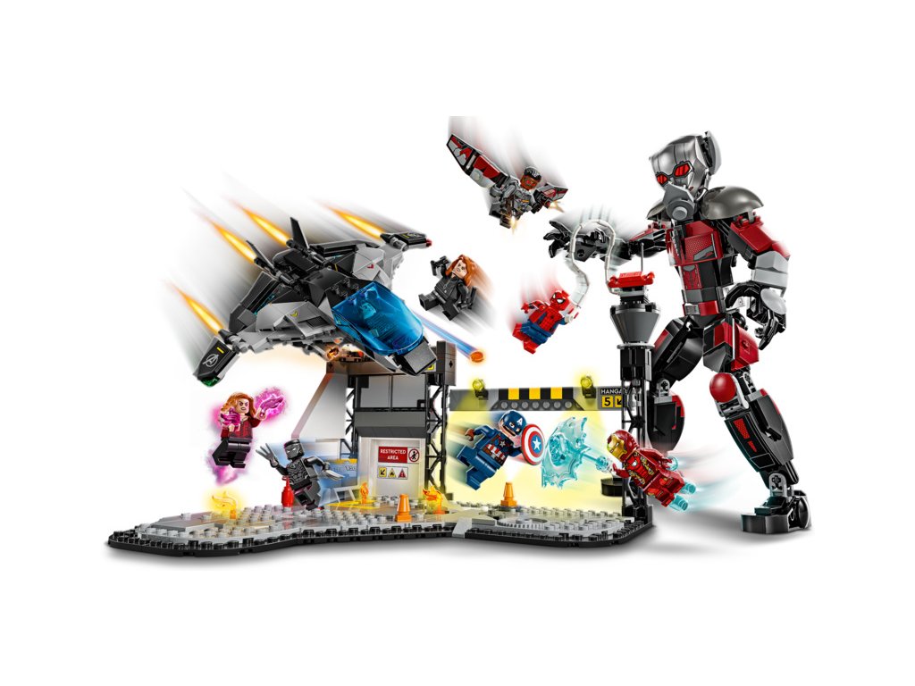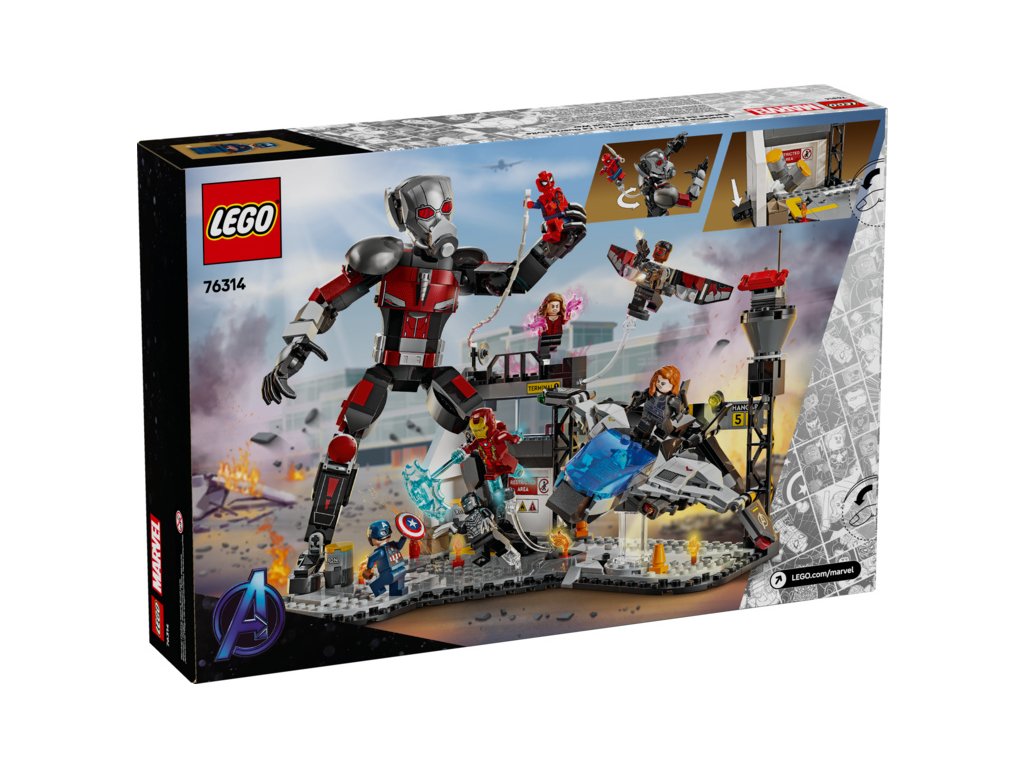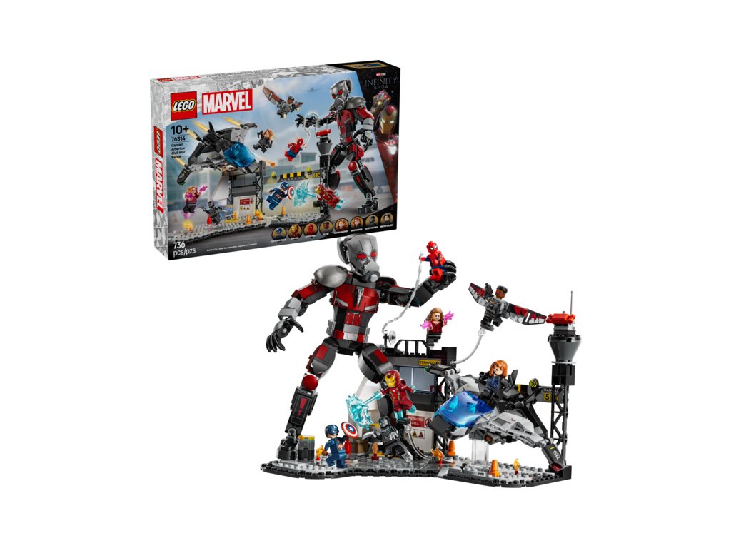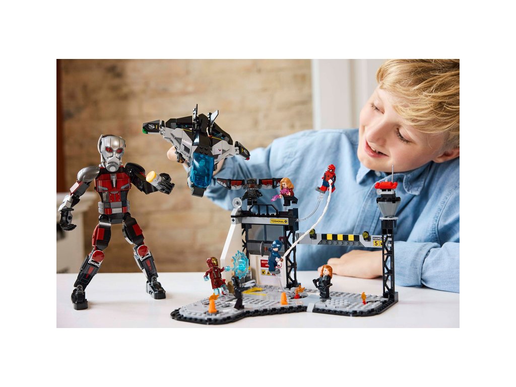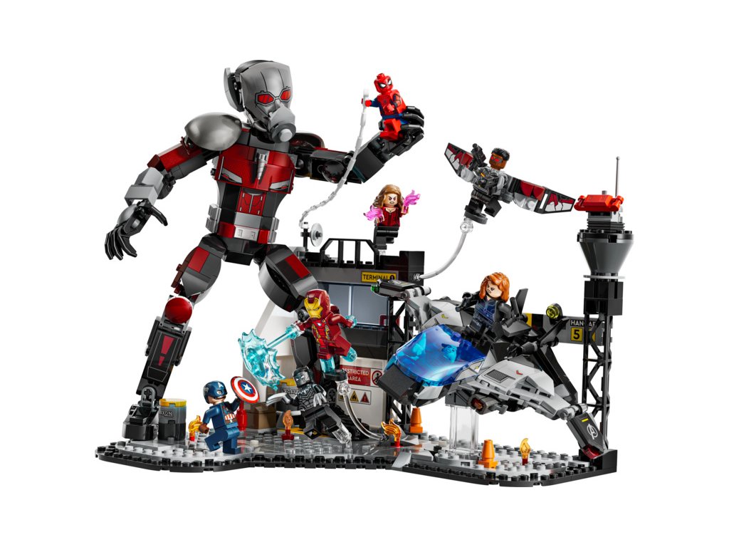 Tato sestavitelná stavebnice je inspirovaná scénou bitvy na letišti z filmu Captain America: Občanská válka od studia od Marvel. Obsahuje 8 minifigurek – Kapitána Ameriku, Winter Soldiera, Wandu, Falcona, Iron Mana, Spider-Mana, Black Widow a Black Panthera – se zbraněmi a doplňky a plně pohyblivého Ant-Mana, který měří přes 24 cm na výšku. Letadlo Quinjet má sklopná křídla a otevírací kokpit, do kterého lze usadit minifigurku pilota. Prvek vybuchujícího sudu zakomponovaný do scenérie letiště modelu dodává nádech bitvy. Děti si mohou model během stavění přibližovat a otáčet pomocí digitální aplikace LEGO Builder.