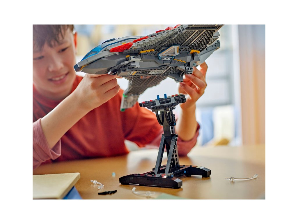 - Stavebnice pro děti z 1131 dílků – Hotový model stíhačky Quinjet měří přes 28 cm na výšku, 30 cm na délku a 45 cm na šířku