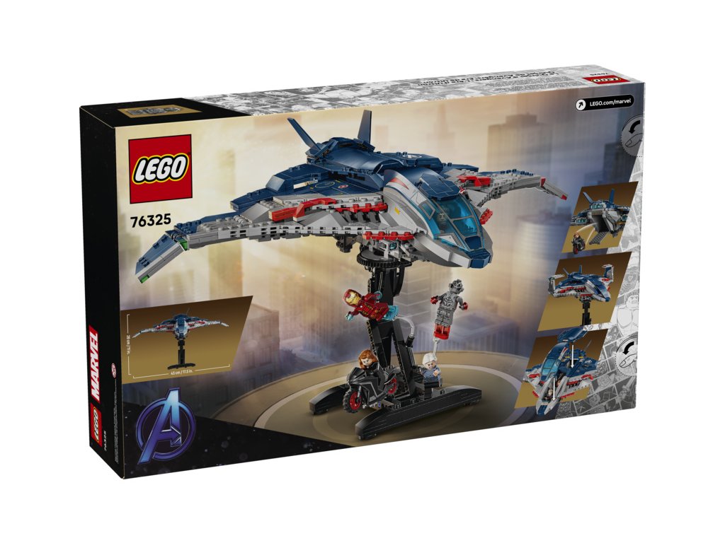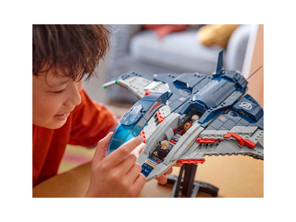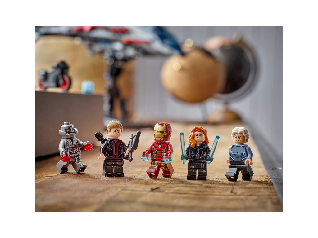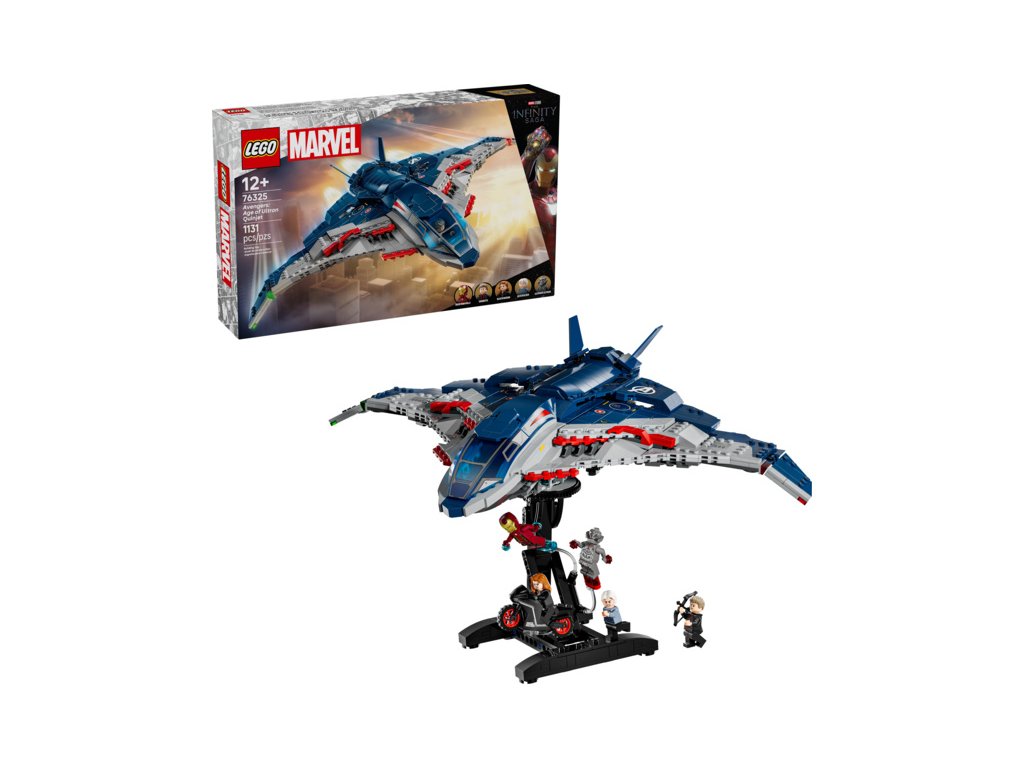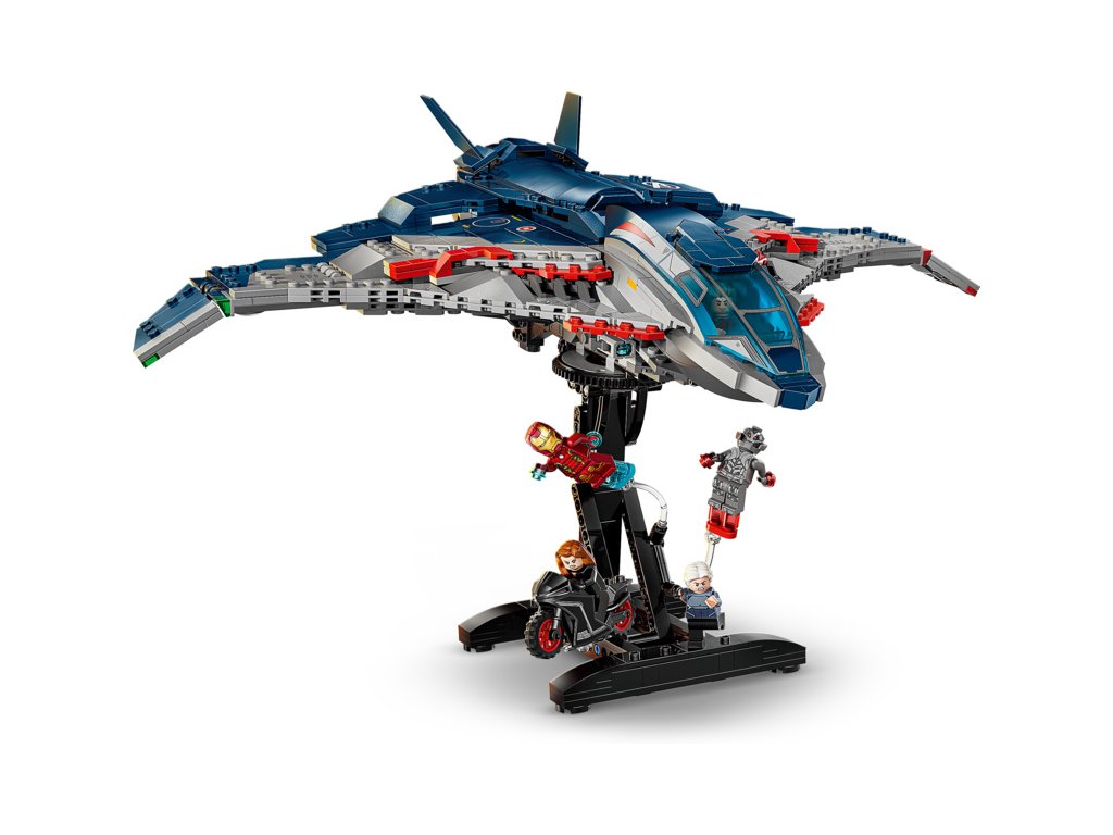 Sestavitelný model stíhačky Quinjet obsahuje 5 minifigurek: Black Widow s motorkou, Iron Mana, Quicksilvera, Ultimate Ultrona a Hawkeye s lukem a šípy. Minifigurky lze připevnit na více míst v letadle. Quinjet má otevírací kokpit, 2 vystřelovače vepředu a úložný prostor pro zbraně Black Widow a Hawkeyeův luk. Zadní dveře lze otevřít, aby děti mohly vjíždět a vyjíždět s motorkou. Součástí je odnímatelný otočný stojan, díky kterému si oblíbenou stíhačku můžete prohlédnout ze všech úhlů. Pro ještě větší digitální zábavu stavitelé můžou přibližovat, otáčet modely ve 3D a sledovat svůj pokrok pomocí zábavné a intuitivní aplikace LEGO Builder. Stavebnice obsahuje 1131 dílků.