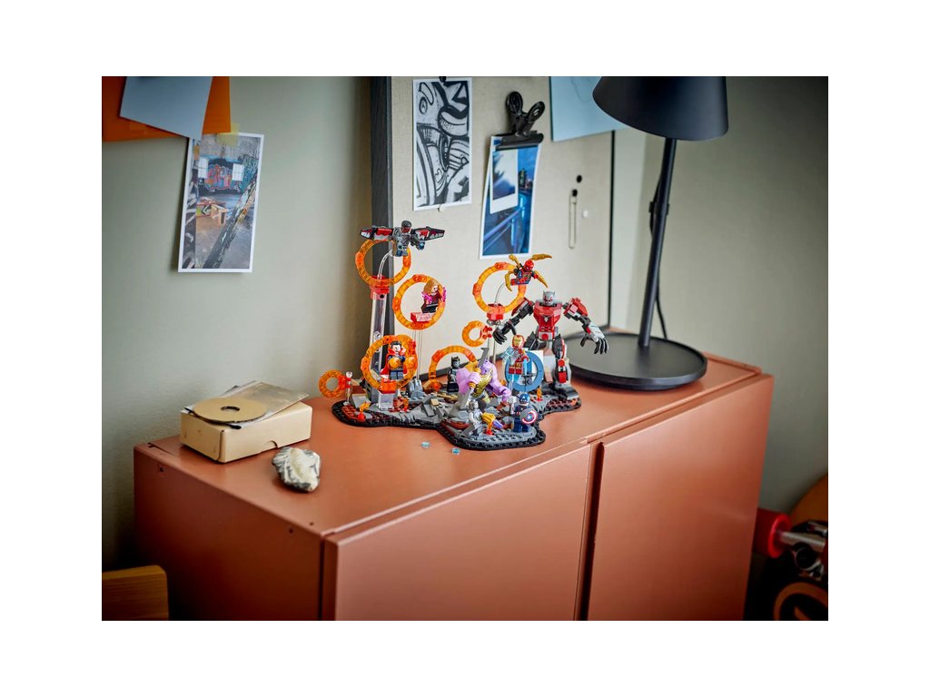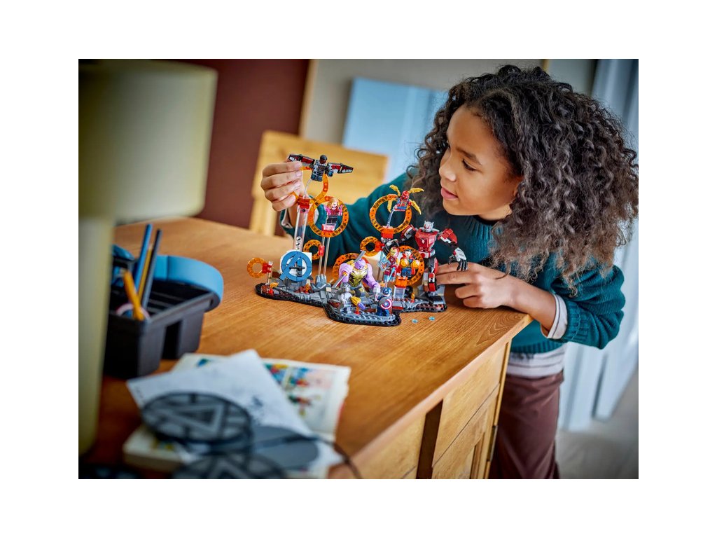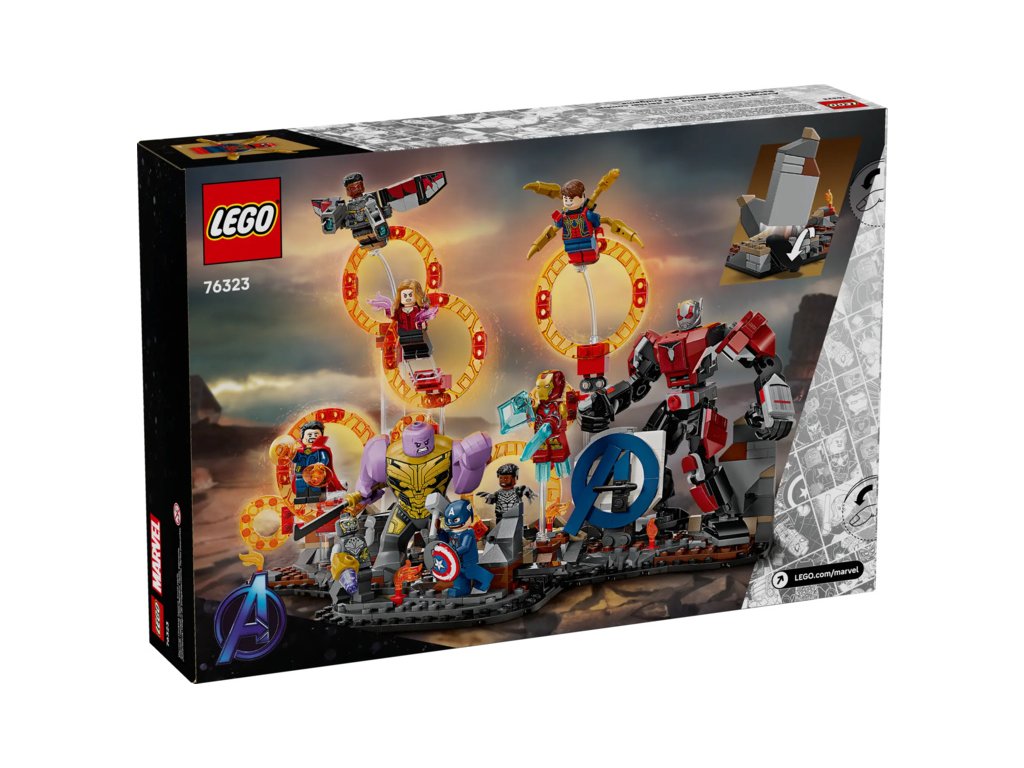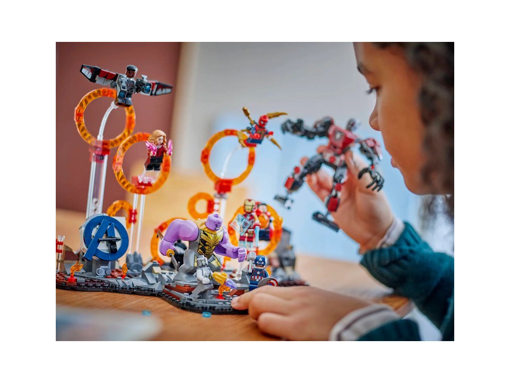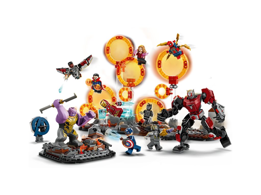 Tato stavebnice zobrazuje velkolepou bitvu z filmu Avengers: Endgame z dílny studia Marvel a obsahuje interdimenzionální portály vytvořené pomocí dvouprstenu a 9 minifigurek: Kapitán Amerika (se štítem), Iron Man MK85 (s mečem a štítem), Chitauri (s vystřelovačem na ruce), Ant-Man, Scarlet Witch (s dílky ve tvaru plamene), Doctor Strange, Iron Spider (se 4 pohyblivýma „nohama“ na zádech), Black Panther a Falcon (se 2 vystřelovači). Díky velké figurce Thanose z kostek LEGO, plně pohyblivému robotickému obleku Ant-Mana, 2 funkcím vybuchujících skal a nekonečně všestranné přestavitelnosti si děti vychutnají superhrdinskou akci velkolepých rozměrů! Model obsahuje 621 dílků.
