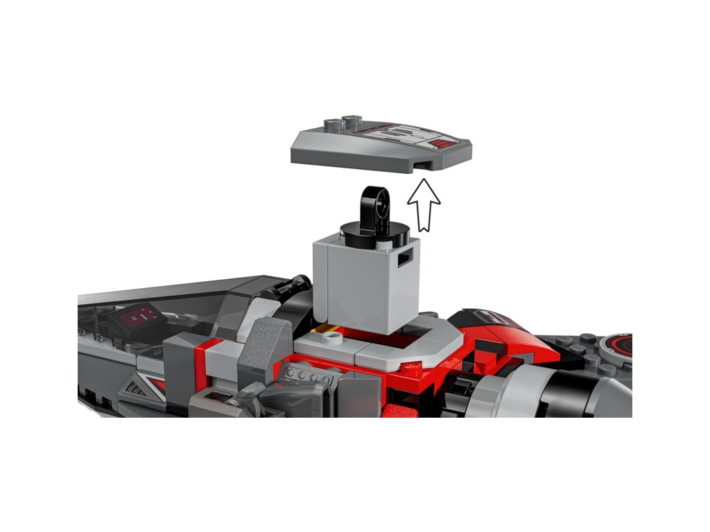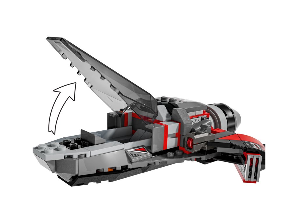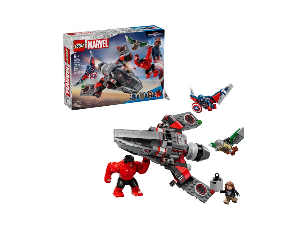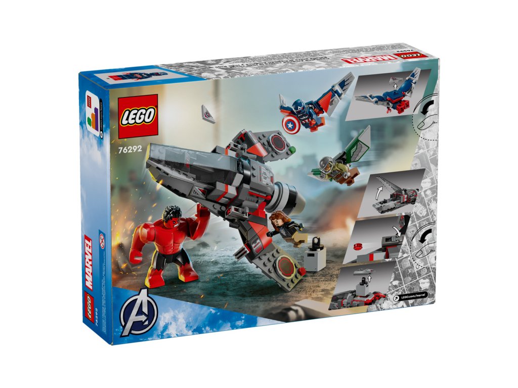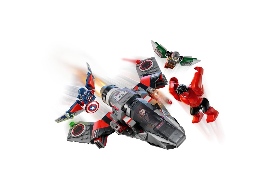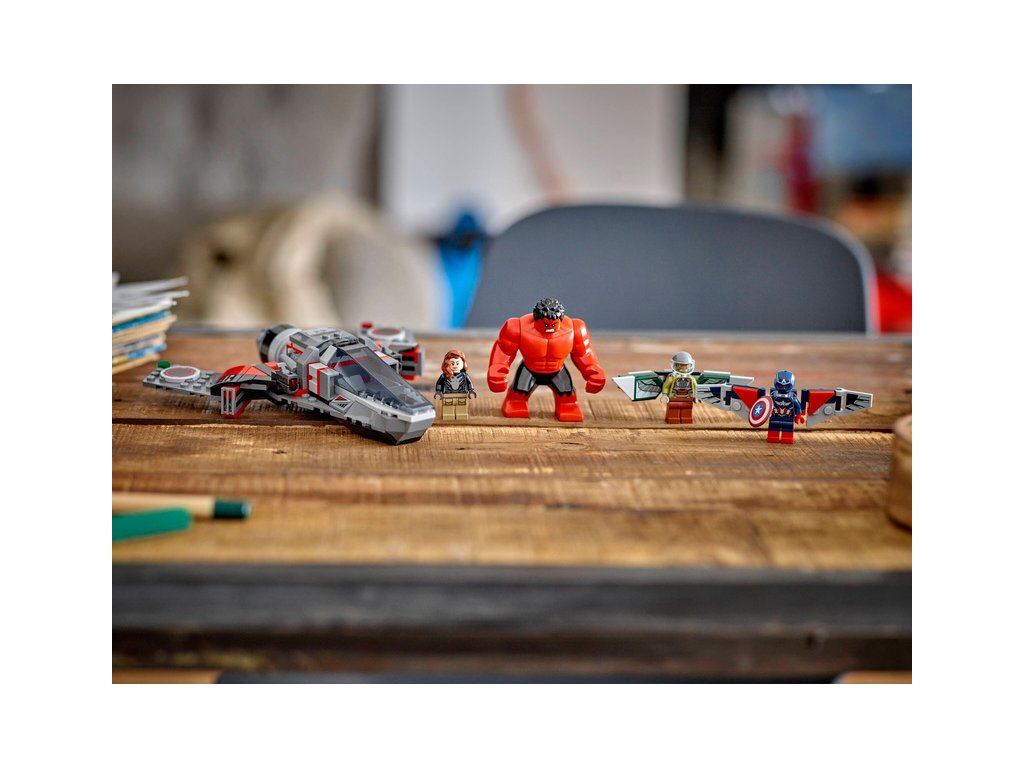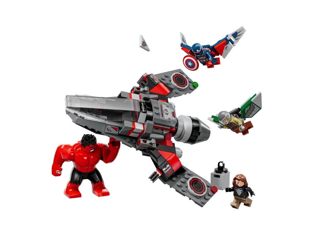 Součástí této stavebnice je působivá řada minifigurek: Kapitán Amerika a Falcon (oba mají zatahovací křídla), Red Hulk a Ruth Bat-Seraph. Nechybí velký otevírací kokpit s prostorem pro minifigurku pilota. Děti tento sestavitelný model snadno uchopí do rukou a mohou s ním létat a útočit pomocí 2 vystřelovačů. Horní část stíhačky lze odejmout a odhalit skrytý úložný prostor s místem na malé dílky a záhadné kovy v zadní části. Model stíhačky se skvěle hodí k nezávislému hraní. Děti mohou přibližovat a otáčet stavebnice ve 3D a sledovat svůj pokrok pomocí zábavné a intuitivní aplikace LEGO Builder.