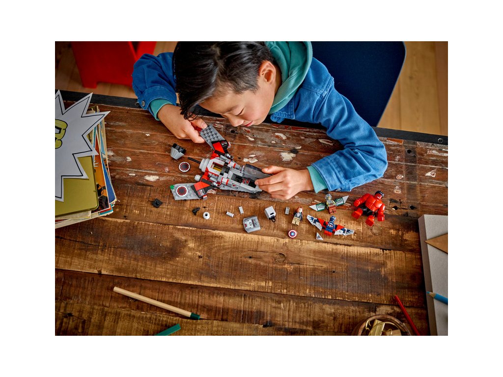 - Zábavná stíhačka superhrdinů – Se stavebnicí LEGO® Marvel Souboj: Kapitán Amerika vs. Red Hulk si poskládáte model tryskáče, se kterým se děti od 8 let vydají na nekonečná akční dobrodružství v oblacích
