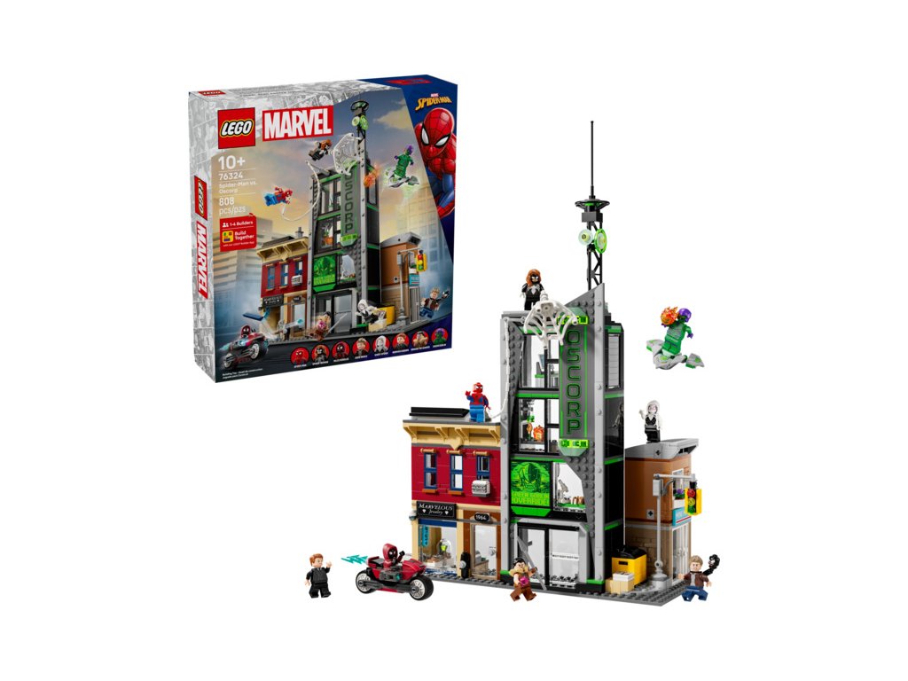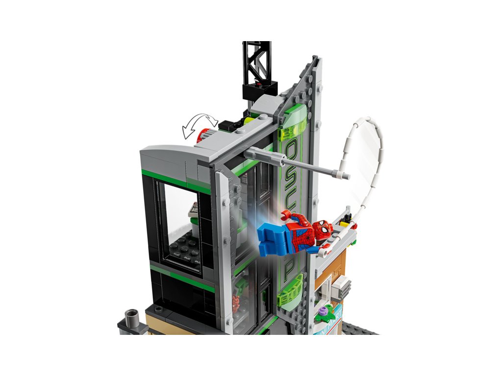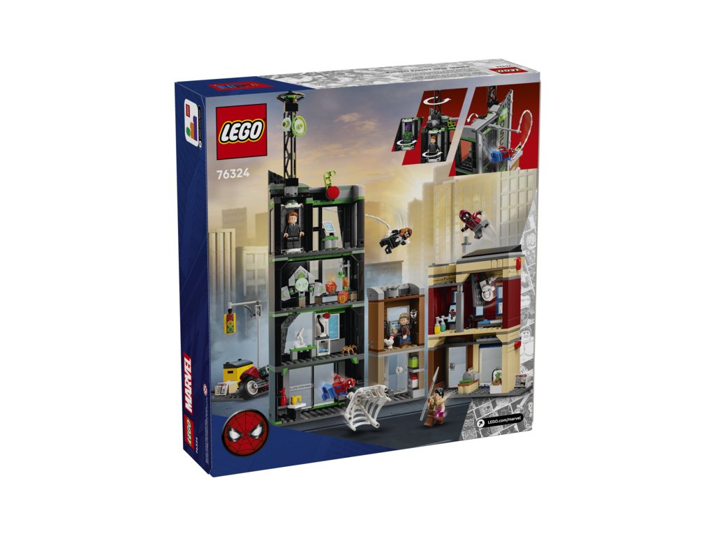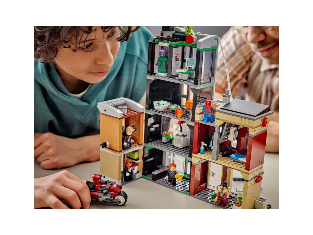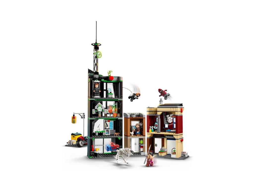 Pouliční scéna obsahuje 3 samostatné budovy: byt Milese Moralese s klenotnictvím v přízemí, kancelářskou budovu Oscorp a Venomův byt s večerkou v přízemí. Každá místnost obsahuje příslušné vybavení a doplňky. Osm minifigurek LEGO z filmů od studia Marvel se postará o nekonečné akční hraní s pavučinami: Spider-Man, Spider-Woman, Miles Morales s motorkou, Eddie Brock, Ghost-Spider, Norman Osborn, lovec Kraven a Zelený Goblin s kluzákem. Díky průhledným tyčím můžou děti umisťovat a polohovat postavy do realistických póz. Stavějte tuto zábavnou stavebnici společně s přáteli a rodinou pomocí aplikace LEGO® Builder. Stavebnice obsahuje 808 dílků.