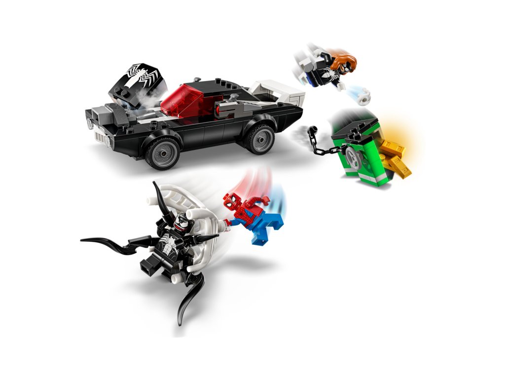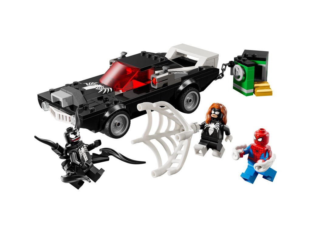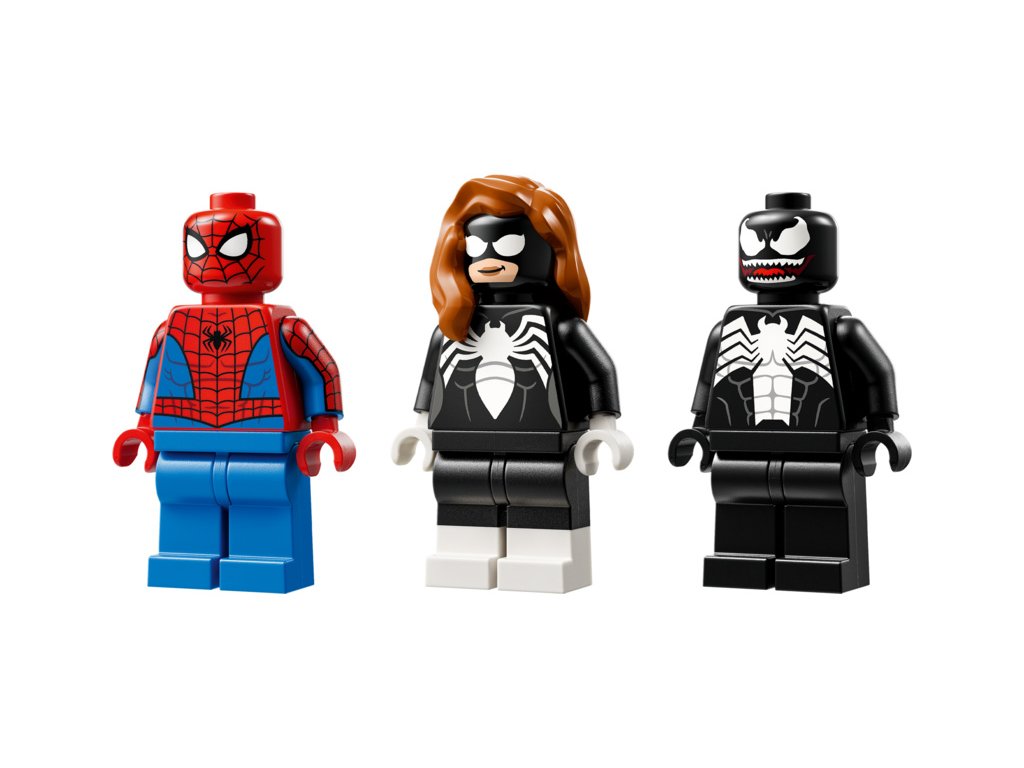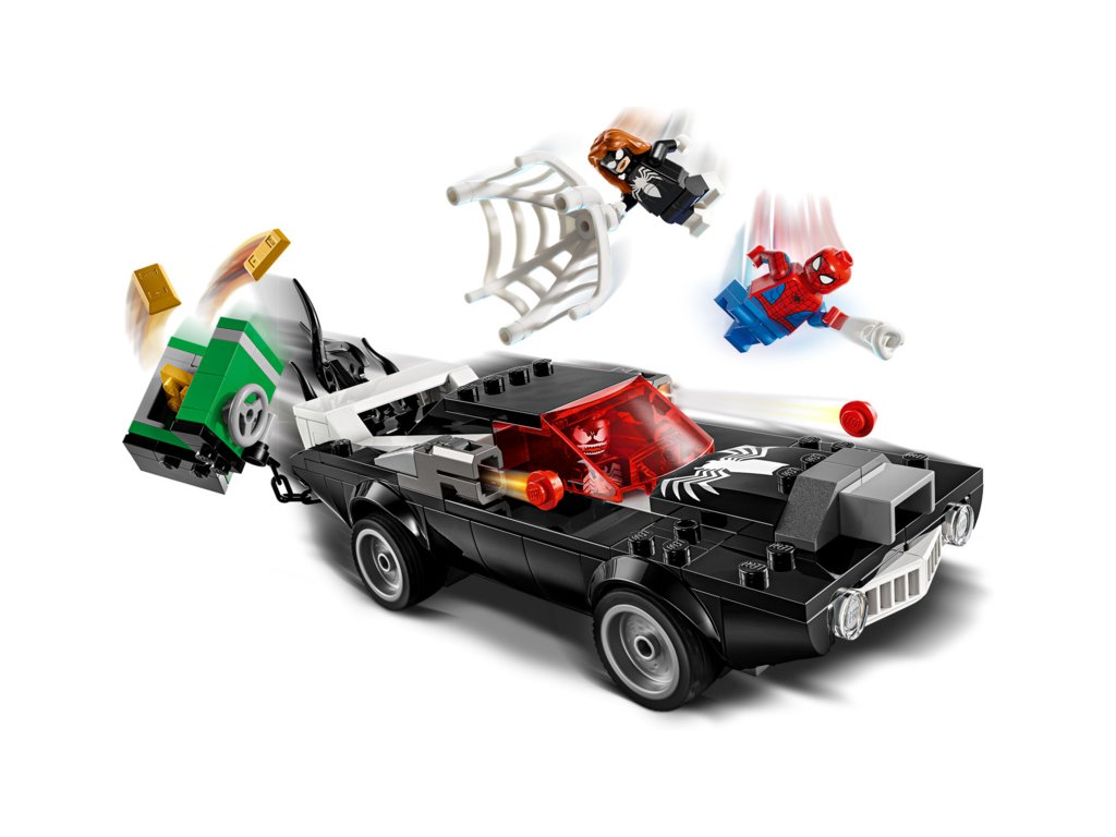 Stavebnice s Venomovým vozidlem obsahuje 3 minifigurky: Spider-Mana s vystřelovačem pavučin, Venoma se 4 chapadly a Spider-Woman (Julii Carpenterovou) s pružnou pavučinou, která je dostatečně velká na to, aby polapila padoucha. Venomizované vozidlo má na každé straně vystřelovač, přístupný motor a otevírací kokpit. Venom může sedět uvnitř auta – stačí odejmout 2 spodní chapadla, která můžete použít k venomizaci auta. Sejf se zlatými cihlami inspiruje k akčnímu hraní na hrdinu a padoucha. Trezor s přihrádkou na zlaté cihly odtáhnete autem. Pro ještě větší digitální zábavu stavitelé můžou přibližovat a otáčet modely ve 3D a sledovat svůj pokrok pomocí zábavné a intuitivní aplikace LEGO Builder.