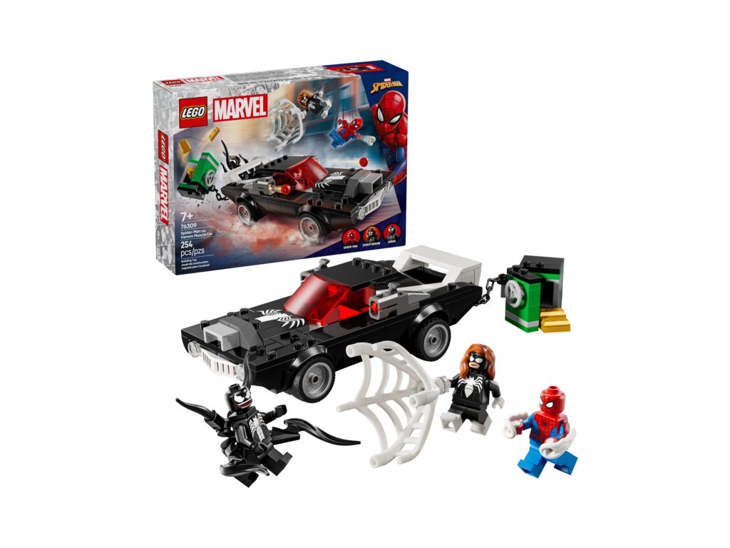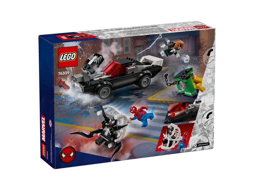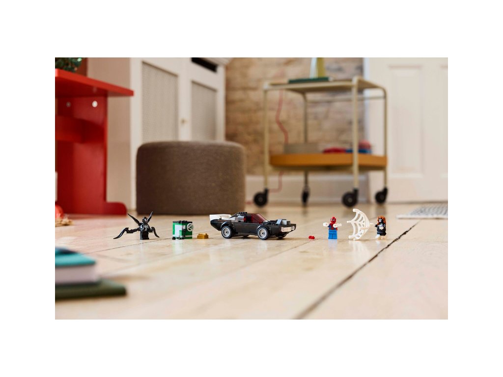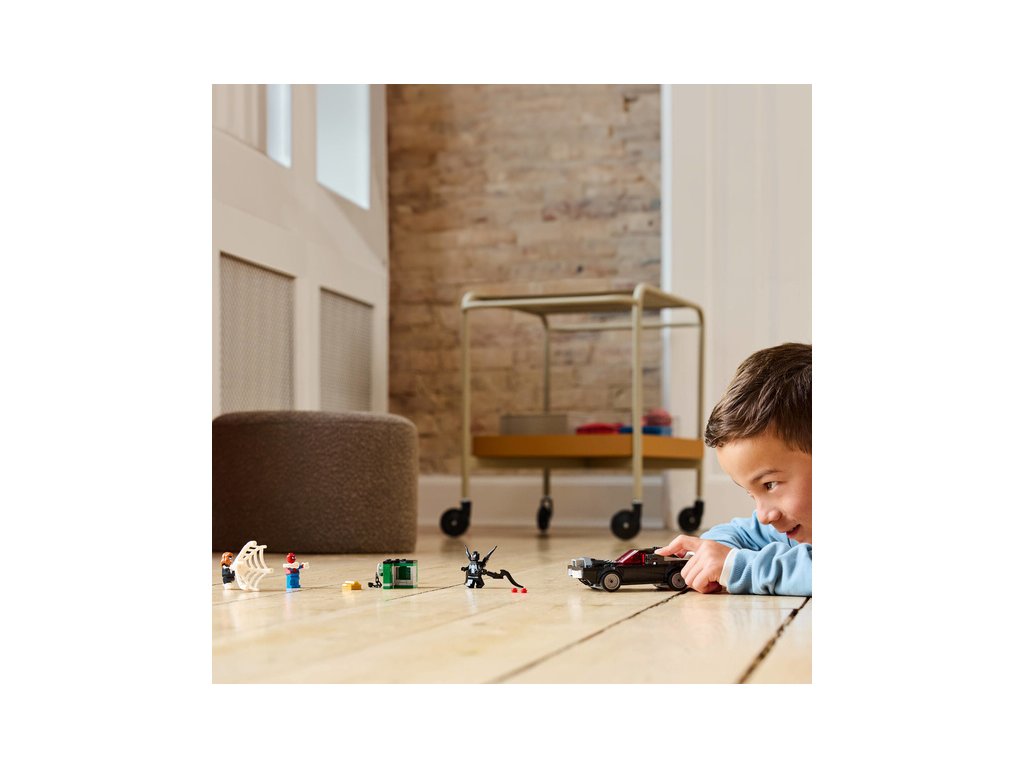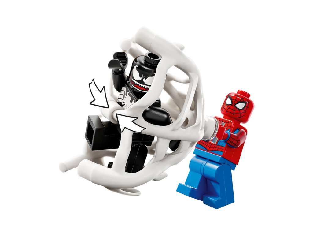 Stavebnice s Venomovým vozidlem obsahuje 3 minifigurky: Spider-Mana s vystřelovačem pavučin, Venoma se 4 chapadly a Spider-Woman (Julii Carpenterovou) s pružnou pavučinou, která je dostatečně velká na to, aby polapila padoucha. Venomizované vozidlo má na každé straně vystřelovač, přístupný motor a otevírací kokpit. Venom může sedět uvnitř auta – stačí odejmout 2 spodní chapadla, která můžete použít k venomizaci auta. Sejf se zlatými cihlami inspiruje k akčnímu hraní na hrdinu a padoucha. Trezor s přihrádkou na zlaté cihly odtáhnete autem. Pro ještě větší digitální zábavu stavitelé můžou přibližovat a otáčet modely ve 3D a sledovat svůj pokrok pomocí zábavné a intuitivní aplikace LEGO Builder.