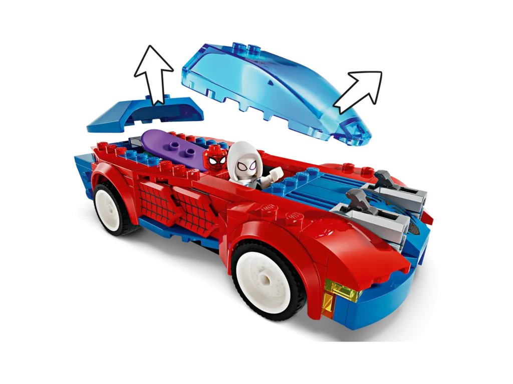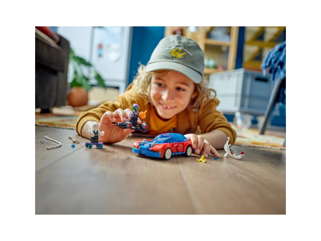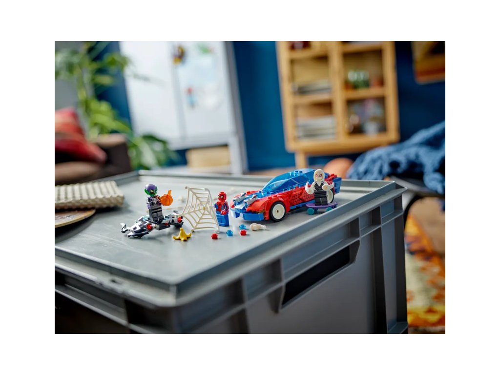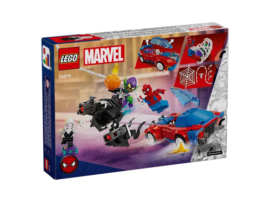 Spider-Man, Ghost-Spider a Venom Zelený goblin se utkají v rychlé akční bitvě s řadou vozidel, zbraní a doplňků. Spider-Manovo auto má 2 přední vystřelovače, Zelený goblin se pyšní 2 vystřelovači na kluzáku a dýňovými bombami a Ghost-Spider při jízdě na skateboardu používá 2 ruční vystřelovače pavučin. Spider-Man se houpe na ohebném pavučinovém „laně“ a pomocí velké pavučiny uvězní padouchy. Odnímatelné části stavebnice umožňují přístup do interiéru auta, do kterého se vejdou hned 2 minifigurky a skateboard. Pro ještě více digitální zábavy je zde zábavná a intuitivní aplikace LEGO Builder, kde mohou stavitelé přibližovat a otáčet modely ve 3D a sledovat postup.