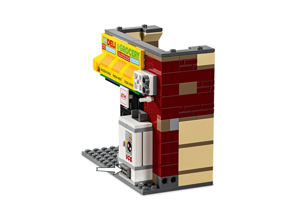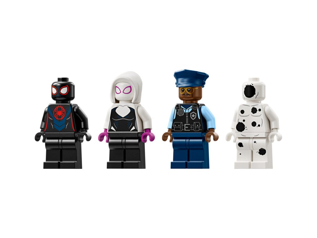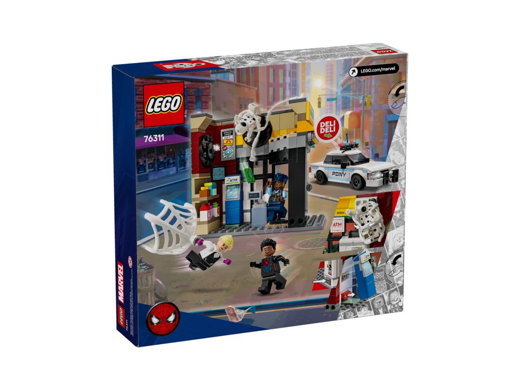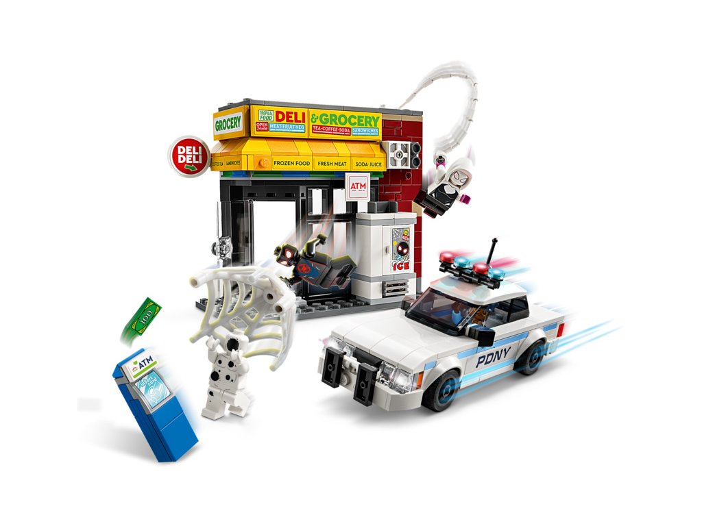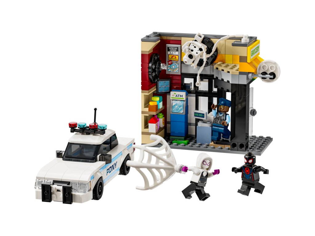 Stavebnice se Spider-Manem obsahuje 4 minifigurky: Milese Moralese, Fleka, Gwen Stacyovou a strážníka Jeffersona. Samoobsluha má zeď s funkcí výbuchu, která umožňuje vyjmutí bankomatu. Mezi doplňky najdete dlouhé, pružné pavučinové lano a pružnou pavučinu, do které se vejde i minifigurka. Policejní auto lze otevřít a dovnitř umístit 2 minifigurky. Stavitelé můžou přibližovat a otáčet modely ve 3D a sledovat svůj pokrok pomocí zábavné a intuitivní aplikace LEGO Builder pro ještě větší porci digitální zábavy.