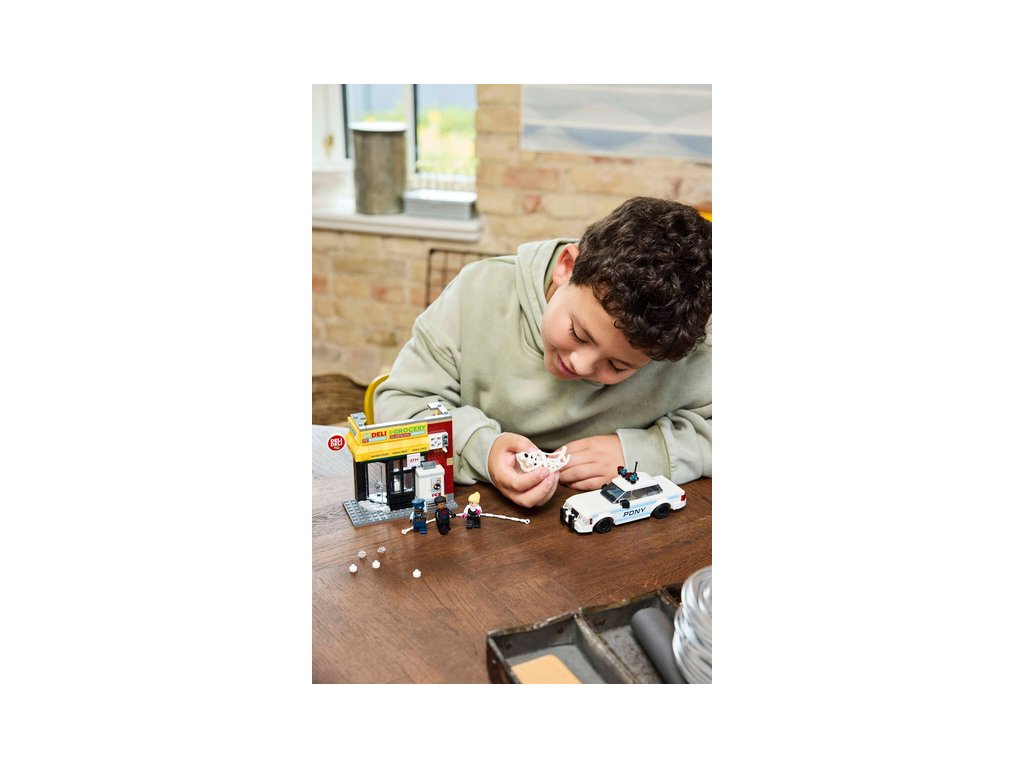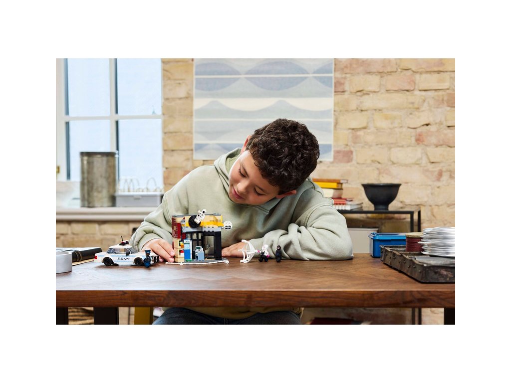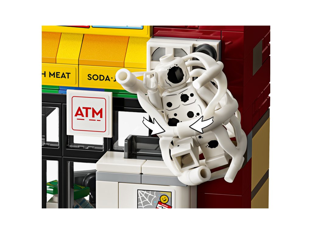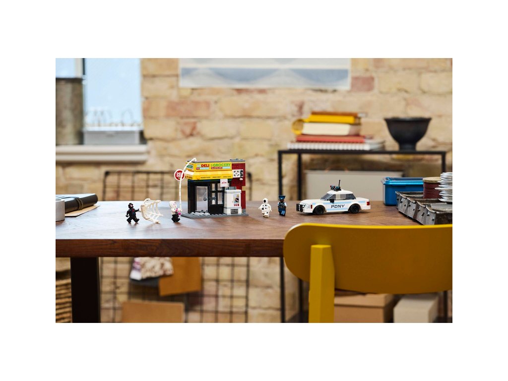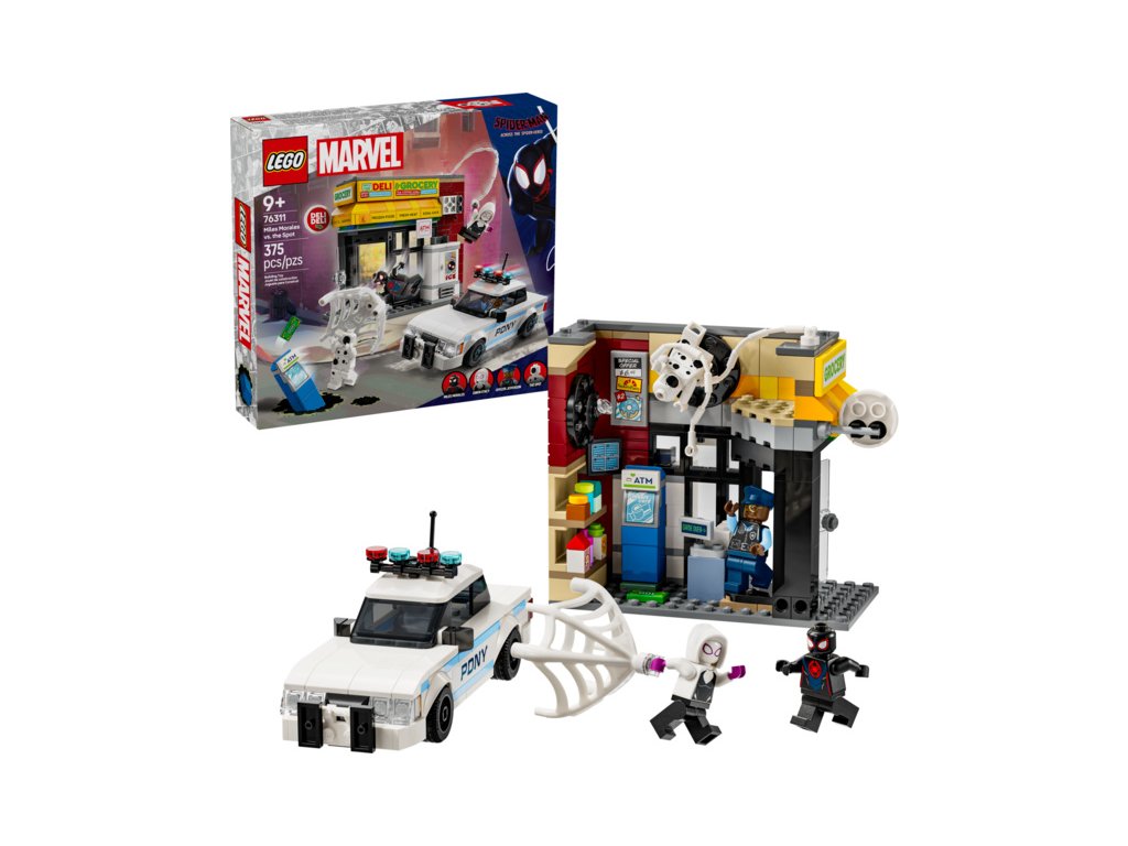 Stavebnice se Spider-Manem obsahuje 4 minifigurky: Milese Moralese, Fleka, Gwen Stacyovou a strážníka Jeffersona. Samoobsluha má zeď s funkcí výbuchu, která umožňuje vyjmutí bankomatu. Mezi doplňky najdete dlouhé, pružné pavučinové lano a pružnou pavučinu, do které se vejde i minifigurka. Policejní auto lze otevřít a dovnitř umístit 2 minifigurky. Stavitelé můžou přibližovat a otáčet modely ve 3D a sledovat svůj pokrok pomocí zábavné a intuitivní aplikace LEGO Builder pro ještě větší porci digitální zábavy.