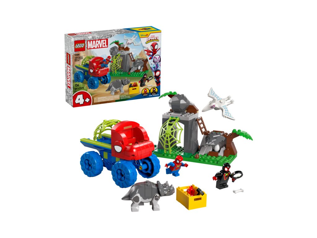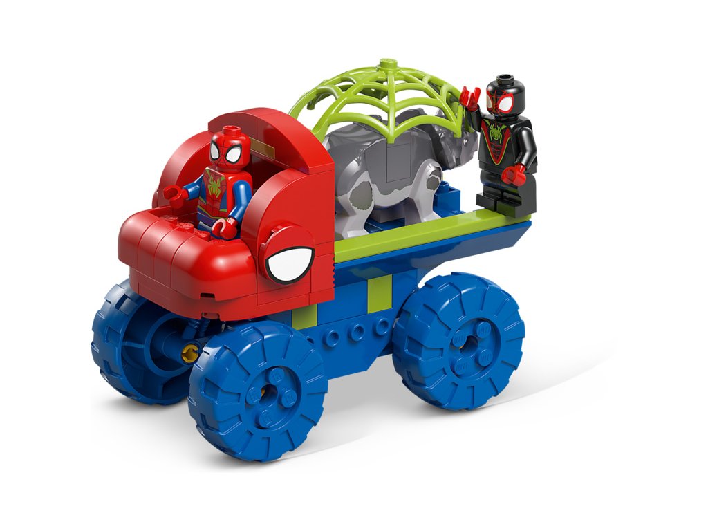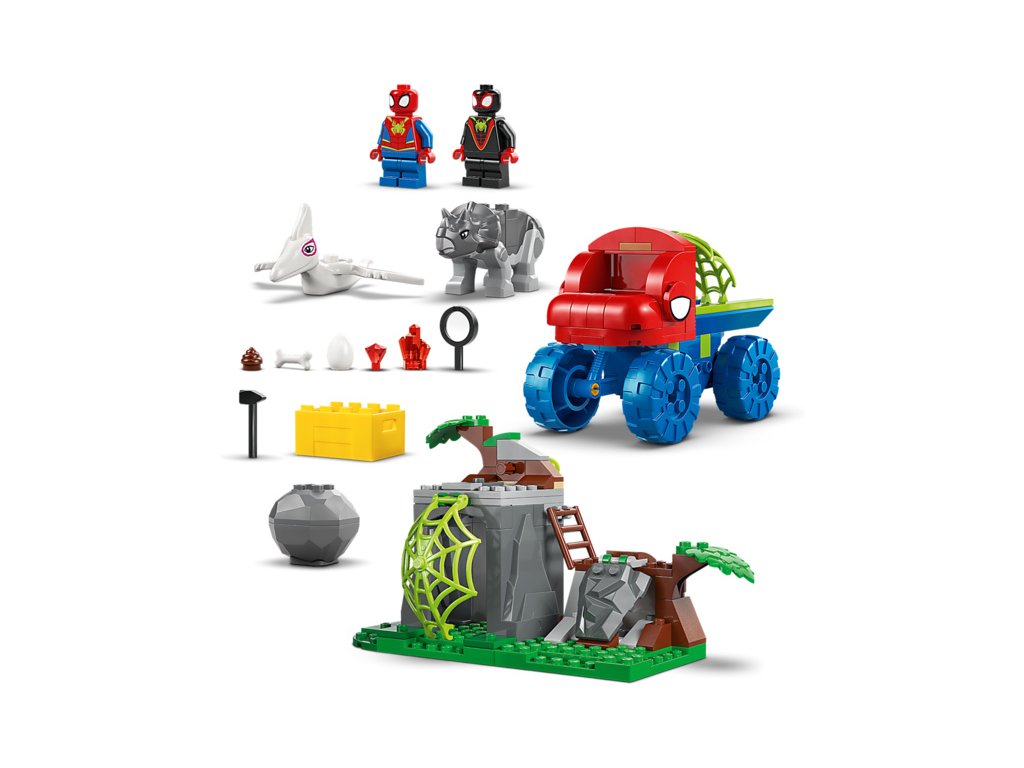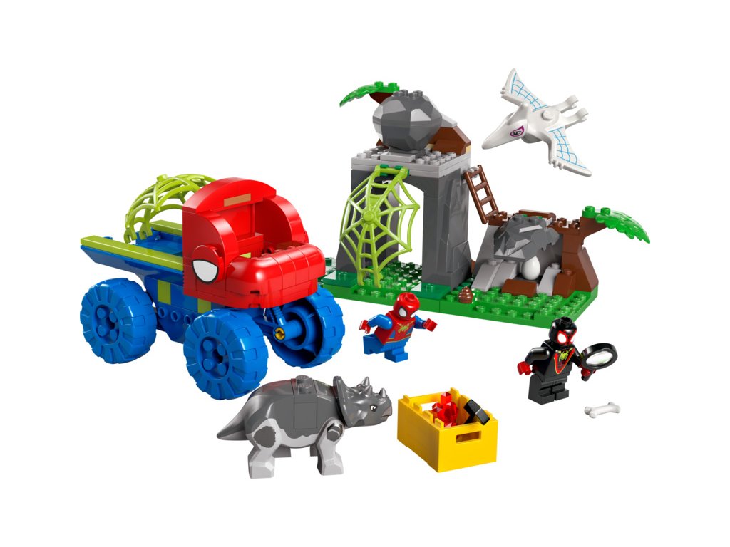 Tato stavebnice LEGO® obsahuje minifigurky Spideyho a Milese „Spin“ Moralese a 2 sestavitelné figurky dinosaurů: Ghost-Spider jako pterodaktyla a Rhina jako triceratopse. Součástí je také Spideyho truck LEGO s velkou pavučinou připevněnou k zadní straně, funkce padajícího kamene ovládaná spouští, dinosauří vejce, které je třeba odhalit, a pavučina, kterou můžete spustit a s její pomocí chytit padoucha do pasti. Nechybí intuitivní pokyny v podobě barevného obrázkového průvodce a samostatné sáčky s kostkami a velkou začátečnickou kostkou, se kterými se děti hned pustí do stavění.