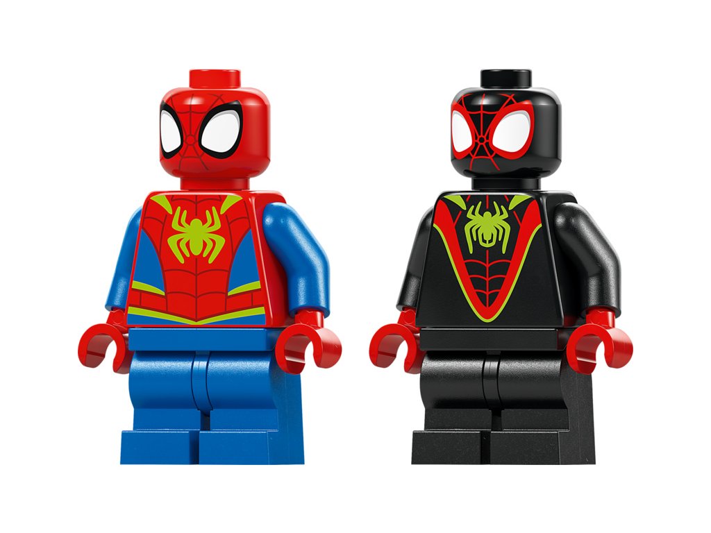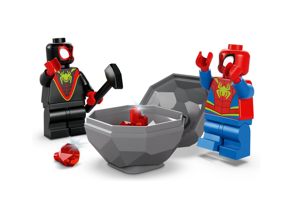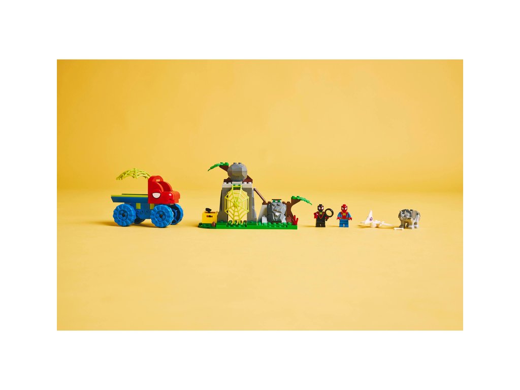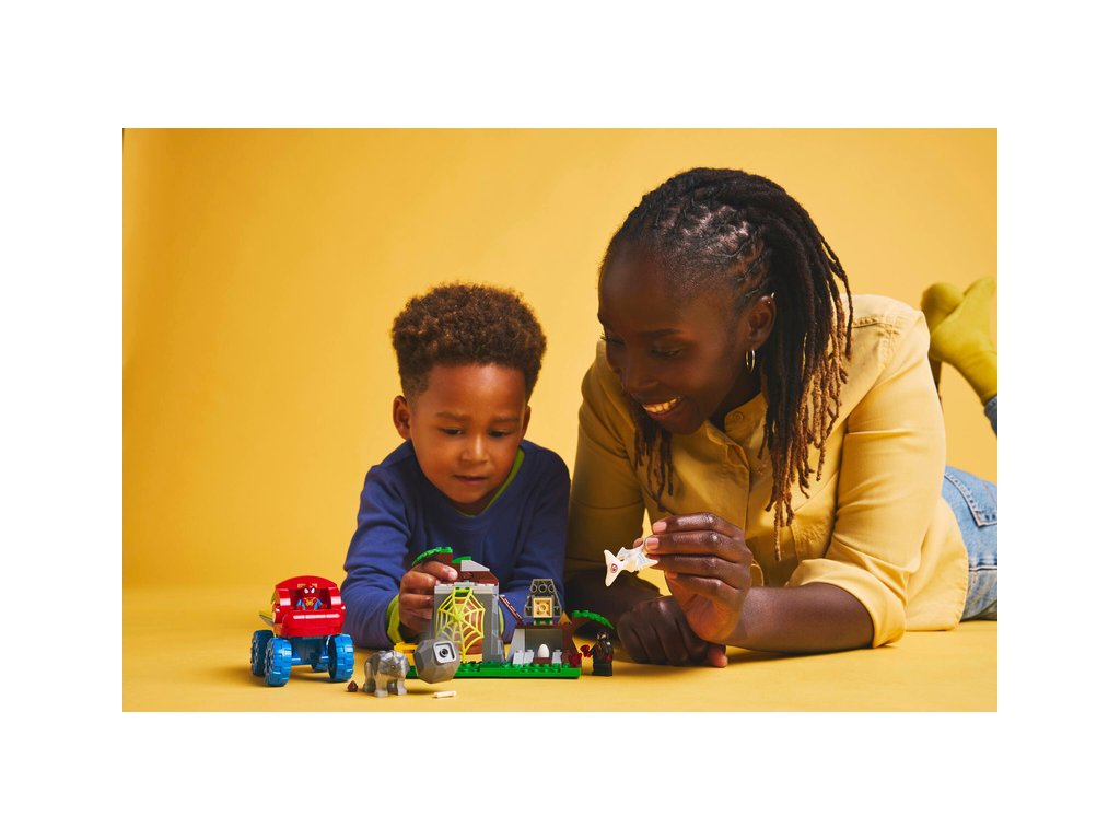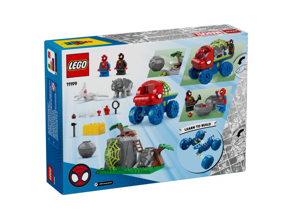 Tato stavebnice LEGO® obsahuje minifigurky Spideyho a Milese „Spin“ Moralese a 2 sestavitelné figurky dinosaurů: Ghost-Spider jako pterodaktyla a Rhina jako triceratopse. Součástí je také Spideyho truck LEGO s velkou pavučinou připevněnou k zadní straně, funkce padajícího kamene ovládaná spouští, dinosauří vejce, které je třeba odhalit, a pavučina, kterou můžete spustit a s její pomocí chytit padoucha do pasti. Nechybí intuitivní pokyny v podobě barevného obrázkového průvodce a samostatné sáčky s kostkami a velkou začátečnickou kostkou, se kterými se děti hned pustí do stavění.