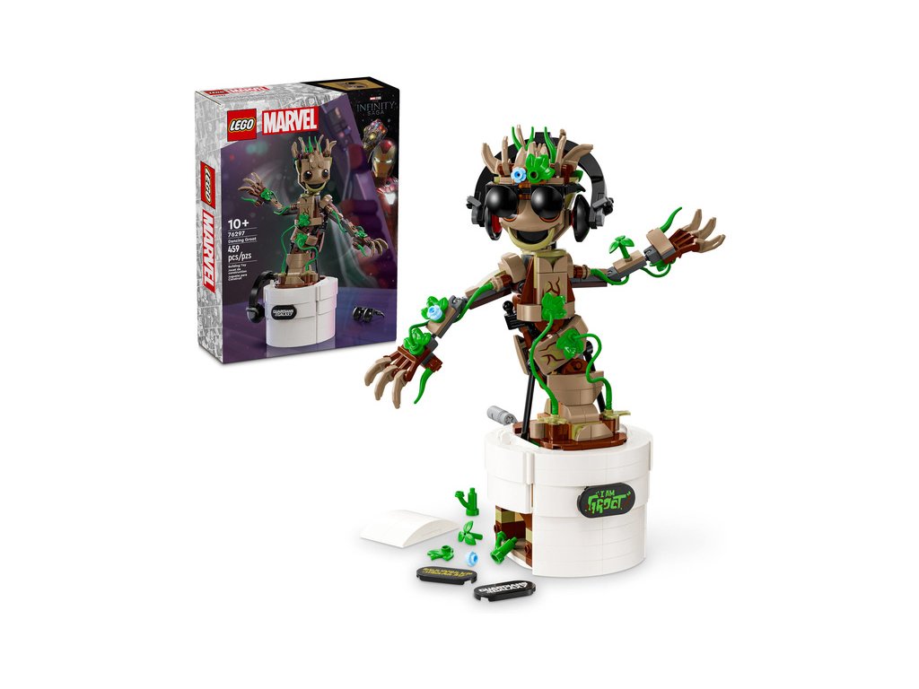 - Tančící superhrdina – Stavebnice obsahuje sestavitelného Groota v květináči, 3 různé popisky, které lze připevnit na květináč, a doplňky, včetně sluchátek, slunečních brýlí a doplňkových listů