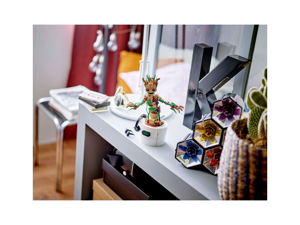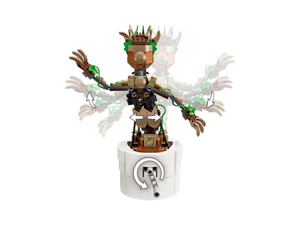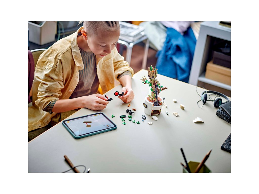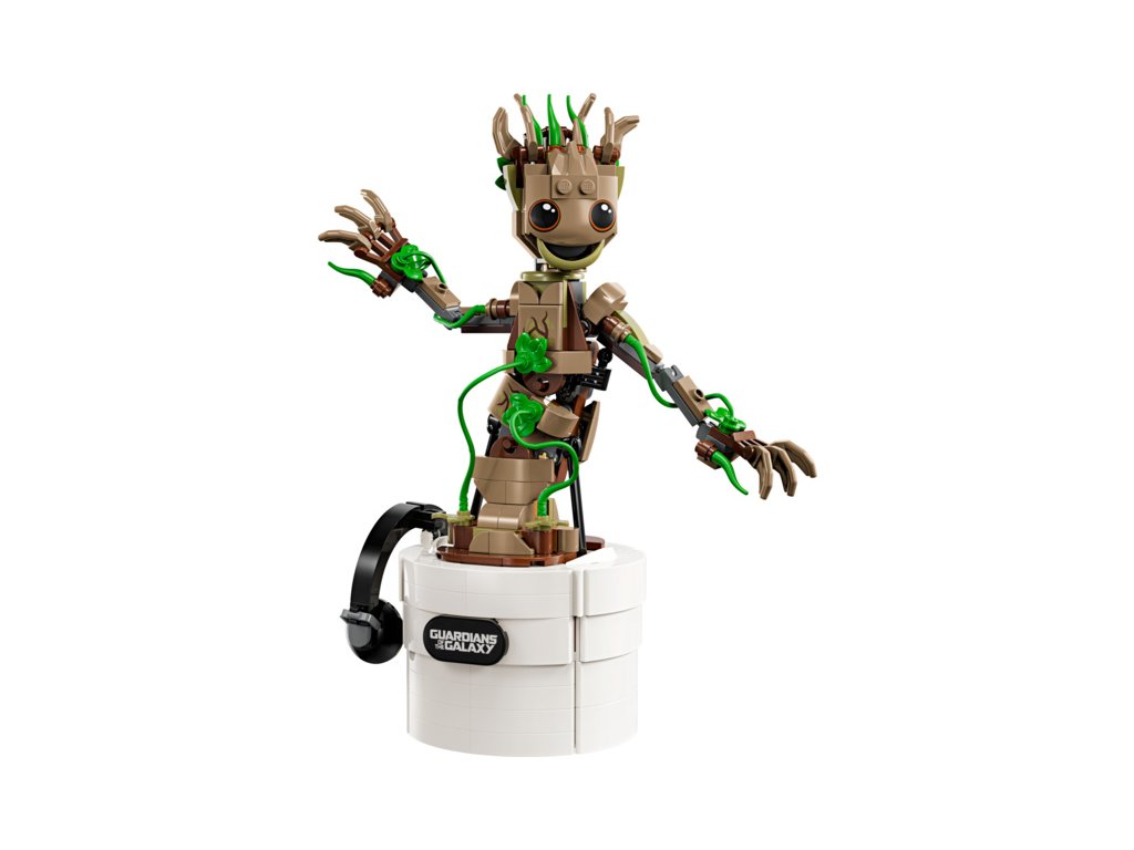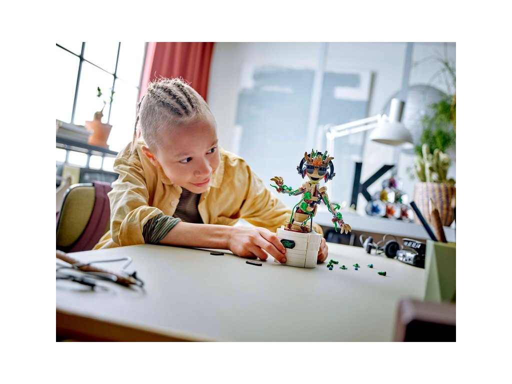 Model Groota pro děti má pohyblivou hlavu a pohyblivé paže. Když děti otočí držadlem na zadní straně květináče, kloubový Groot začne tančit. Figurku lze přizpůsobit pomocí doplňkových listů, sestavitelných sluchátek a slunečních brýlí a děti si mohou přizpůsobit Grootův květináč přidáním 1 ze 3 různých popisků na přední stranu (včetně jedné související s televizním seriálem Já jsem Groot). Veškeré toto příslušenství lze uložit do vestavěné přihrádky květináče. Aby bylo stavění modelu ještě zábavnější, aplikace LEGO Builder dětem umožňuje přibližovat a otáčet modely ve 3D a průběžně sledovat postup stavění.