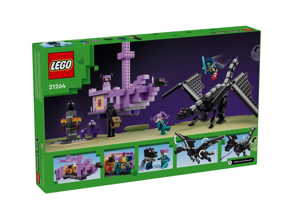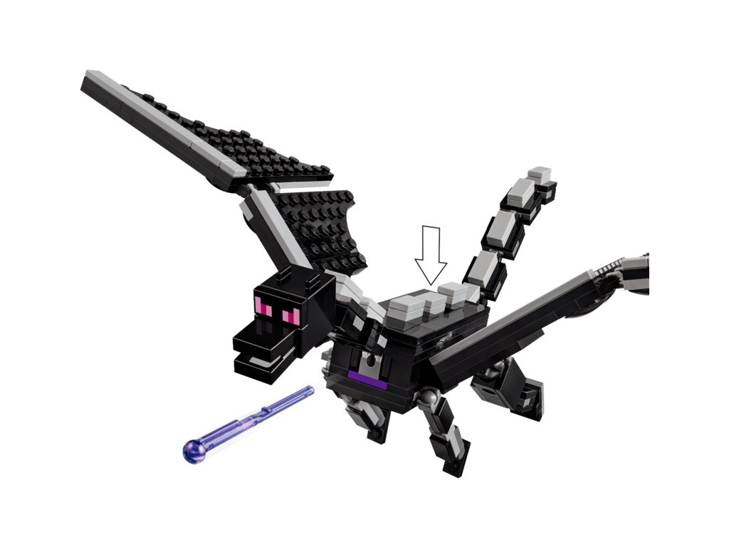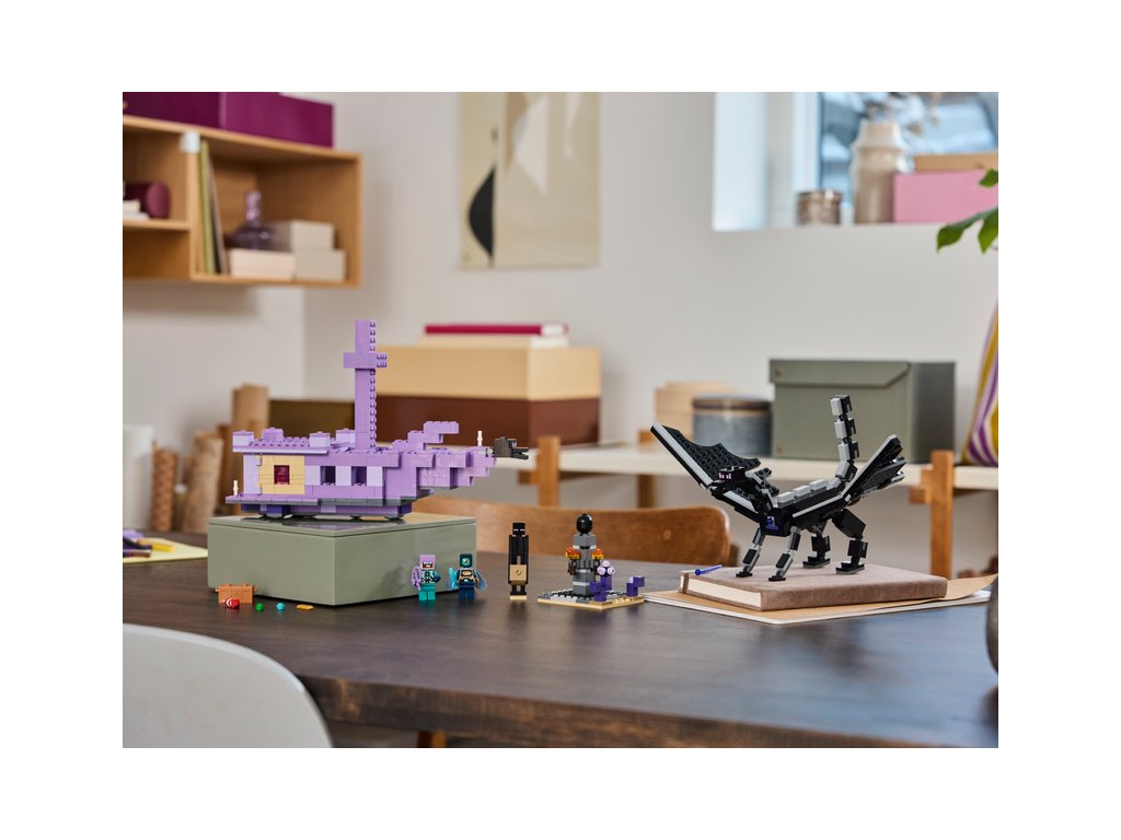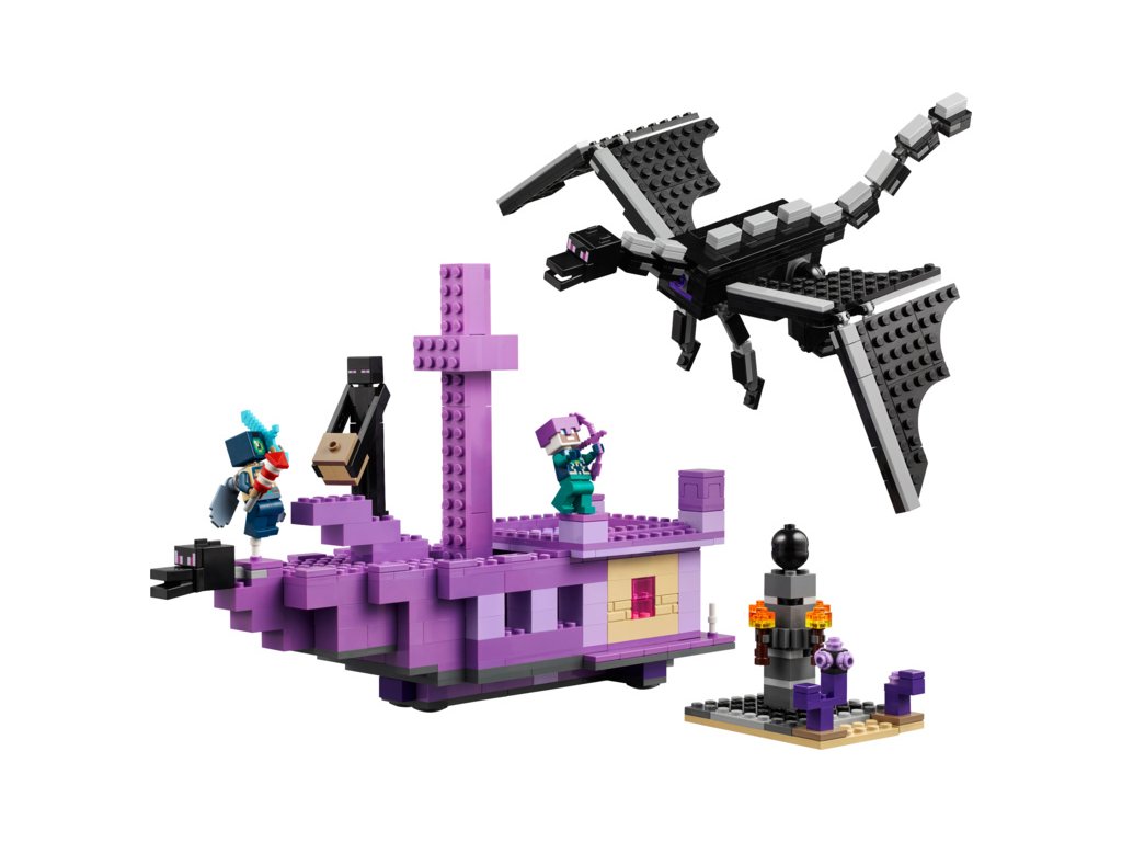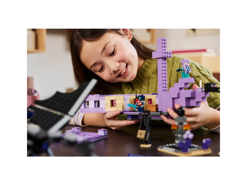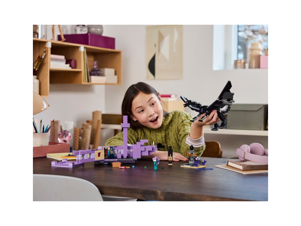 Hráči vstoupí do nebezpečného biomu End, kde se musí postavit drakovi z Enderu. Všechny končetiny této figurky s klouby jsou pohyblivé a upravitelné. Loď z Endu má plně vybavený interiér, do kterého vstoupíte skrz zvedací střechu a otevírací boční strany. Dračí hlavu z přídě lze odejmout a nosit ji jako přilbu. Uvnitř děti najdou varný stojan s lektvary zdraví. Mezi postavy z Minecraftu najdete průzkumníka Enderu s krovkami a ohňostrojovou raketou, rytíř zEnderu, Shulker a Enderman. Součástí je také cenné dračí vejce. Více digitální zábavy si stavitelé užijí s interaktivní aplikací LEGO® Builder, ve které mohou přibližovat a otáčet modely ve 3D a sledovat svůj pokrok.