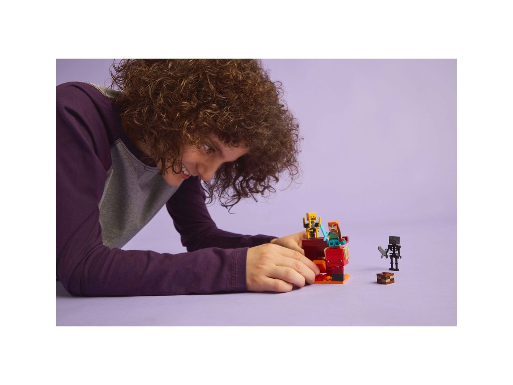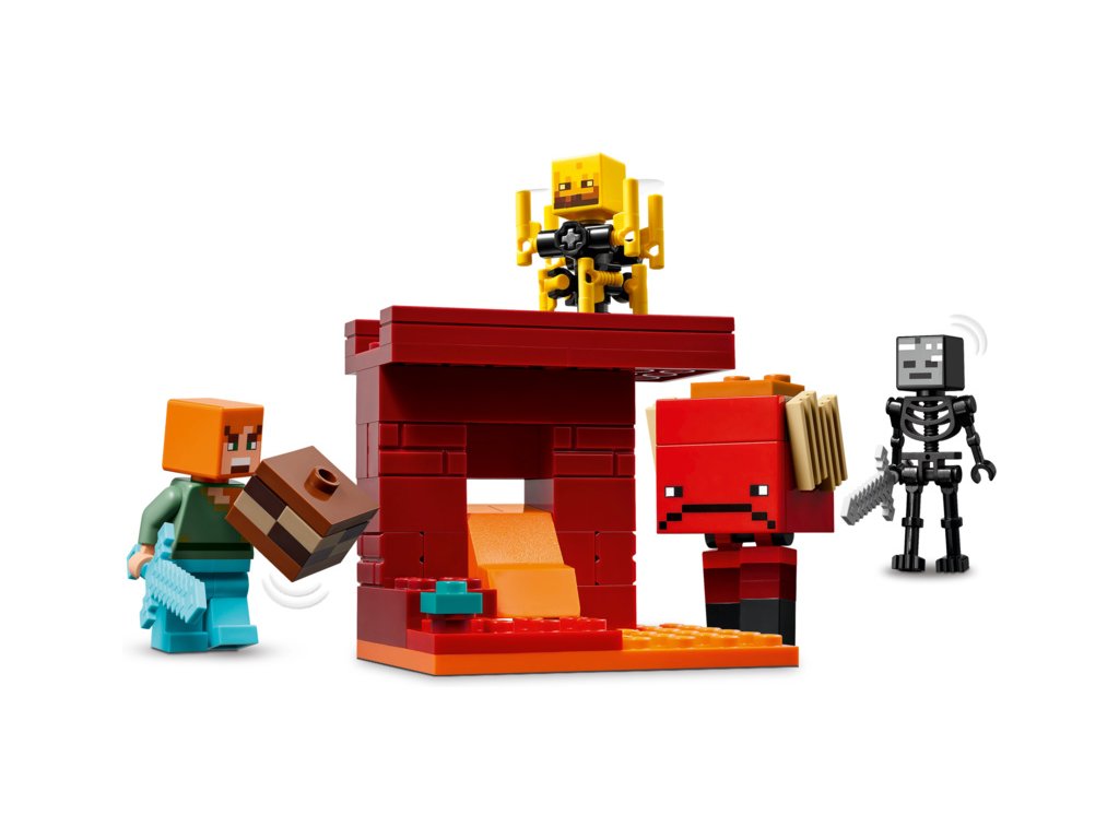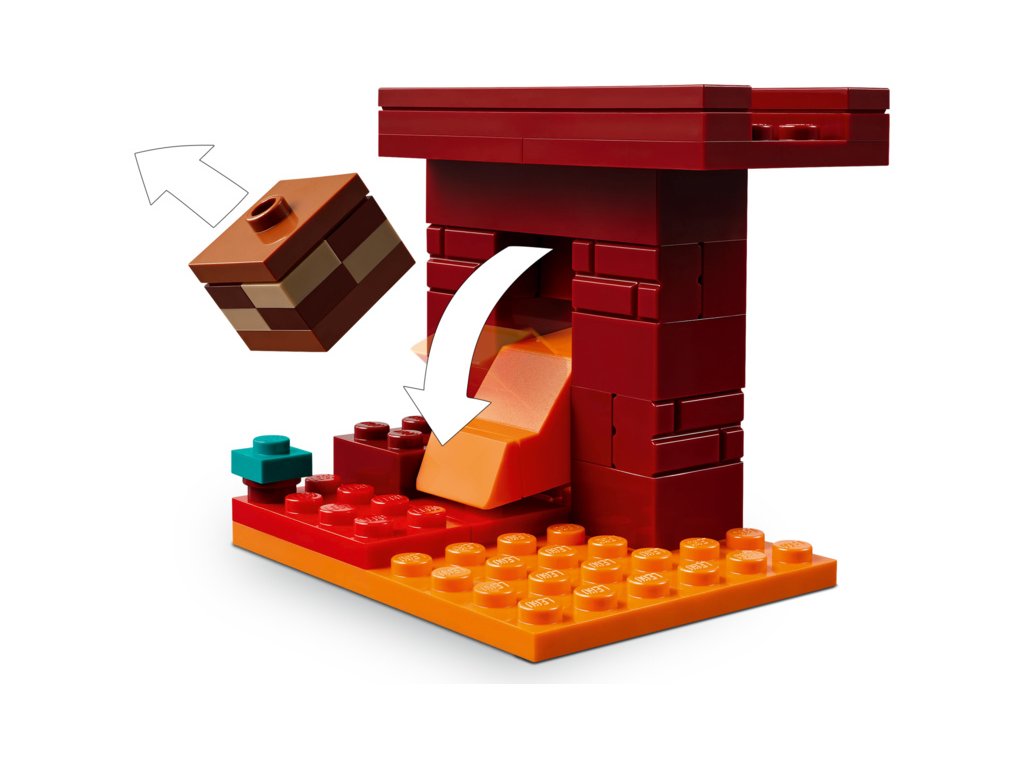 Děti se připojí k akční hrdince Alex z Minecraftu a společně odstraní starobylé trosky z části mostu z pevnosti v Netheru v karmínovém lese. Až trosky odstraníte, prvky lávy se začnou automaticky řídit dolů a figurky z Minecraftu – wither kostlivec s kamenným mečem a blaze s točící se tyčí – zablokují Alex východ. Děti budou bojovat s moby pomocí slavného diamantového meče a pak utečou na další figurce z Minecraftu, chodci s pohyblivýma nohama a sedlem. Hráči musí získat podivné houby, aby mohli chodce řídit. Pro ještě větší digitální zábavu umožňuje aplikace LEGO Builder dětem přibližovat a otáčet modely ve 3D pomocí jejich zařízení.