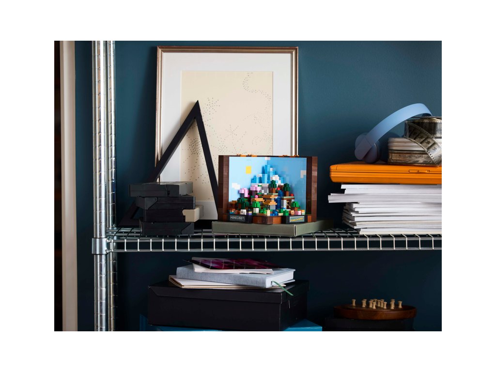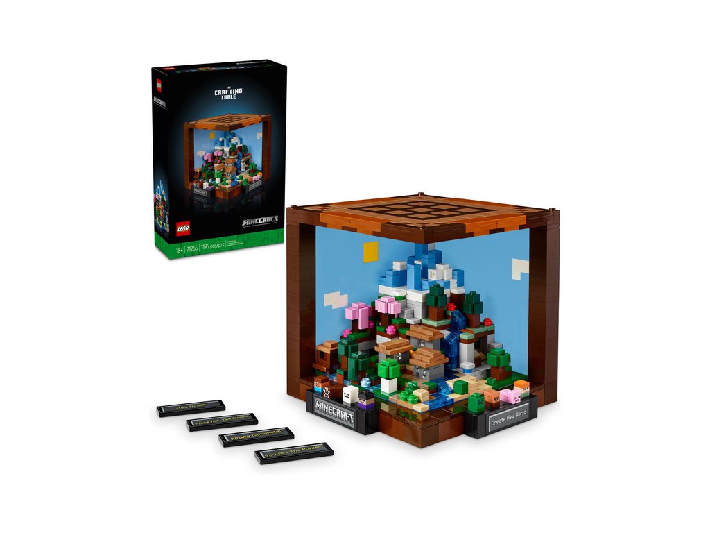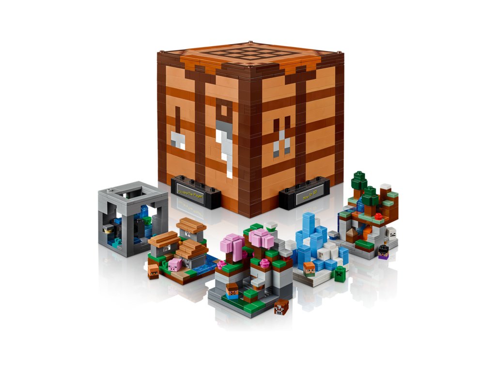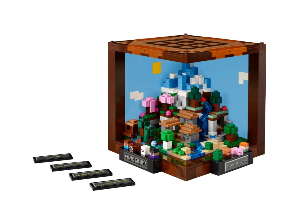 Tato stavebnice ztvárňuje legendární pracovní stůl z oblíbené videohry. Součástí je 5 mini modelů s 12 biomy z Minecraftu, včetně tajgy s krápníkovou jeskyní, pláně s vesnicí, ledových hrotů s iglú, třešňového háje s opuštěnou důlní šachtou a Deep Dark se zarostlou jeskyní. Nechybí 8 mikrofigurek: Steve, Alex, kostlivec, čarodějnice, Creeper™, vesničan, kráva a prase. Mini modely a mikrofigurky lze odpojit od hlavního modelu a stavebnici si tak upravit a vystavit různými způsoby. Na přední stranu tohoto modelu inspirovaného Minecraftem lze nalepit samolepky se známými hláškami ze hry. Aplikace LEGO Builder obsahuje digitální verzi návodu na stavění, který je součástí stavebnice.