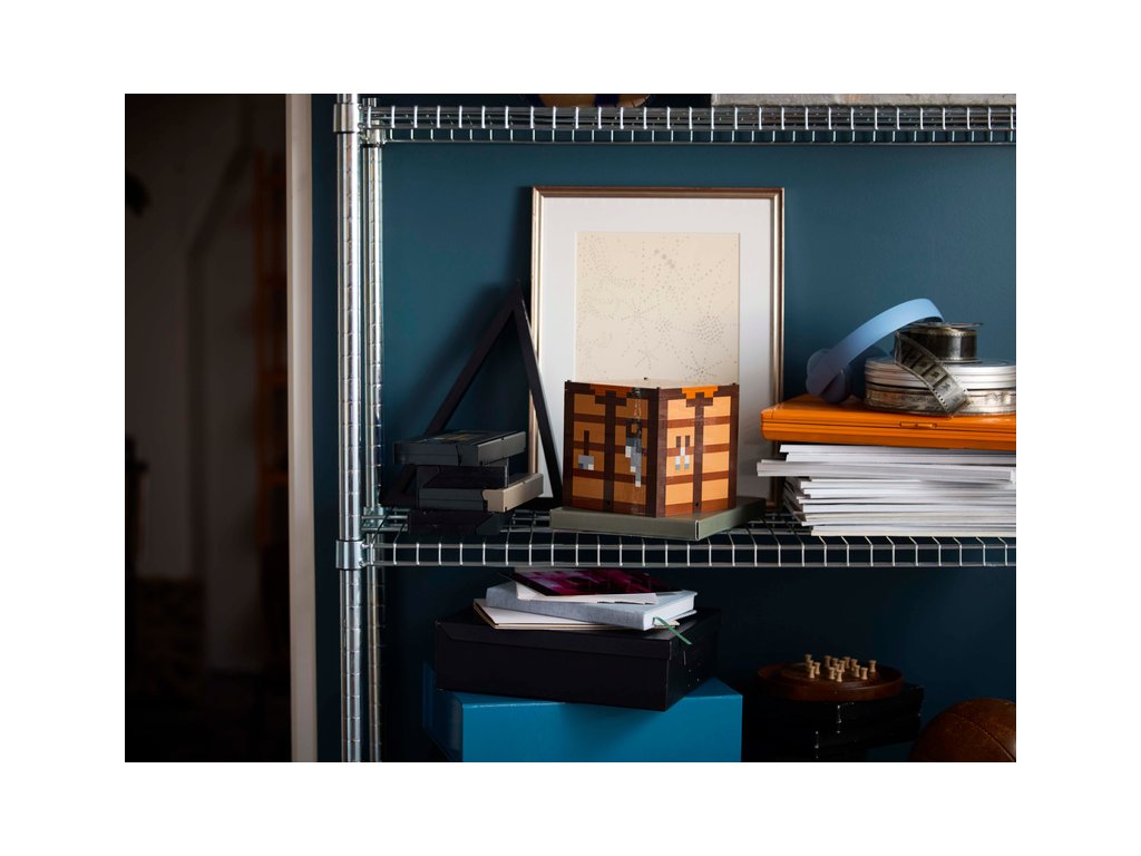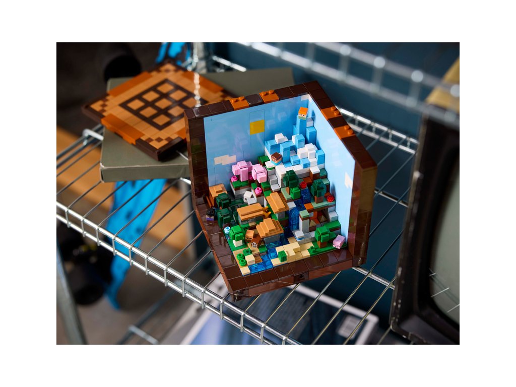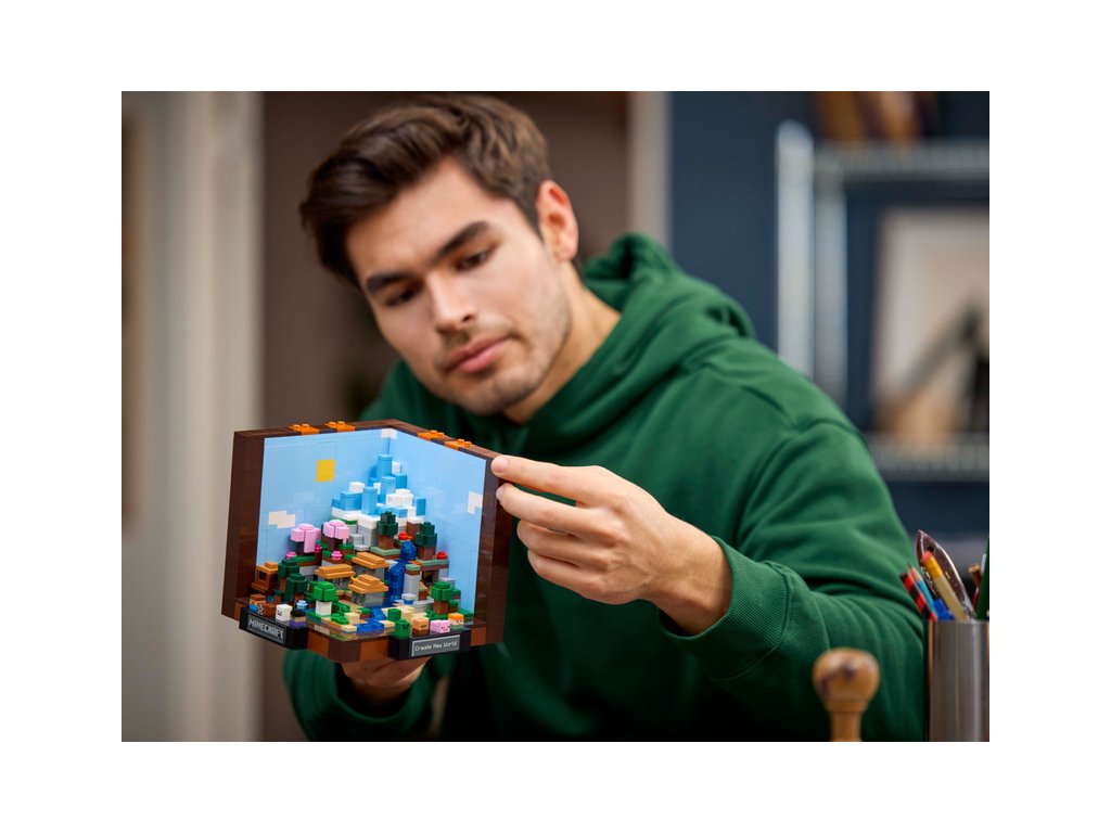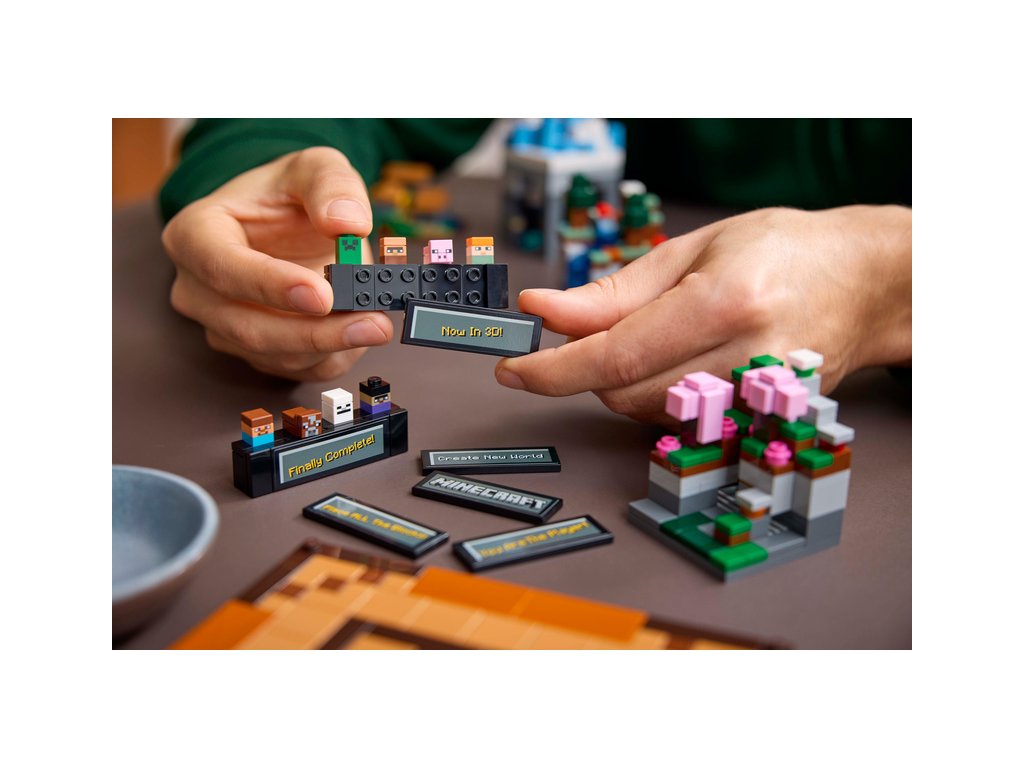 Tato stavebnice ztvárňuje legendární pracovní stůl z oblíbené videohry. Součástí je 5 mini modelů s 12 biomy z Minecraftu, včetně tajgy s krápníkovou jeskyní, pláně s vesnicí, ledových hrotů s iglú, třešňového háje s opuštěnou důlní šachtou a Deep Dark se zarostlou jeskyní. Nechybí 8 mikrofigurek: Steve, Alex, kostlivec, čarodějnice, Creeper™, vesničan, kráva a prase. Mini modely a mikrofigurky lze odpojit od hlavního modelu a stavebnici si tak upravit a vystavit různými způsoby. Na přední stranu tohoto modelu inspirovaného Minecraftem lze nalepit samolepky se známými hláškami ze hry. Aplikace LEGO Builder obsahuje digitální verzi návodu na stavění, který je součástí stavebnice.