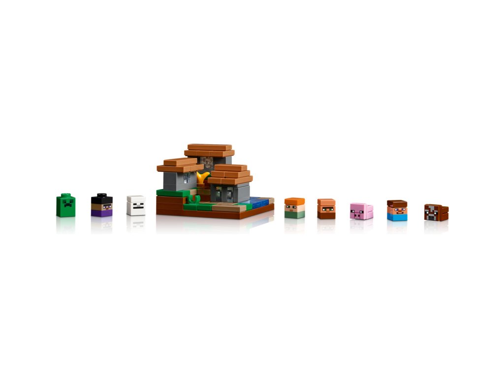 - Model ze světa Minecraft® na hraní i na výstavku – 5 mini modelů a 8 mikrofigurek (Steve, Alex, kostlivec, čarodějnice, Creeper™, vesničan, kráva a prase), které lze z modelu vyjmout a stavebnici si tak upravit a vystavit různými způsoby