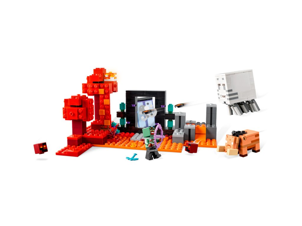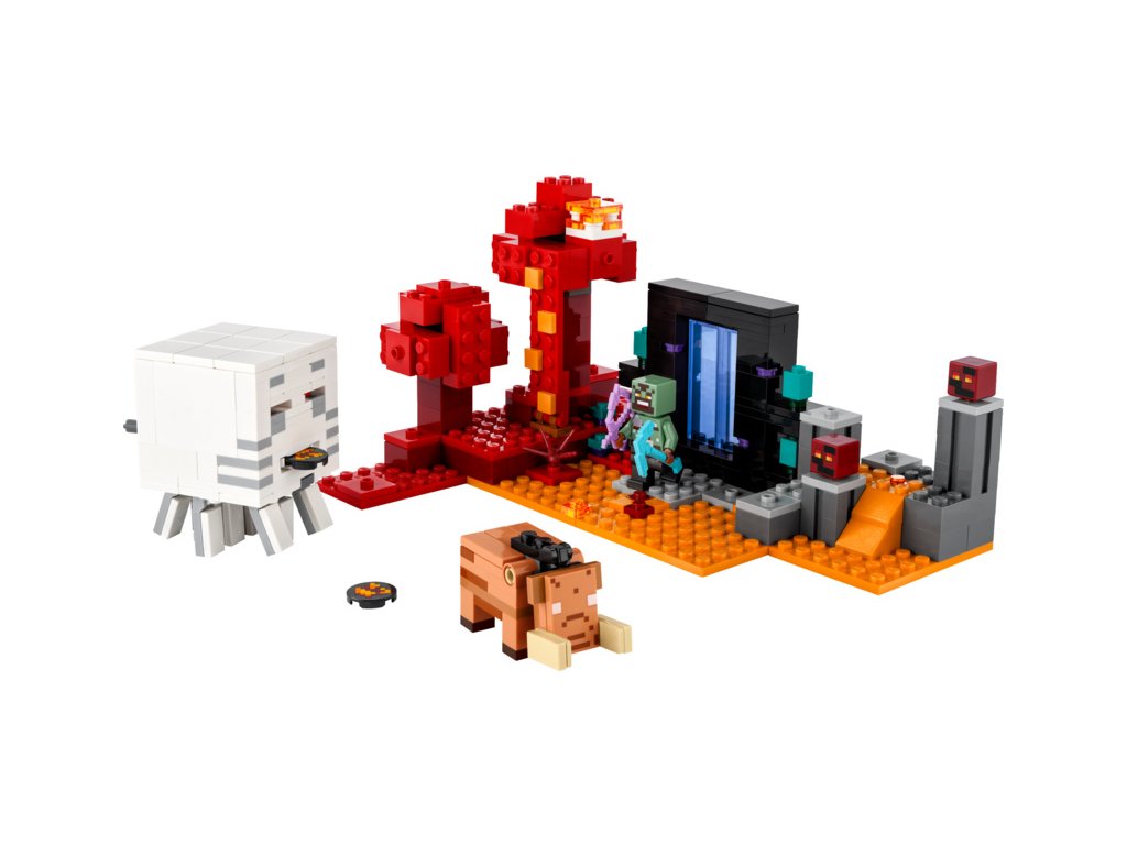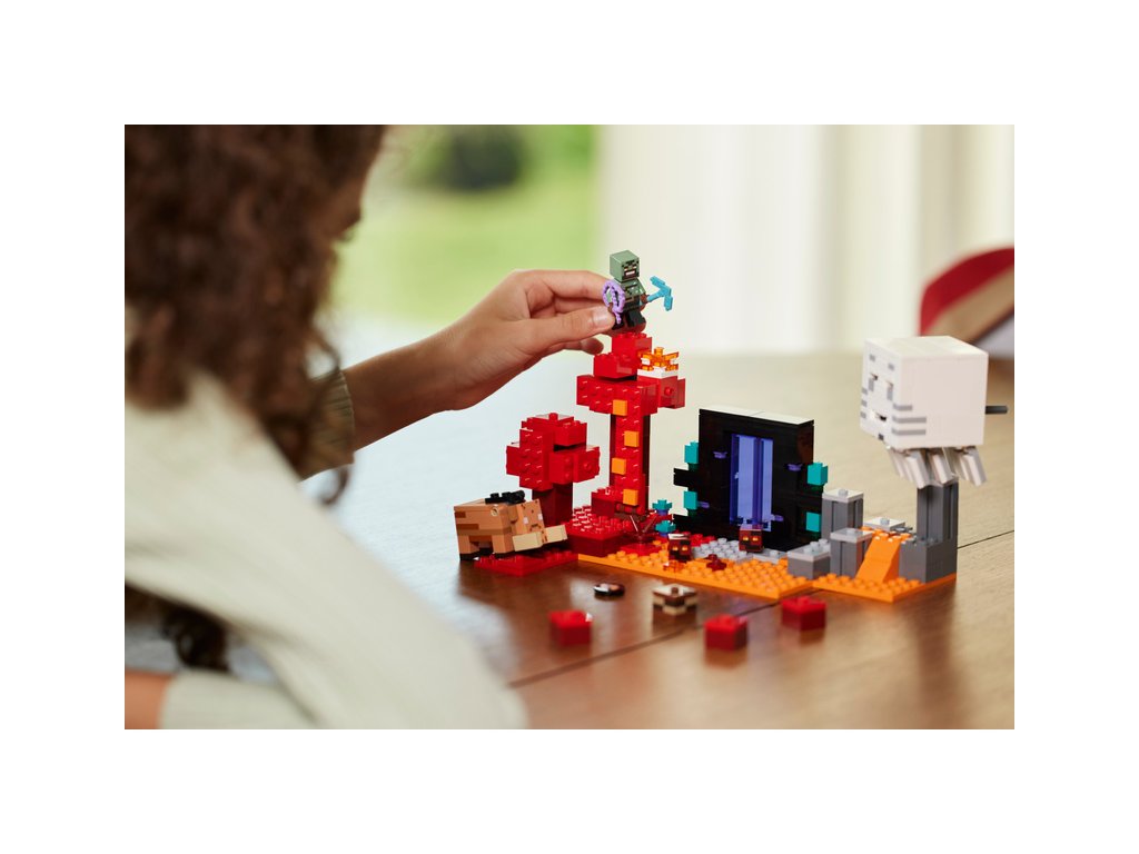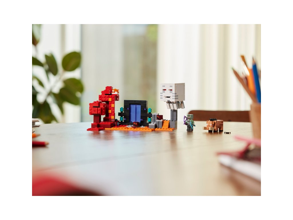 Součástí stavebnice je figurka skřetího válečníka s vlastním skinem, který se vydá portálem do Netheru na hranici mezi karmínovým lesem a čedičovými deltami. Hráči se mohou pustit do průzkumu stromů plných hub a bojovat s řadou oblíbených mobů, na které během putování narazí: 2 pekelné slizy, hoglinem, jehož útoky hlavou se ovládají prstem, a figurkou ďasa, která z tlamy střílí disky. Ďas má ve zvyku ničit portály – pozor, aby vás navždy neuvěznil! Malí stavitelé si oblíbí aplikaci LEGO Builder, ve které mohou přibližovat a otáčet stavebnice ve 3D a sledovat svůj pokrok.