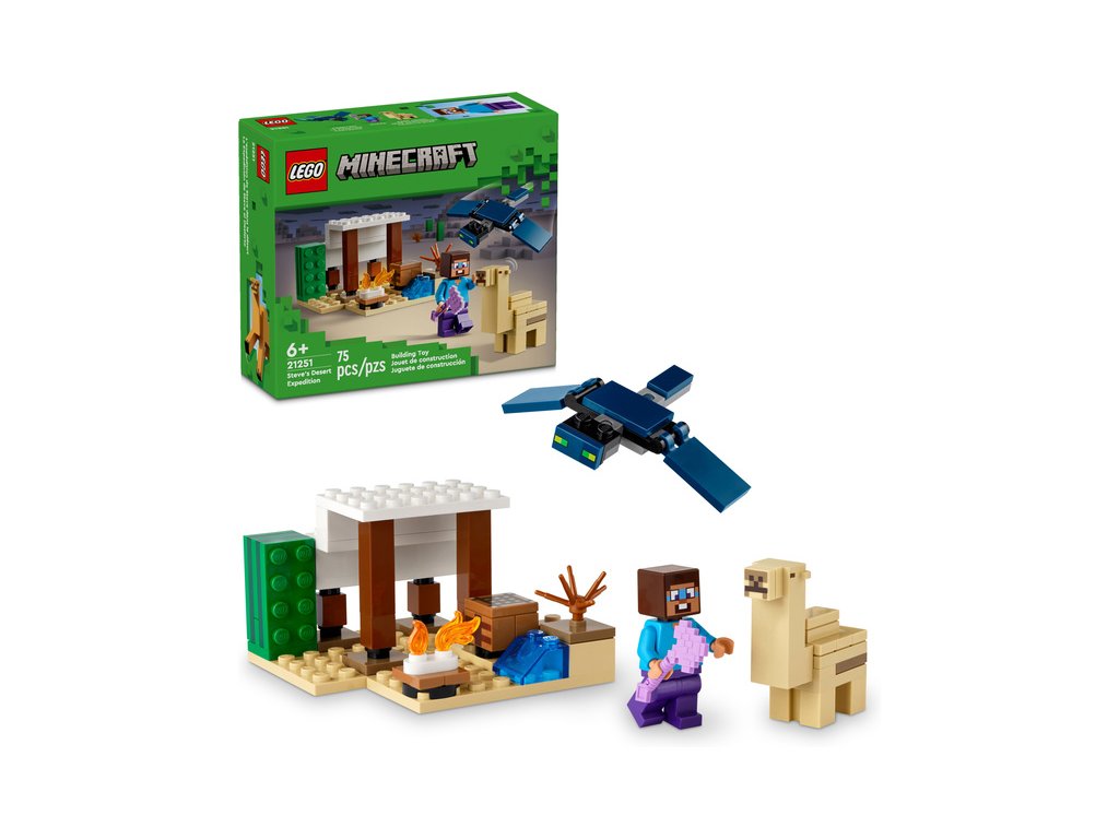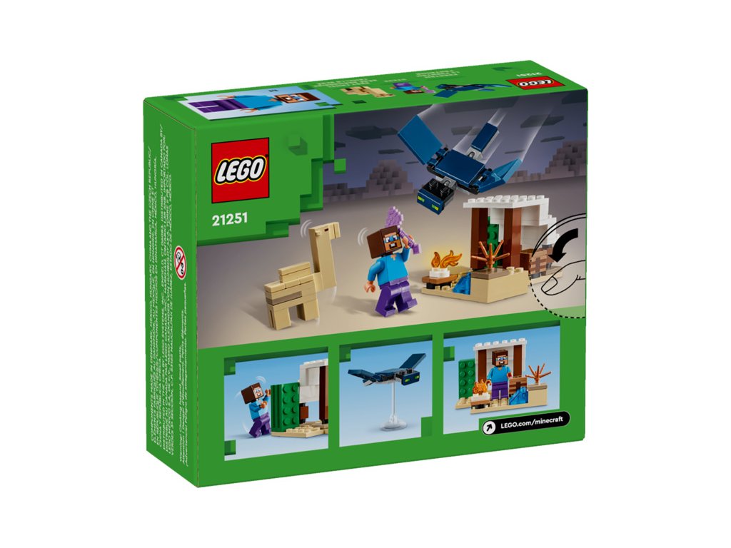 Tato stavebnice LEGO® Minecraft® pro malé stavitele od 6 let je zcela první sada s biomem pouště ze světa Minecraftu. Steve a výprava do pouště (21251) děti inspiruje k postavení domku v nehostinném prostředí, který poté musí ubránit před létajícím Přízrakem.