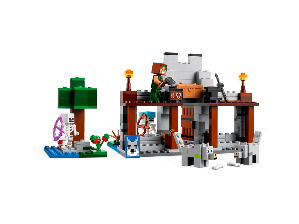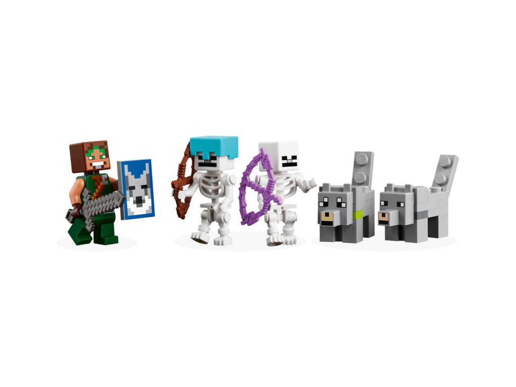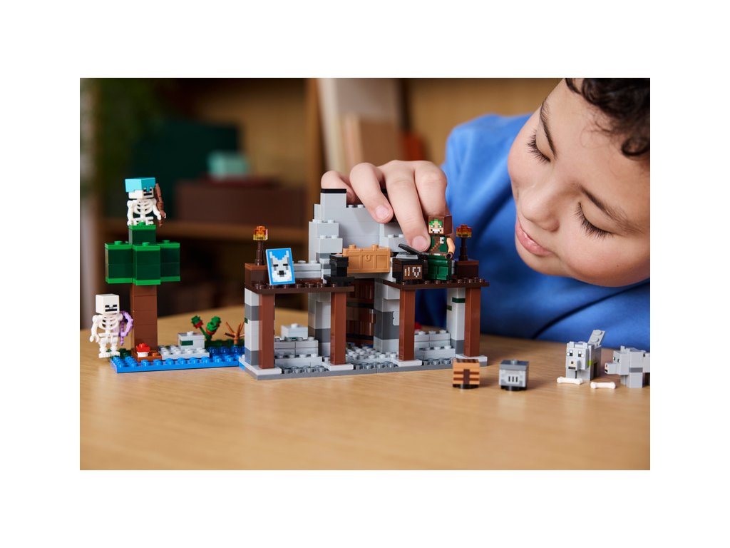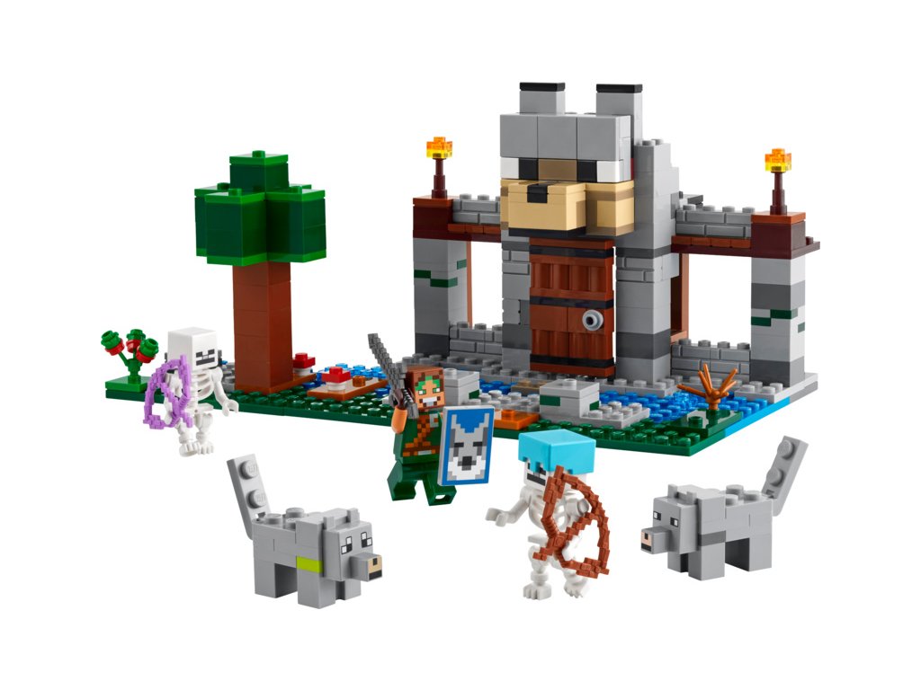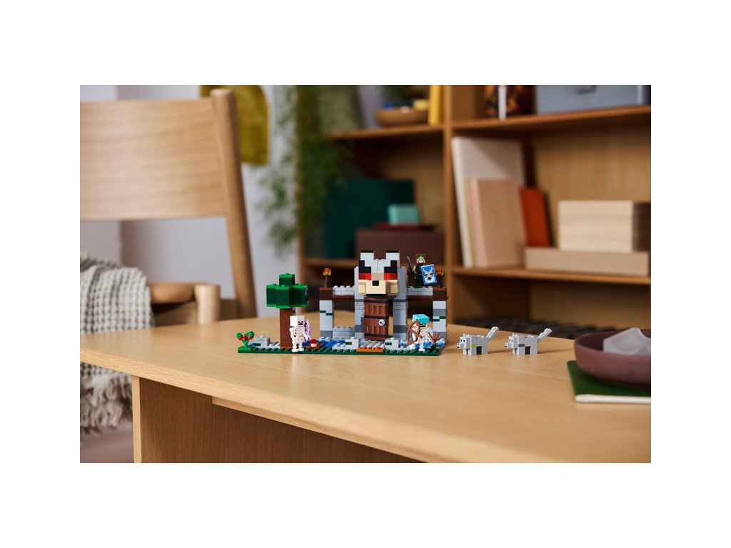 Děti si postaví základnu krotitelů vlků s velkou vlčí hlavou nad vchodem. Poté se zabaví vyměňováním výrazu tváře vlka z přátelské na rozzlobenou. Uvnitř najdete stůl na tvoření, vysokou pec, kovadlinu a zcela poprvé ve stavebnici LEGO Minecraft také kovářský stůl. V truhle se zásobami najdete netheritový ingot, ze kterého děti mohou vyrobit meč, sladké plody a kosti, které zkrotí divokého vlka. Venku se nachází část lesa se stromem, balvanem, houbou a keříkem s bobulkami. Po lese se potulují 2 figurky kostlivců ze světa Minecraft – jeden se začarovaným lukem a druhý s lukem, šípem a diamantovou přilbou. Více digitální zábavy stavitelé najdou v intuitivní aplikaci LEGO Builder.
