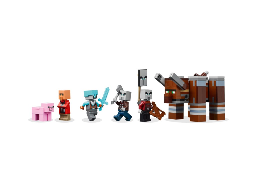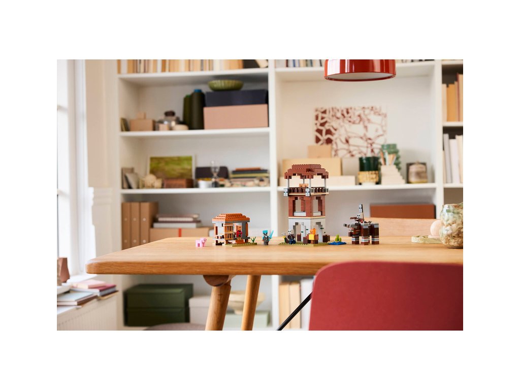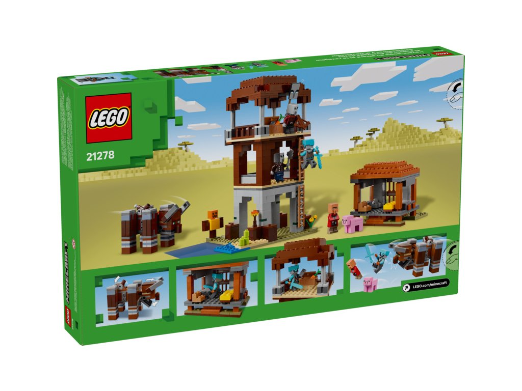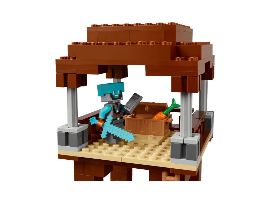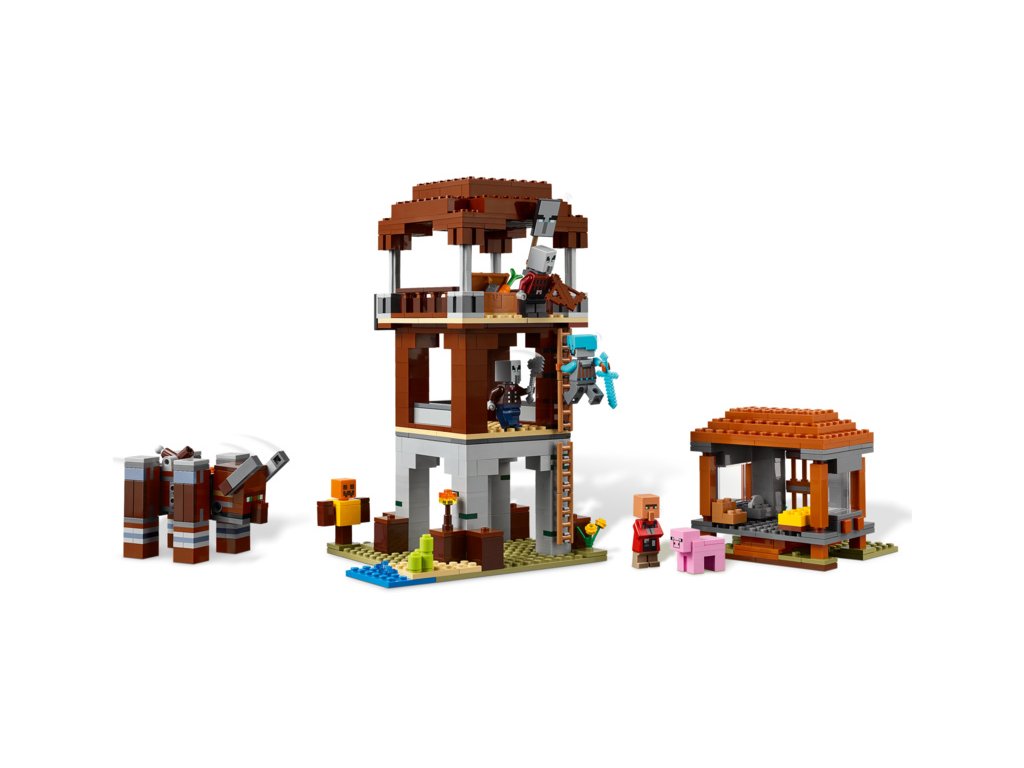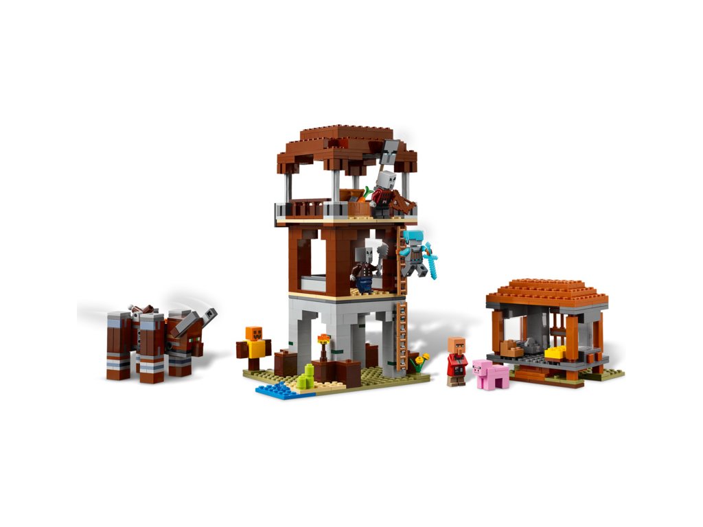 Stavebnice obsahuje 4 minifigurky LEGO Minecraft: vesmírného strážce, kapitána nájezdu, vesničana zedníka a mstitele. Sestavitelná figurka Ničitele má funkci ovládanou pákou, která dětem umožňuje provádět pohyby, při kterých figurka práská čelistí a naráží hlavou. Strážní věž obsahuje žebříky, které umožňují přístup do tří pater, prapory s tvářemi plenitelů a truhlu s drahocennou kořistí. Dům zedníka má otevírací dveře a zařízený interiér s postelí a řezačkou kamení. Součástí je také figurka prasete LEGO Minecraft a doplňky včetně cvičné figuríny, pochodně, mrkve, železného ingotu, diamantové helmy, diamantového meče, kuše a železné sekery. S aplikací LEGO Builder si děti užijí ještě větší porci zábavy a umožní jim na zařízení přibližovat a otáčet modely ve 3D. Součástí je 665 dílků.