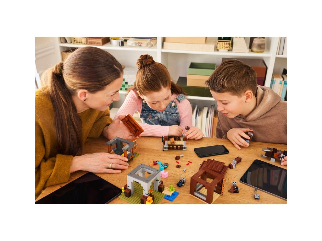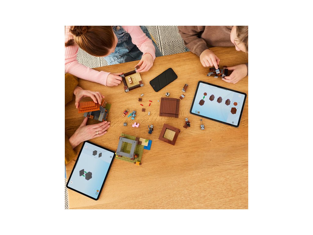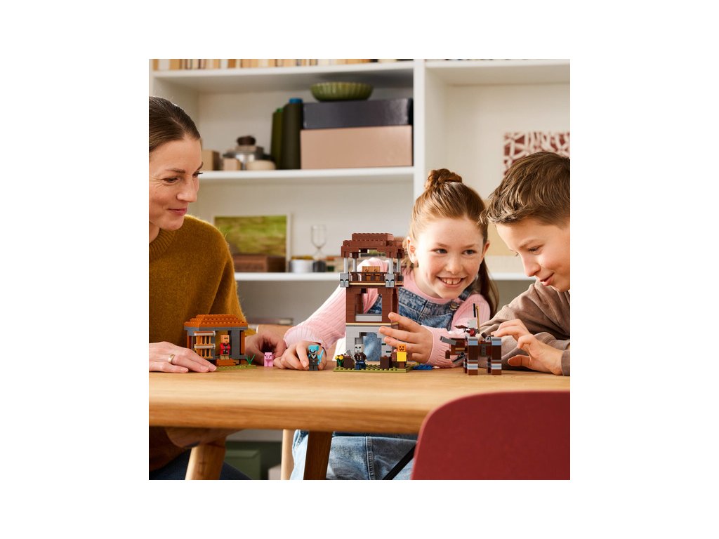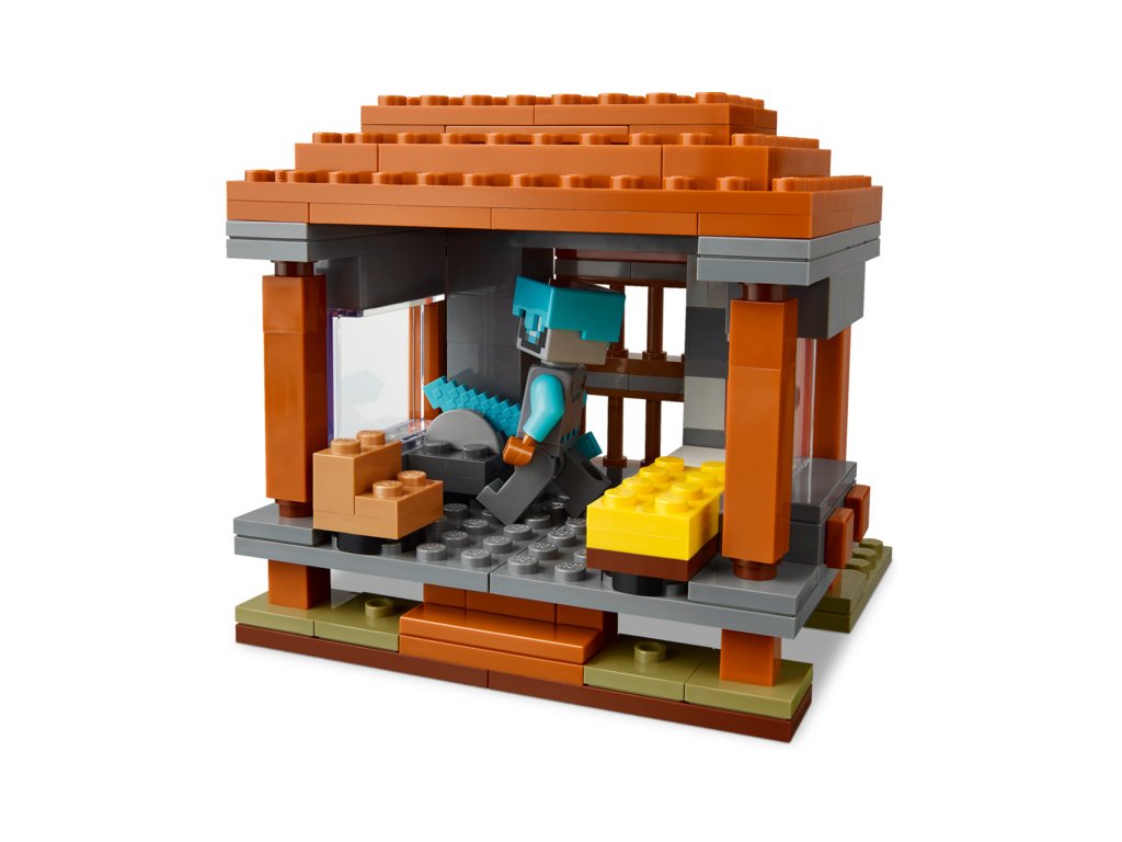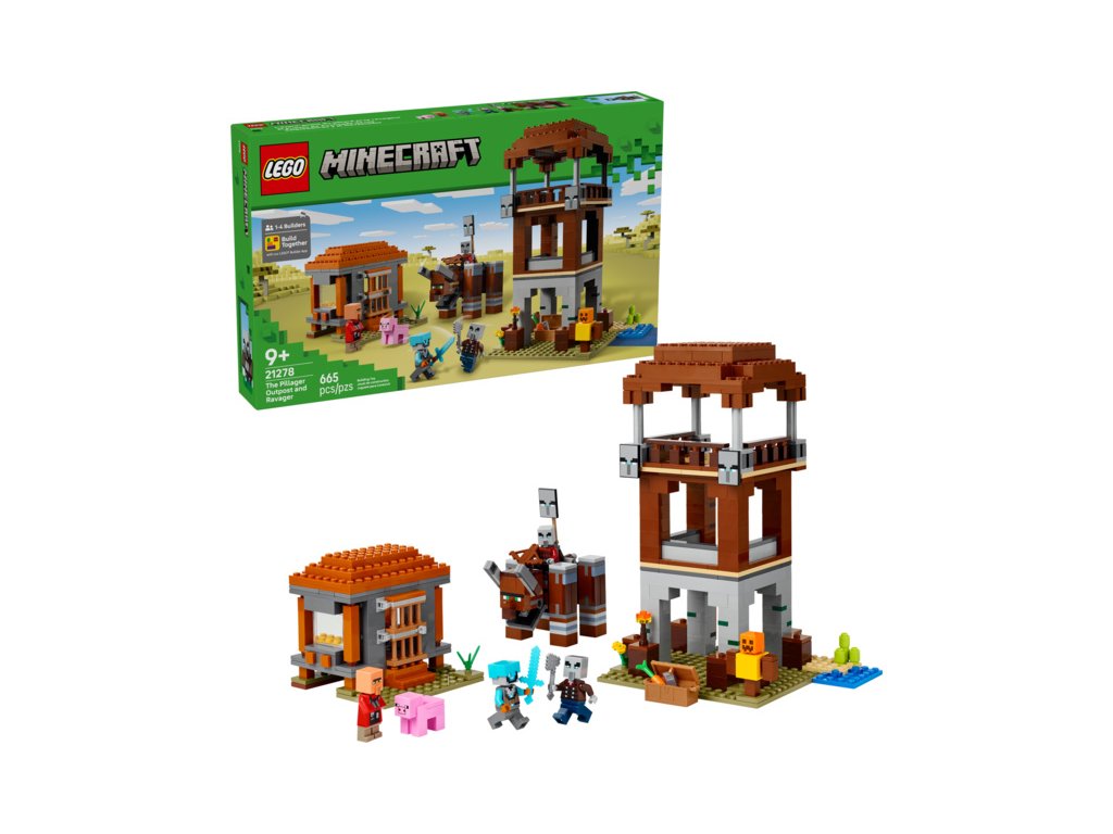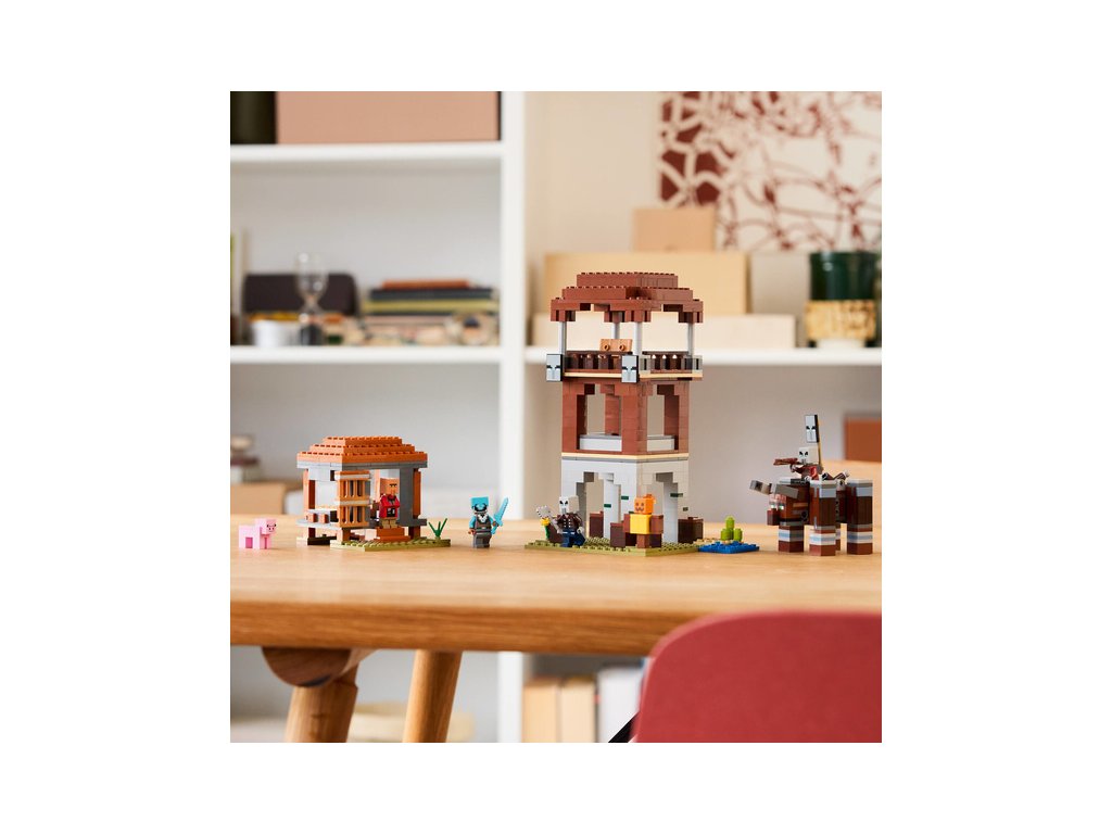 Stavebnice obsahuje 4 minifigurky LEGO Minecraft: vesmírného strážce, kapitána nájezdu, vesničana zedníka a mstitele. Sestavitelná figurka Ničitele má funkci ovládanou pákou, která dětem umožňuje provádět pohyby, při kterých figurka práská čelistí a naráží hlavou. Strážní věž obsahuje žebříky, které umožňují přístup do tří pater, prapory s tvářemi plenitelů a truhlu s drahocennou kořistí. Dům zedníka má otevírací dveře a zařízený interiér s postelí a řezačkou kamení. Součástí je také figurka prasete LEGO Minecraft a doplňky včetně cvičné figuríny, pochodně, mrkve, železného ingotu, diamantové helmy, diamantového meče, kuše a železné sekery. S aplikací LEGO Builder si děti užijí ještě větší porci zábavy a umožní jim na zařízení přibližovat a otáčet modely ve 3D. Součástí je 665 dílků.