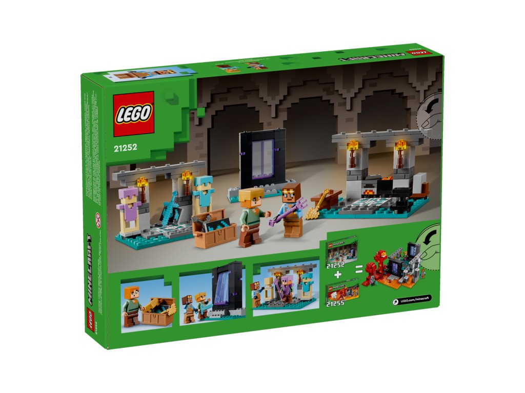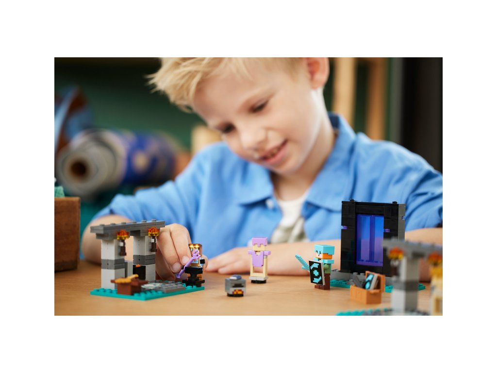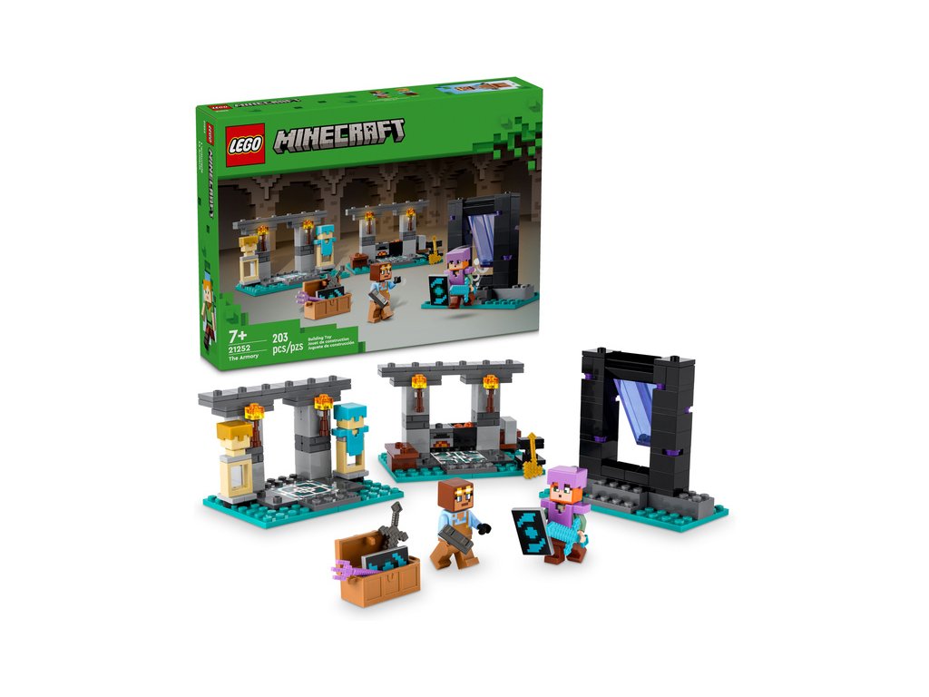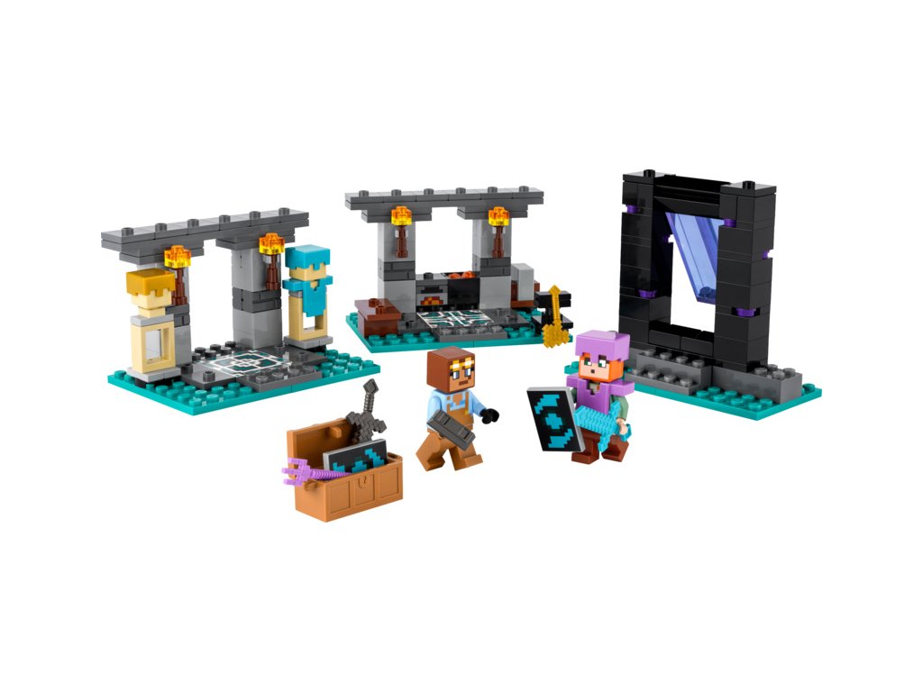 Součástí této stavebnice na motivy videohry Minecraft jsou 2 oblíbené postavy: akční hrdinka Alex se štítem a diamantovým mečem a pracovitý kovář brnění. Sada se skládá ze 3 částí: Z kovárny s kovadlinou, pecí, brusným kamenem a kotlíkem s lávou, ze zbrojnice s truhlou se zlatou sekerou, začarovaným trojzubcem, netheritovým mečem, štítem a dalšími prvky ze světa Minecraft a z portálu do Netheru s dveřmi, které malé stavitele dovedou k dalšímu dobrodružství.