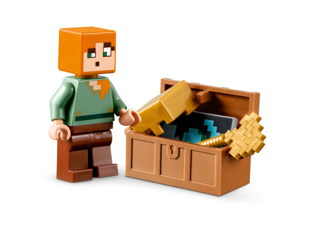 - Akční hrdina – V balení najdete minifigurky Minecraft® Alex a kováře brnění, 3 sestavitelná prostředí a brnění a zbraně, včetně zlaté sekery, 2 mečů, 2 štítů a začarovaného trojzubce