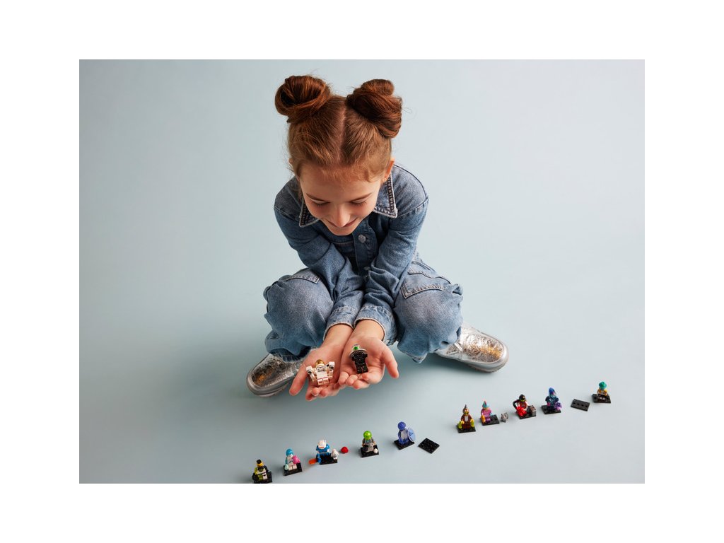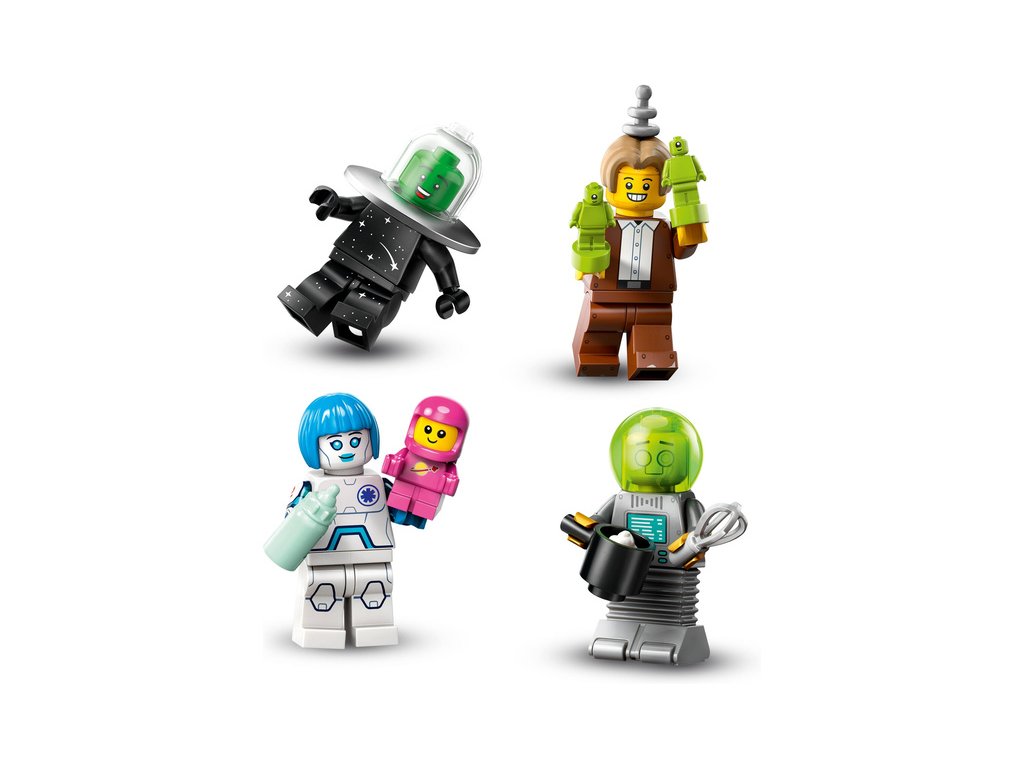 V každém balení najdete 1 vesmírnou minifigurku LEGO z 12 postav: Mutant Blacktron, průzkumnice ledové planety, podvodník, robotický komorník, mimozemský Broukozoid, retro vesmírná hrdinka, android sestřička, fanoušek v kostýmu létajícího talíře, M-Tron powerlifter, mimozemšťan turista, Orion a astronaut na vesmírné procházce.