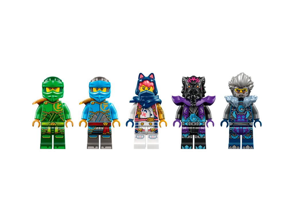 - 5 minifigurek LEGO® NINJAGO® – Děti si mohou hrát na bitvy nindža válečníků Lloyda, Sory a Nyi s katanami proti lordu Rasovi s kladivem a Cinderem s mečem