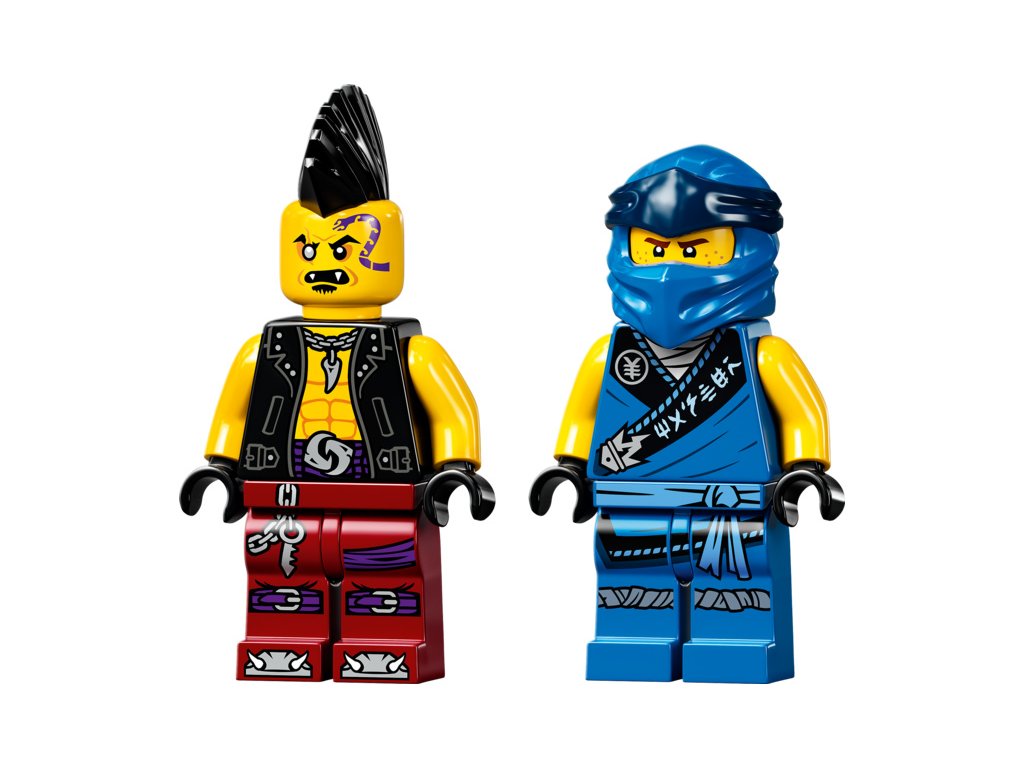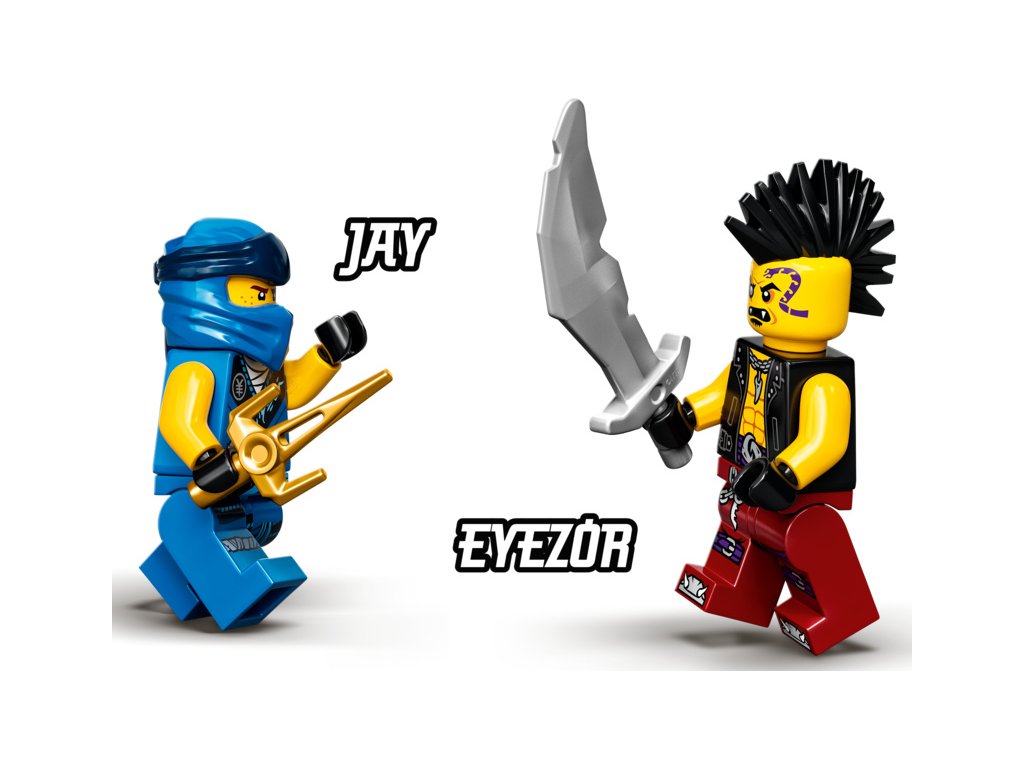 - Akční stavebnice obsahuje 2 minifigurky postav ze 4. řady televizního seriálu NINJAGO®: nindžu Jaye a zlého Eyezora. Součástí je také speciální začátečnická kostka, díky které bude sestavení modelu hračka.