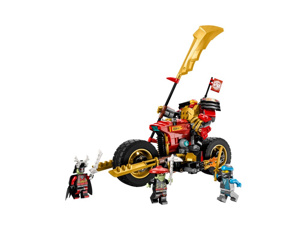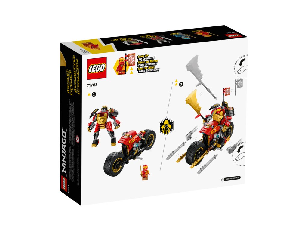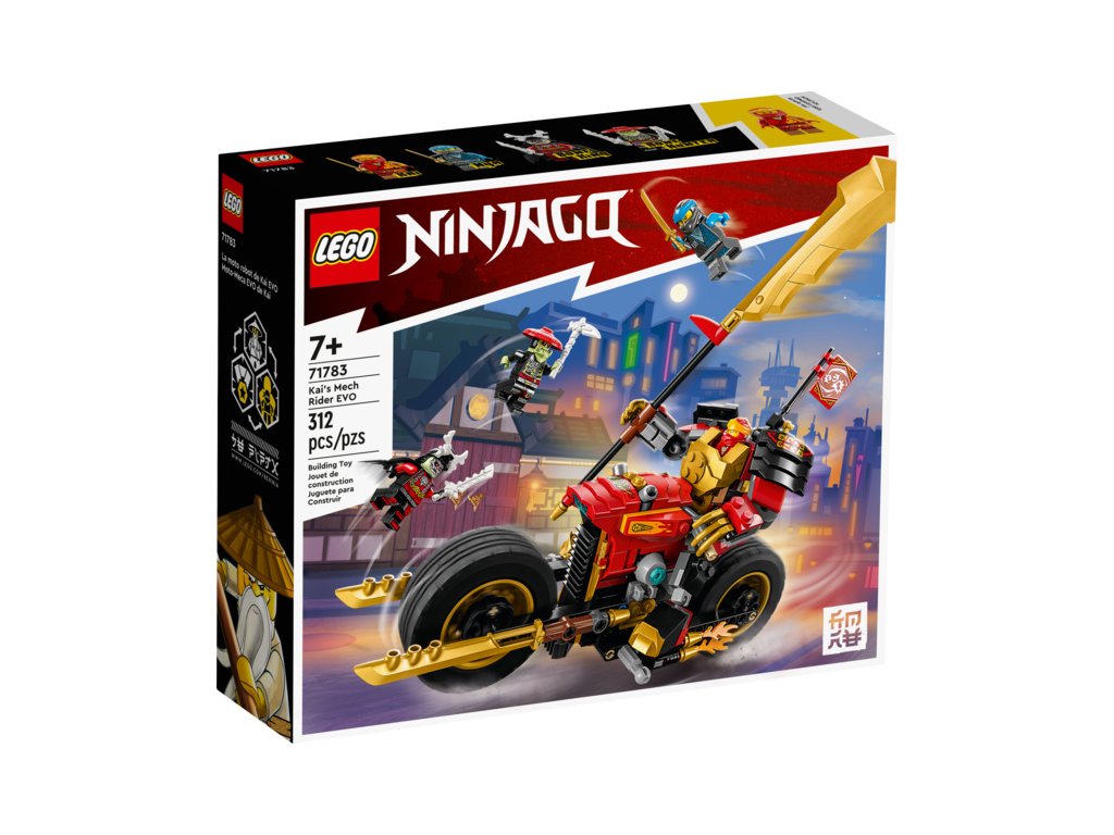 Malí stavitelé od 7 let a fanoušci parádních strojů si budou s akční stavebnicí Kaiova robomotorka EVO (71783) přehrávat své vlastní souboje dobra proti zlu. K dispozici budou mít pohyblivého robota a parádní motorku, kterou lze vylepšit na ještě výkonnější stroj s pomocí zlatých bočních panelů a obrovské zlaté čepele.