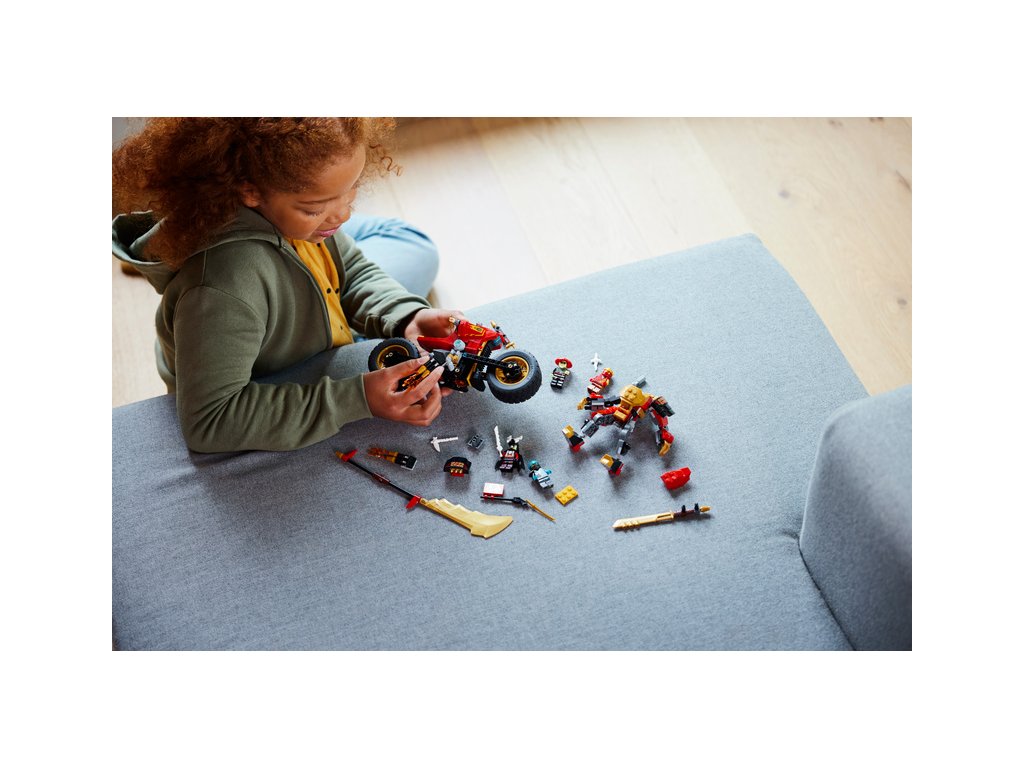 - Nindžovská motorka – Děti a milovníci motorek ve stavebnici Kaiova robomotorka EVO z řady NINJAGO® (71783) najdou vše, co mohou potřebovat k přehrávání napínavých bitev, včetně nindžovské motorky a robota