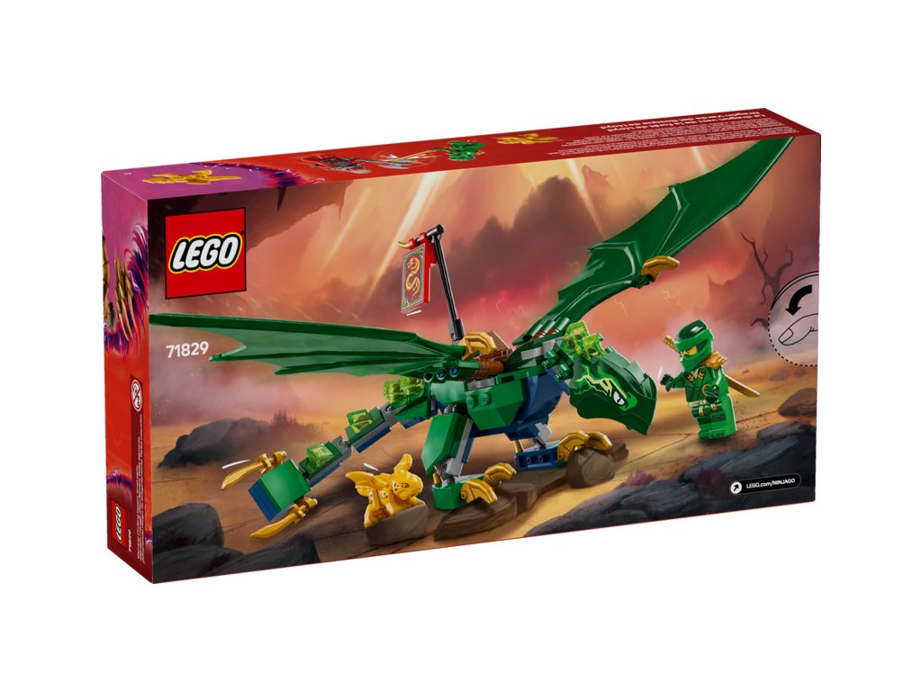 Kluci a holky od 6 let se se stavebnicí Lloydův zelený lesní drak (71829) vznesou do oblak a připomenou si napínavé letecké scény z 3. řady televizního seriálu NINJAGO® Dračí povstání. Součástí je impozantní drak s pohyblivým ocasem, krkem, nohama, velkými křídly a rukama, a navíc sedlo na jeho hřbetu, na které lze usadit minifigurku.